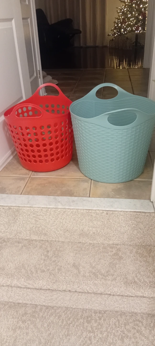 Selling two plastic laundry baskets! One is a vibrant red and the other is a calming blue. They're both in great shape and ready to help with your laundry needs