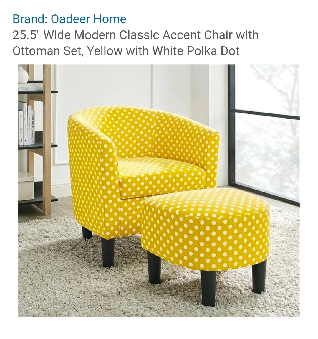 Selling a cute Oadeer Home accent chair and ottoman set! It's 25.5" wide and features a modern classic design. The yellow colour with white polka dots adds a fun touch to any room