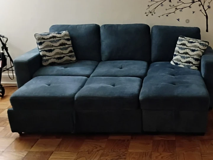 Selling a comfy blue convertible sectional sofa! It's in good condition and ready for a new home. Perfect for lounging and relaxing after a long day. It features a pull-out bed and storage chaise for extra convenience. Pillows included!
