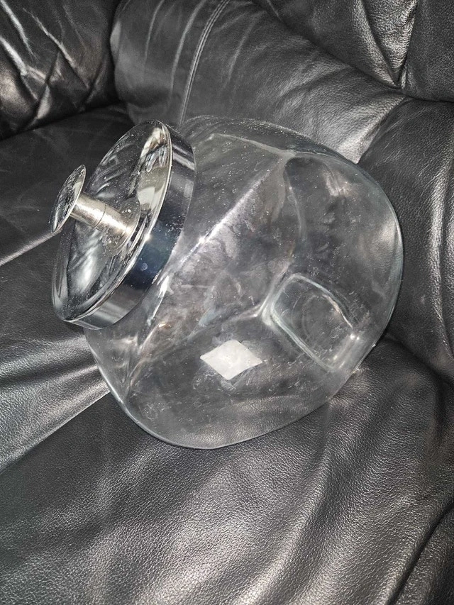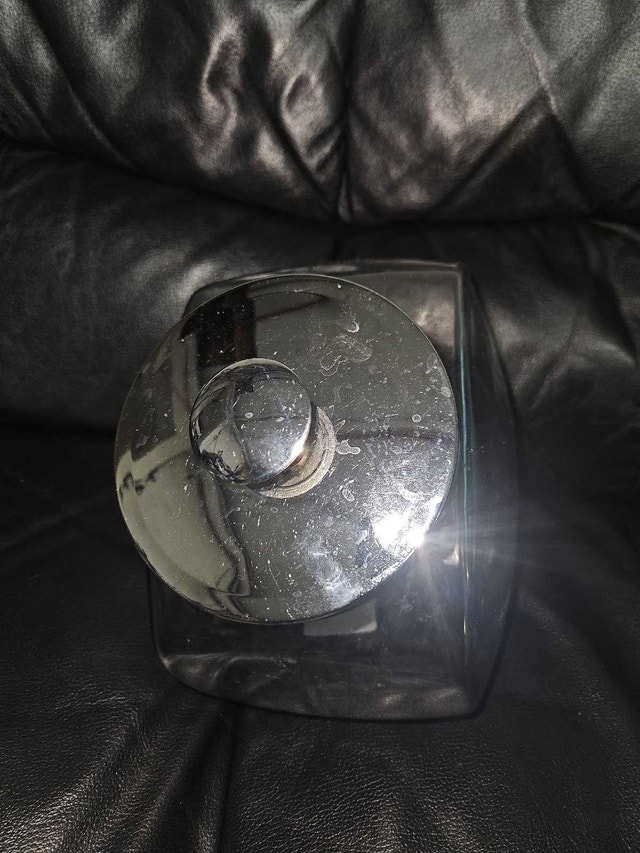 Get organized with these four large glass jars, each featuring a sleek chrome lid! These jars are in used condition, showing some signs of wear. They're perfect for storing everything from pantry staples to craft supplies, adding a touch of vintage charm to any space. Similar jars sell for around $15-$30 each. Get all four for $15!