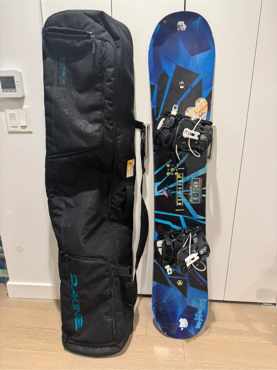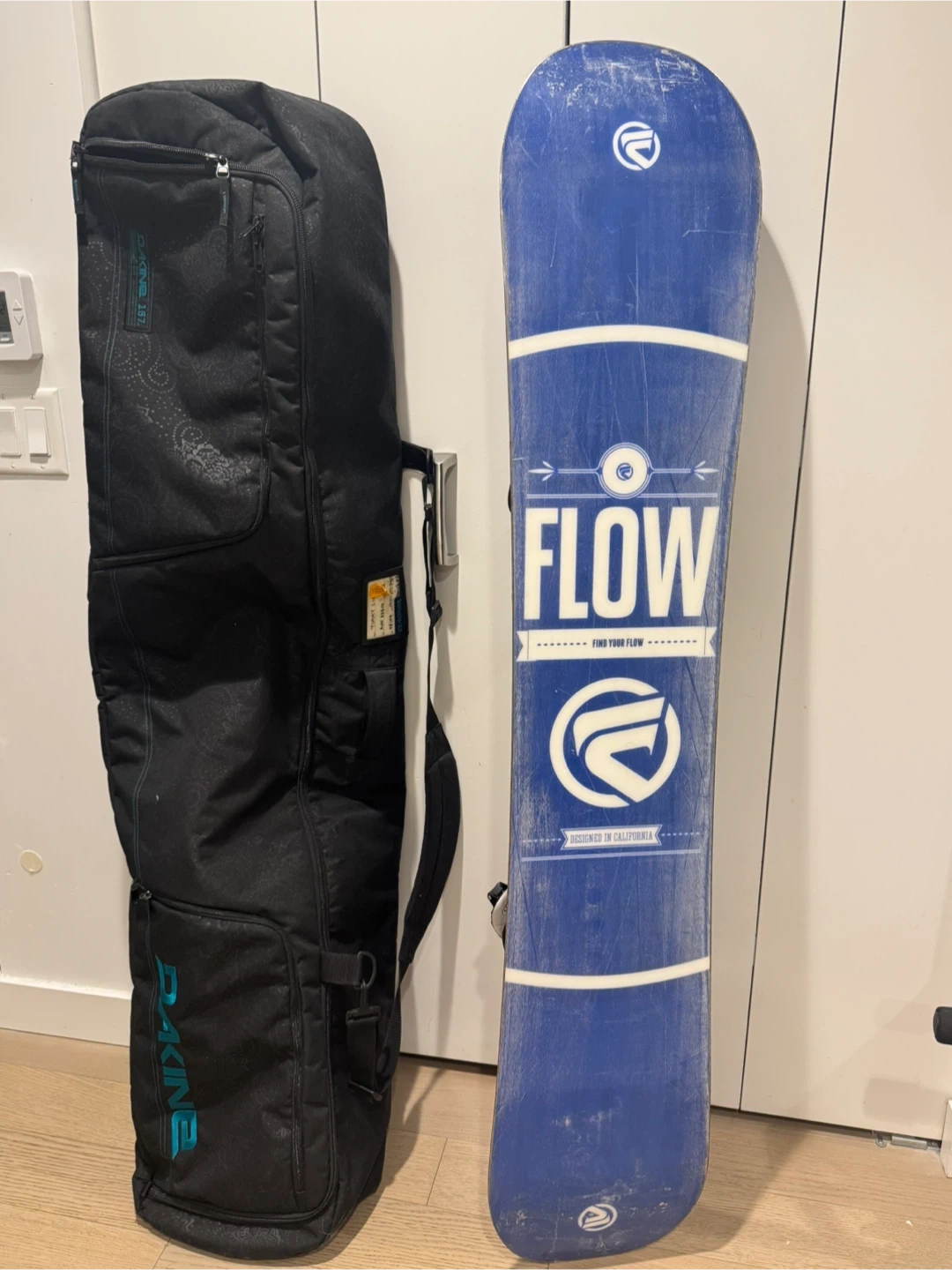 Selling a Flow snowboard, size 151cm. It comes with bindings and a Dakine snowboard bag. The snowboard features a blue and black design. Ready for the slopes!
