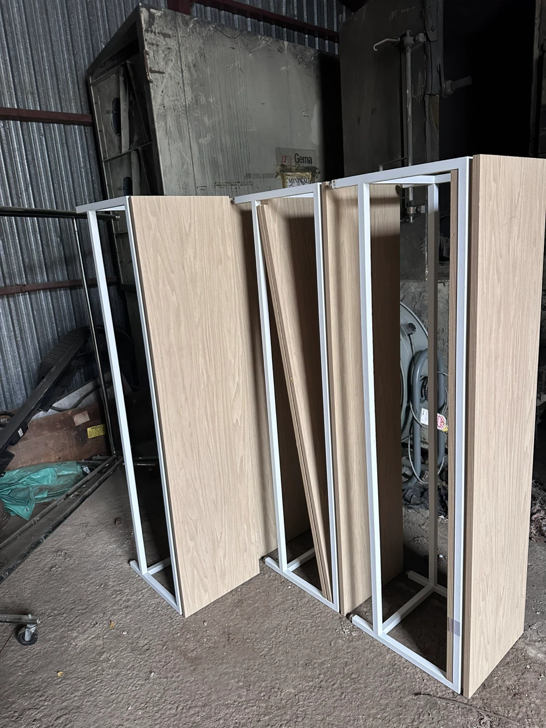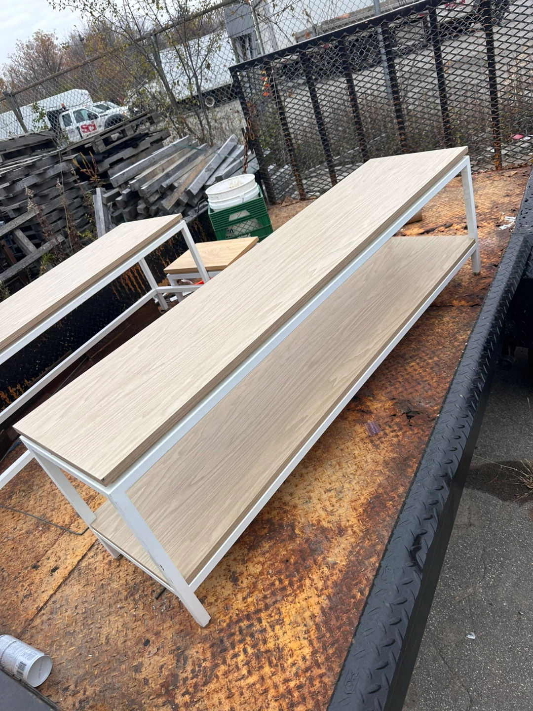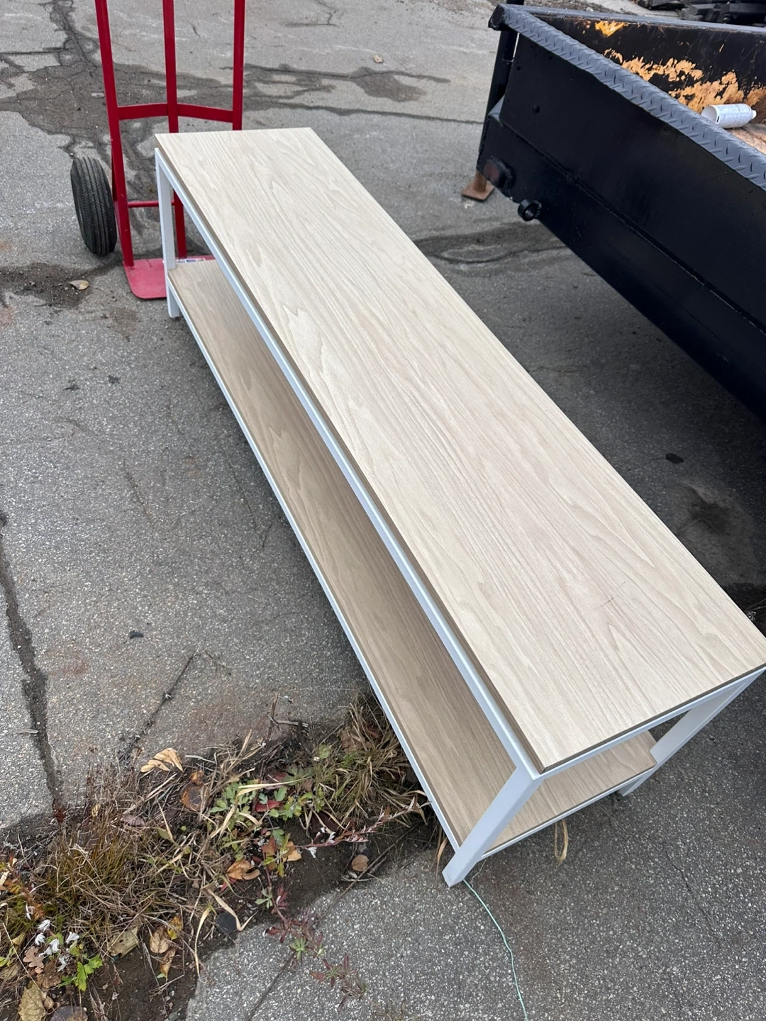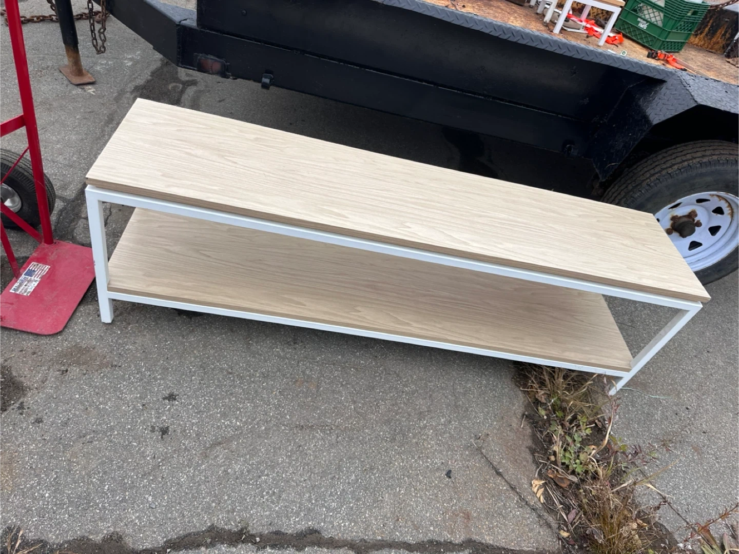 Selling a shelf with a light wood top and a white metal frame. It has two levels for storage or display. The shelf is in good condition and ready for a new home!