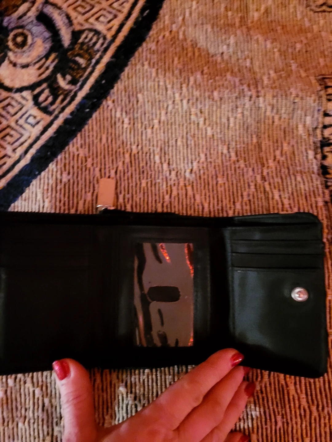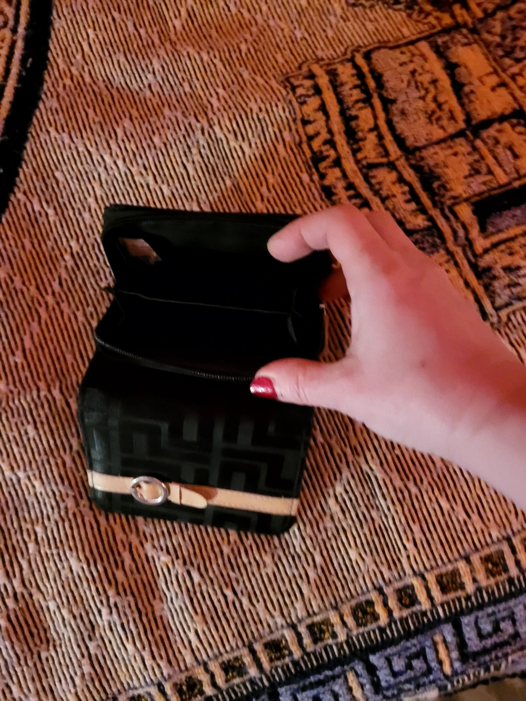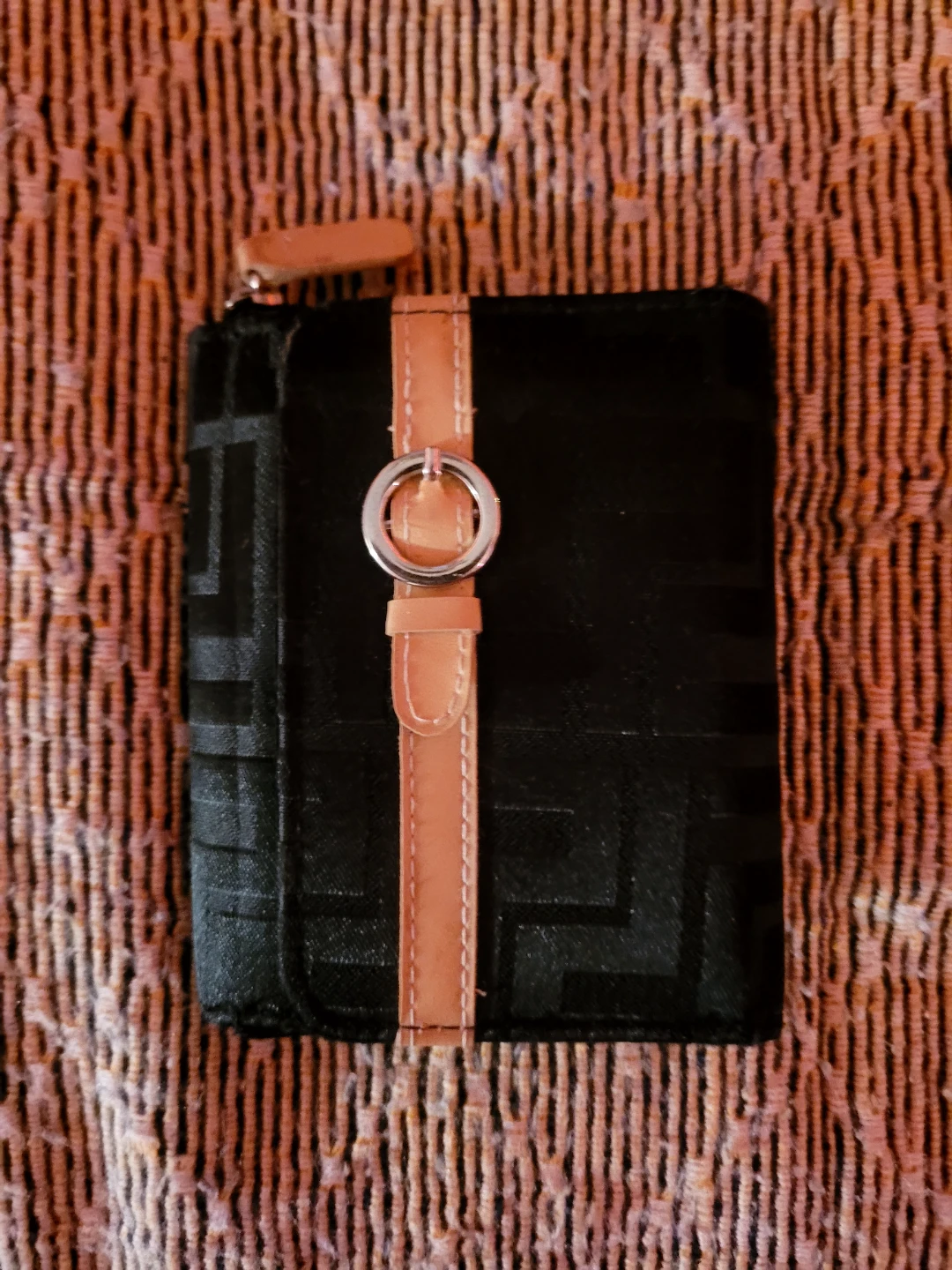 Selling a stylish Fendi wallet in black. It features a unique design with a tan strap and silver buckle. The wallet has multiple compartments for cards and cash. It's in great condition and ready for a new owner!