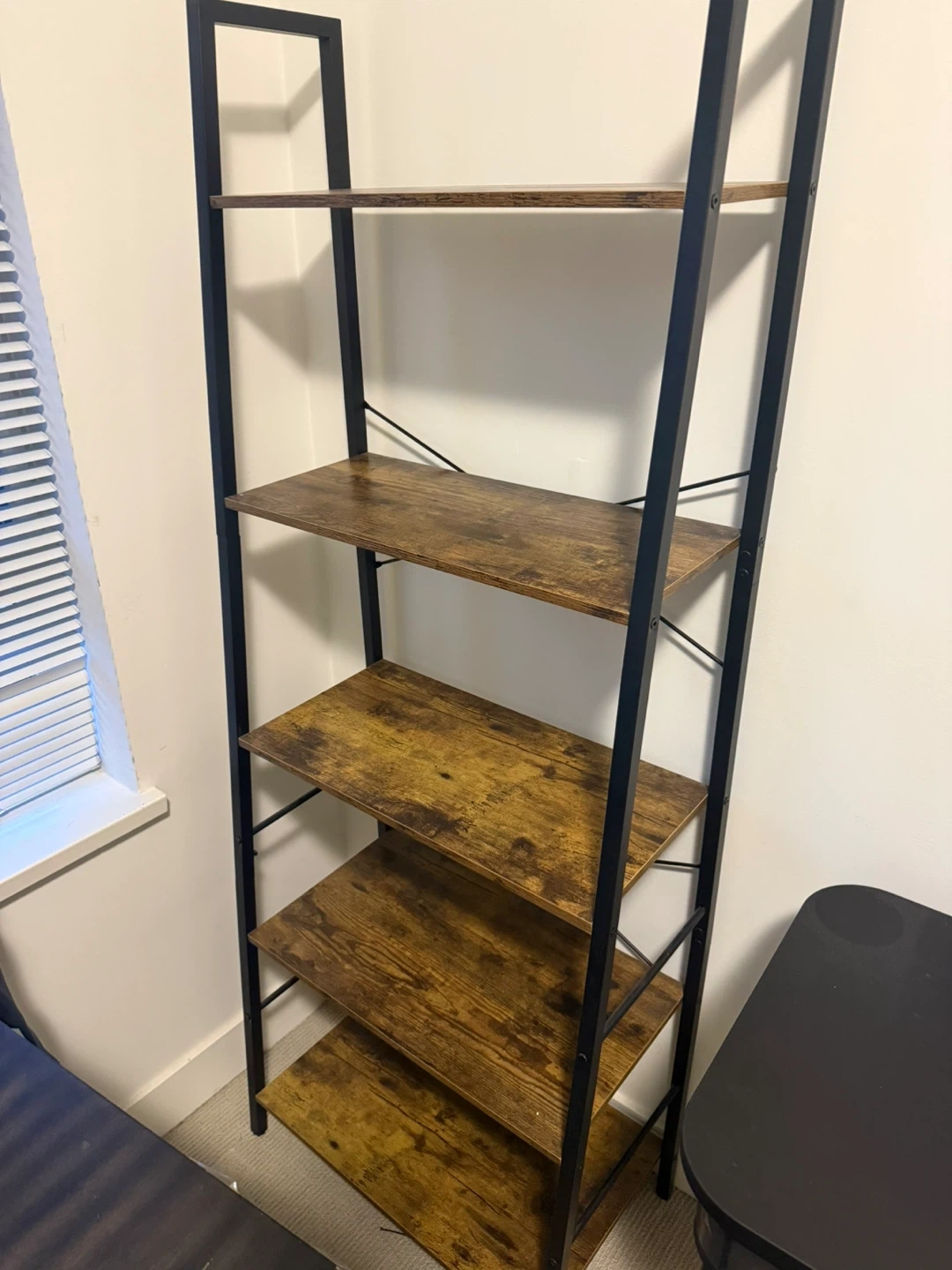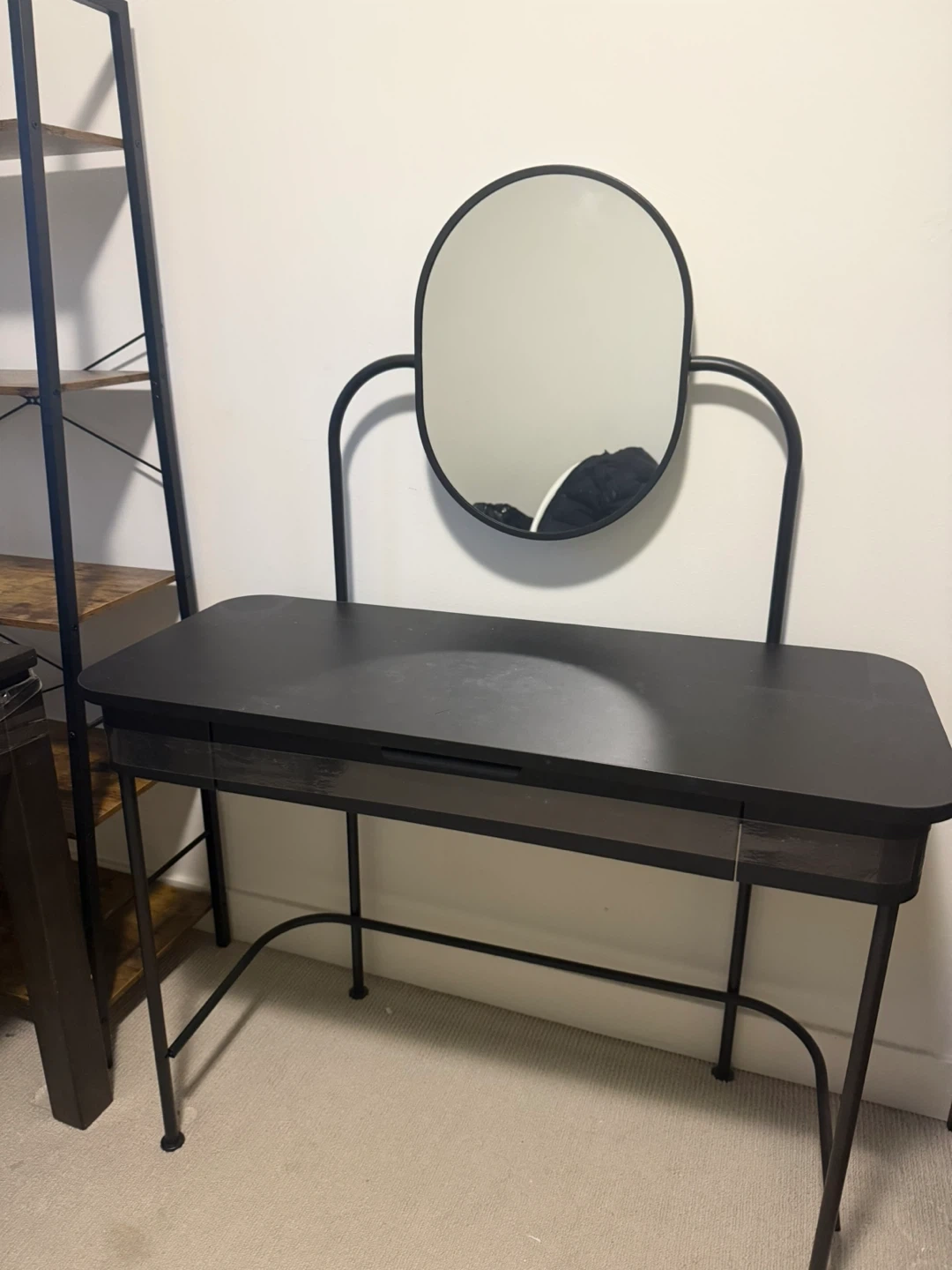 Selling a ladder shelf and vanity table set! The set includes two ladder shelves with a rustic wood finish and a black metal frame. Also included is a black vanity table with a mirror.