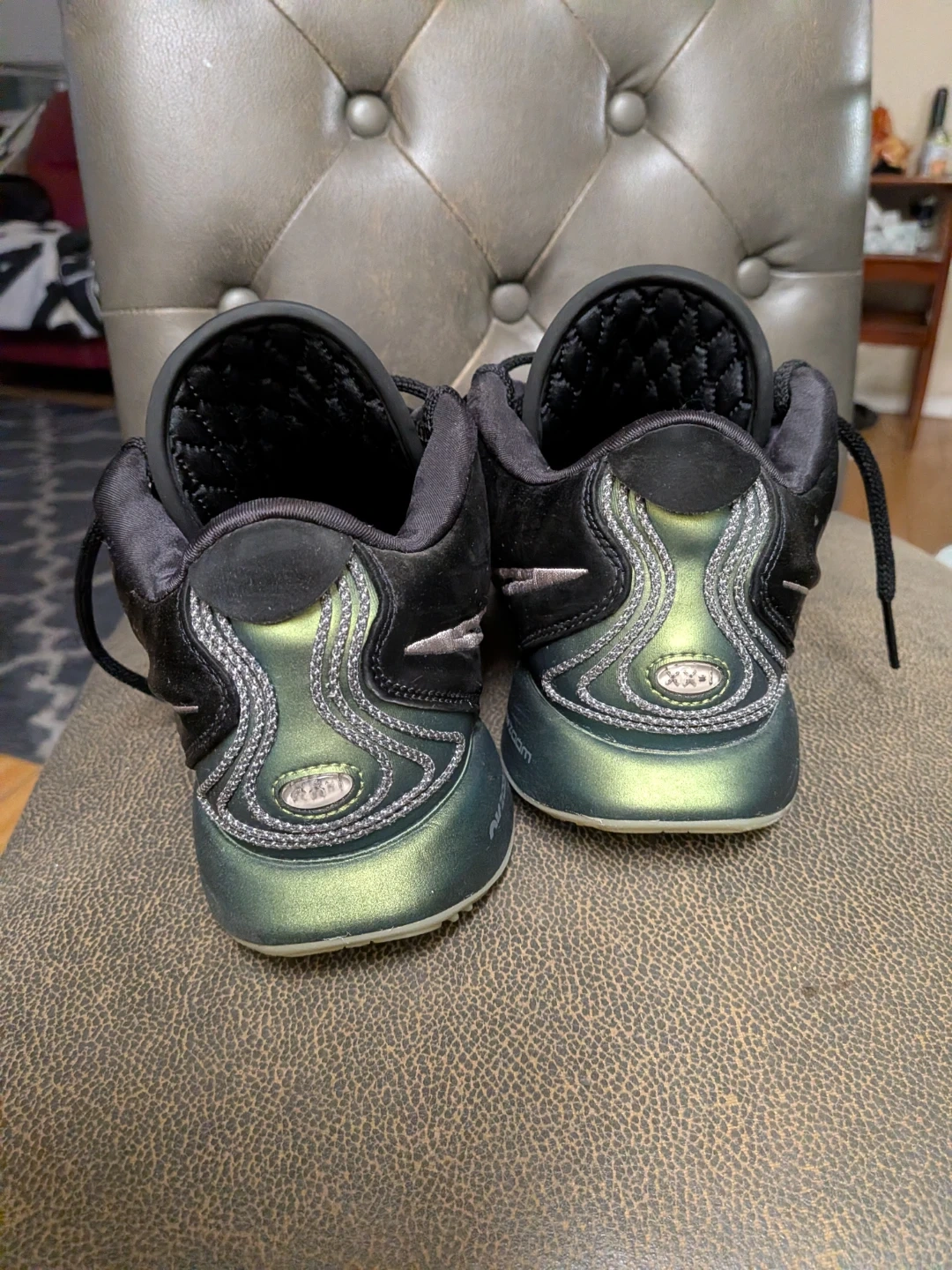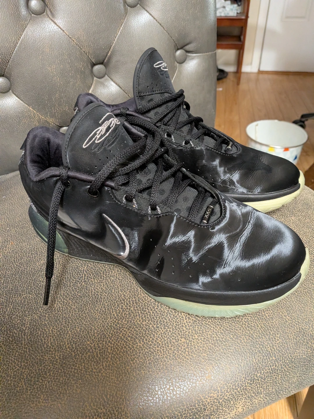 Selling a pair of Nike Zoom LeBron 21 sneakers in black. They show some signs of wear but are still in good condition for everyday use. These sneakers are stylish and comfortable, perfect for hitting the court or just walking around town!