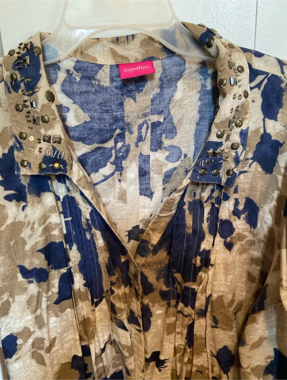 This is a Lizathan floral shirt in size 18, perfect for adding a touch of bohemian chic to your wardrobe. The shirt features a unique floral pattern in shades of blue and tan, with stylish studded detailing around the collar. Made from 100% Viscose. As this is a previously owned item, it is in good condition , which only adds to its vintage charm.