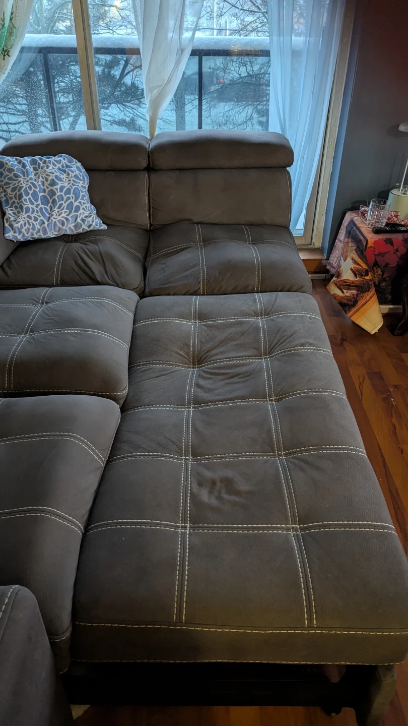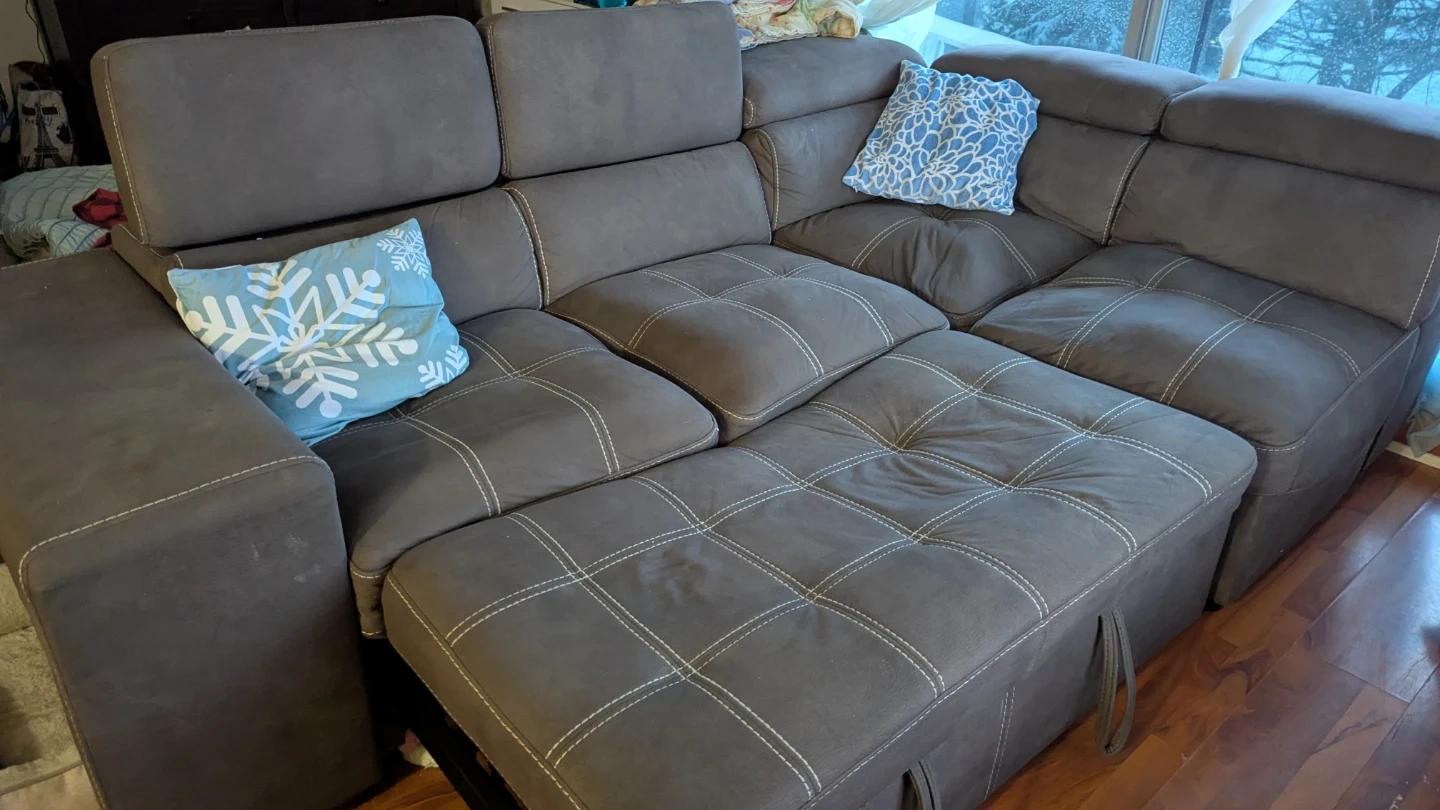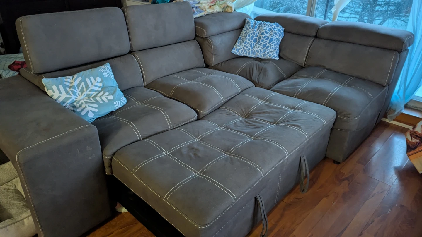 Selling a comfy grey sectional sofa! It features a convenient pull-out bed, perfect for guests or cozy movie nights. It's in good condition and ready for a new home!