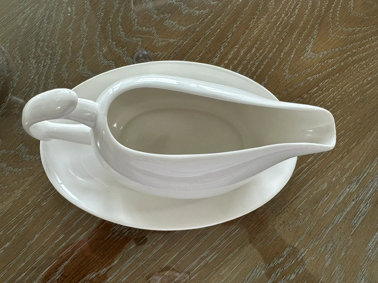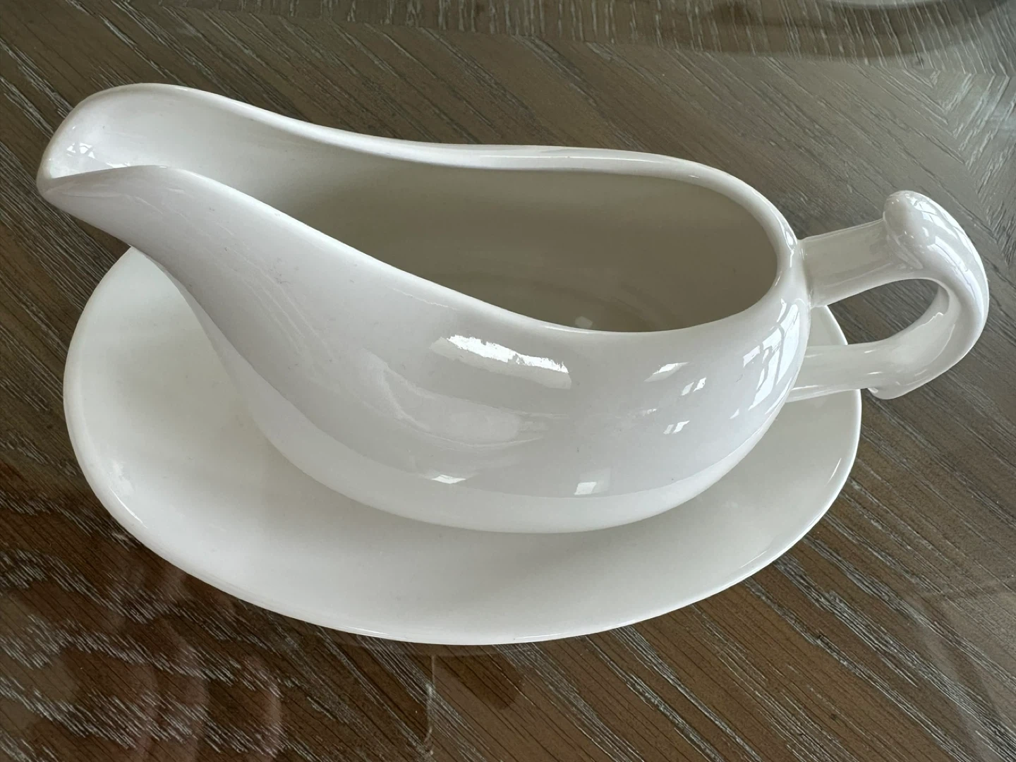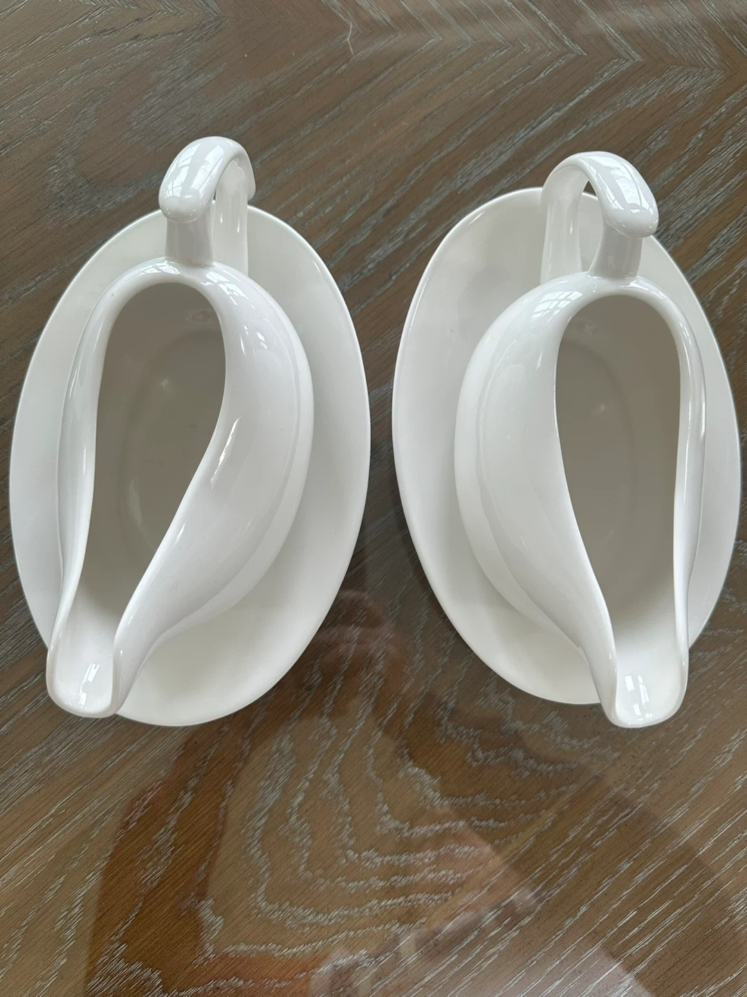 Selling a set of two white gravy boats with attached saucers from Tanna. They're in excellent condition and ready to add a touch of elegance to your table setting. Dishwasher, microwave, oven and safe