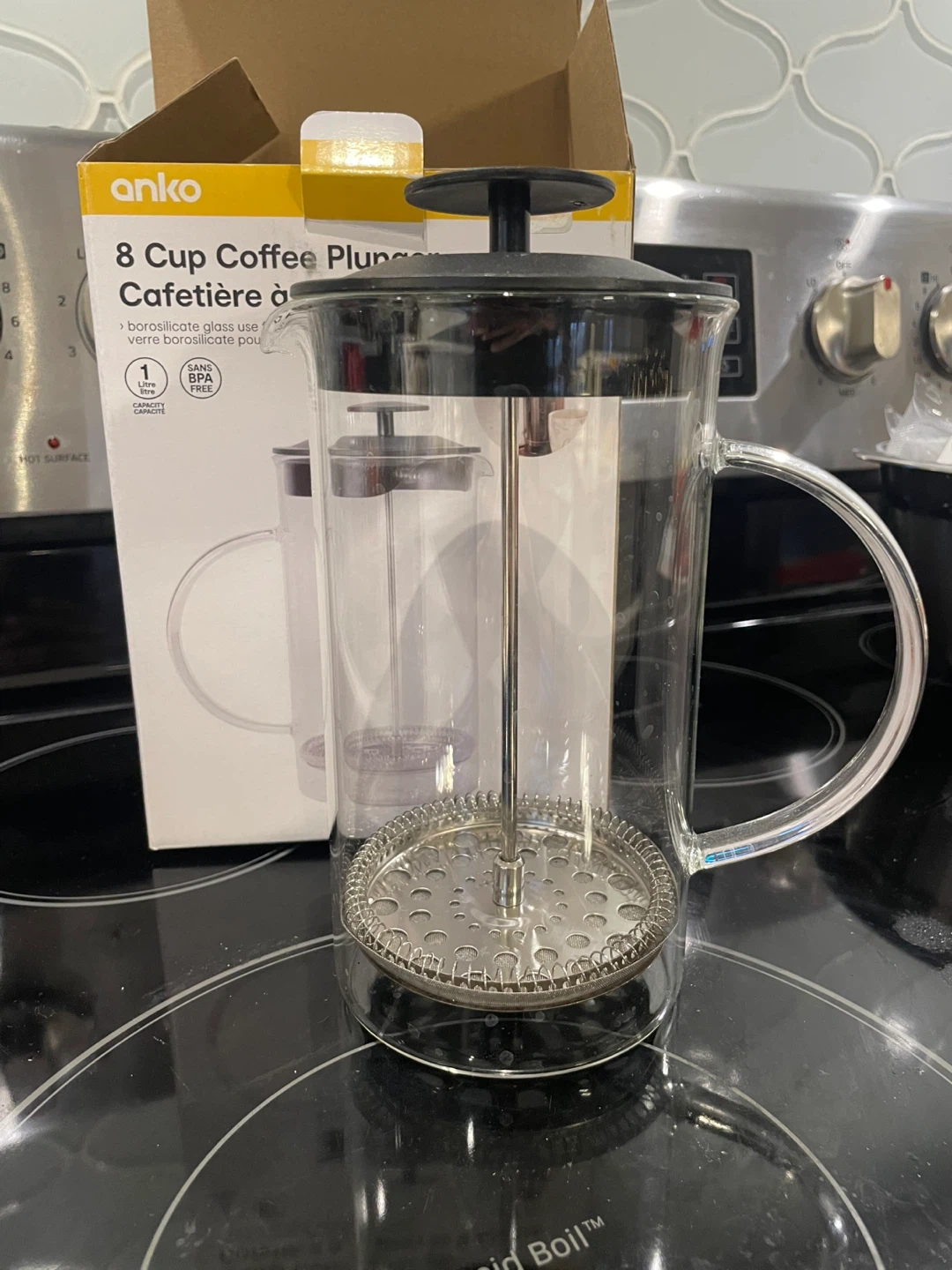 I'm selling an Anko 8 Cup Coffee Plunger! It's made of borosilicate glass, perfect for hot beverages. The capacity is 1 litre. It's BPA free and ready for your next coffee or tea