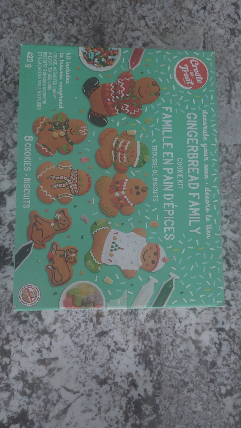 Selling a Create A Treat Gingerbread Family Cookie Kit! It includes cookie assorted candy and easy-to-use icing. The kit contains 8 cookies/biscuits and weighs 422g. End was opened but still sealed inside.