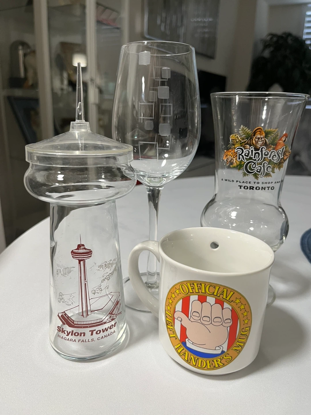 Selling a few souvenir glasses! There's a Skylon Tower glass from Niagara Falls, Canada, and a Rainforest Cafe glass from Toronto. Also included is an "Official Left Hander's Mug"!