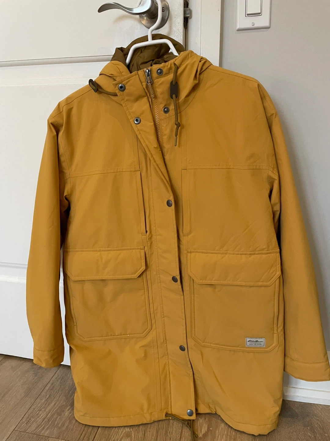 Selling a stylish Eddie Bauer parka in a lovely mustard yellow colour. It's perfect for the cooler Canadian weather! This parka features a hood and several pockets for convenience. It's in great condition and ready for a new owner!