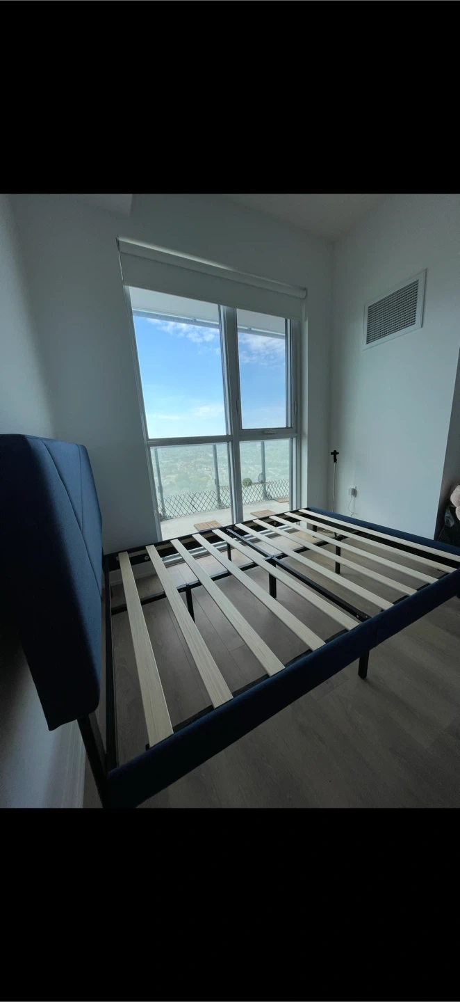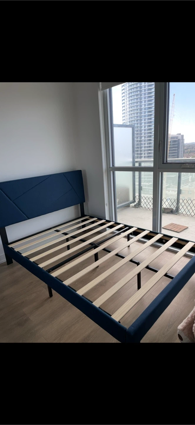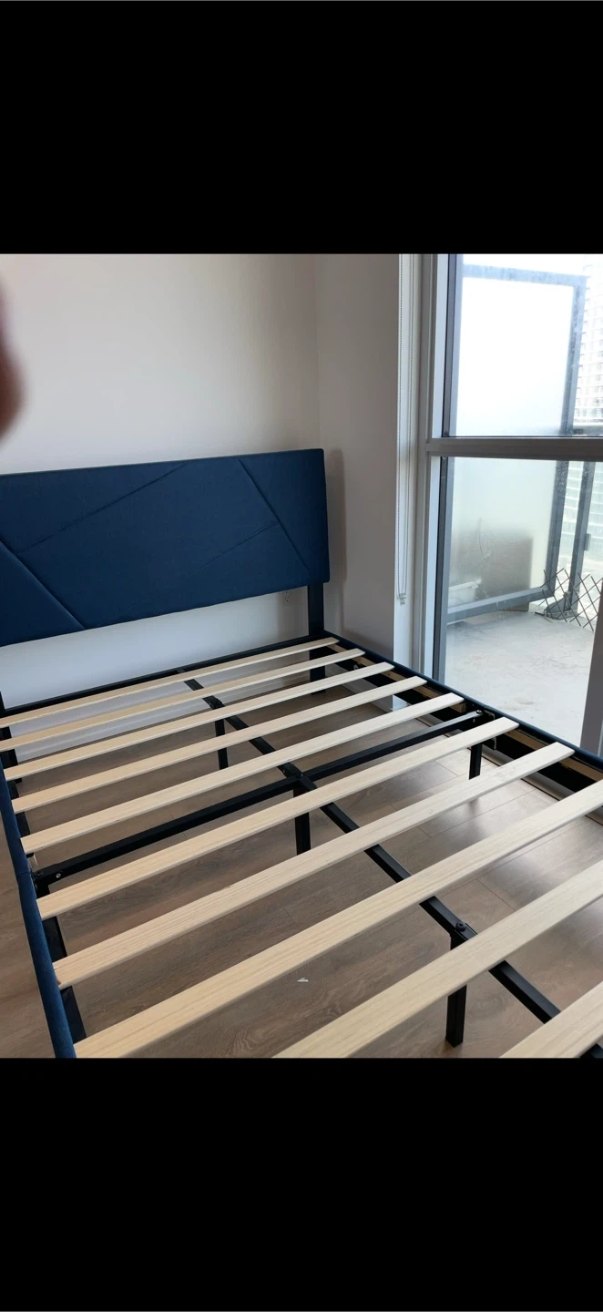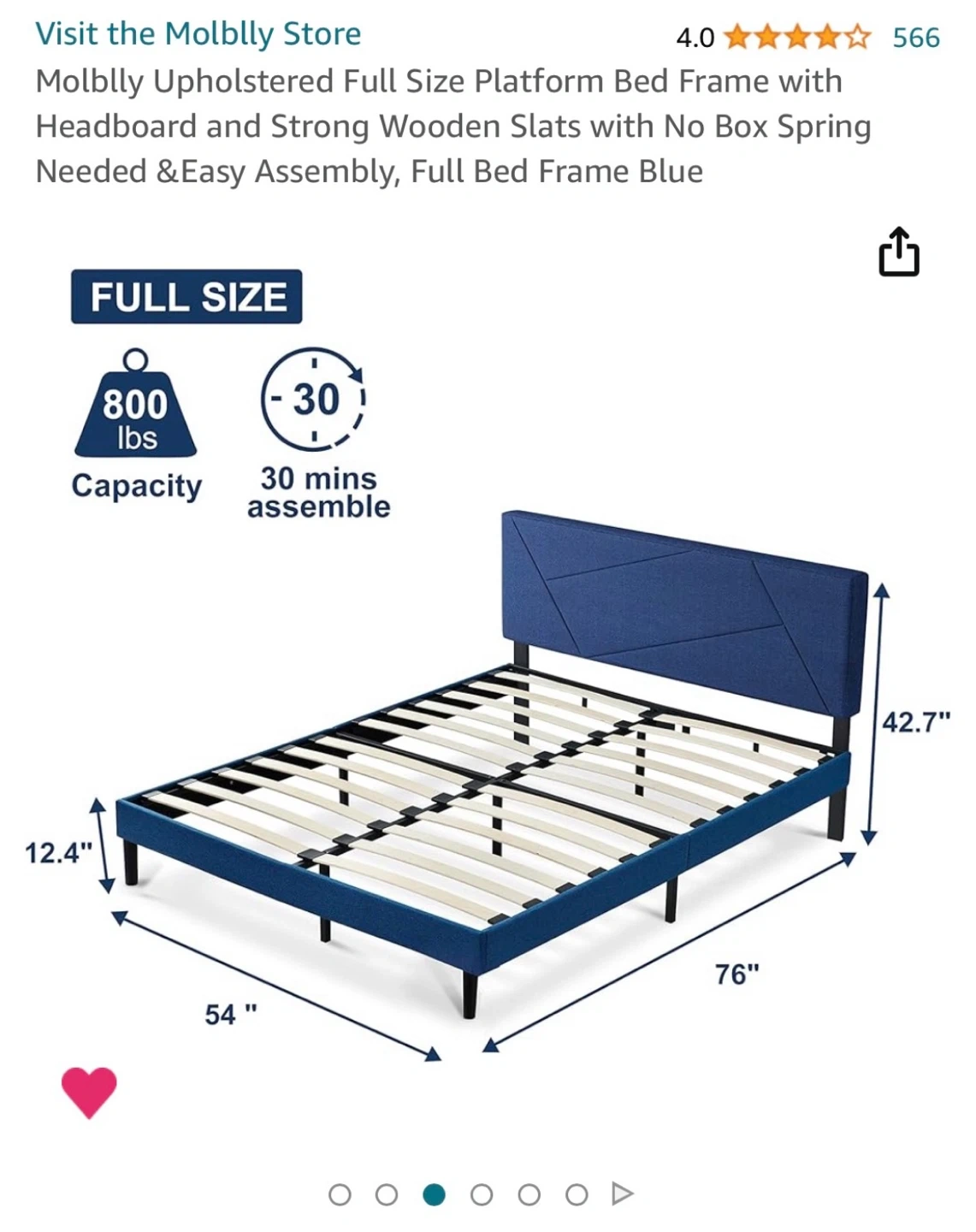 Selling a Molblly full-size upholstered bed frame in blue. It features a headboard and strong wooden slats, so no box spring is needed. It's designed for easy assembly, too! The frame can hold up to 800 lbs. Dimensions are 42.7" height, 54" width and 76" length