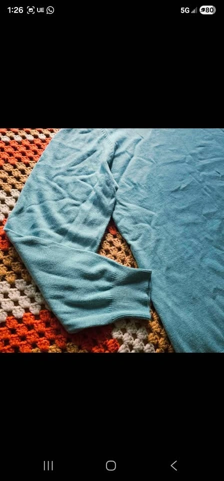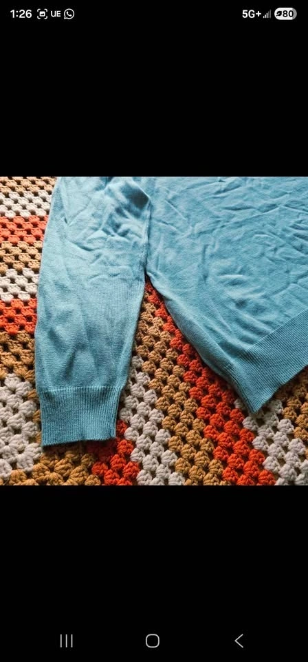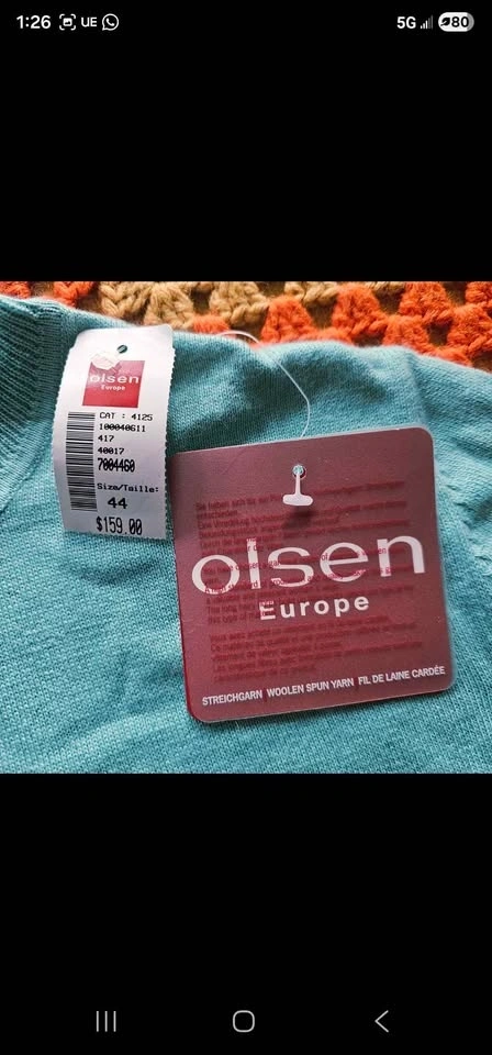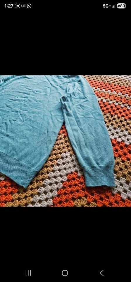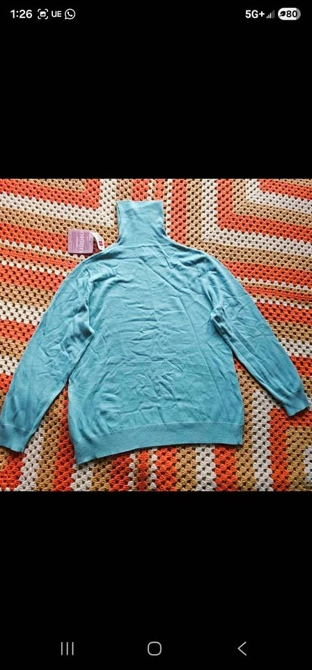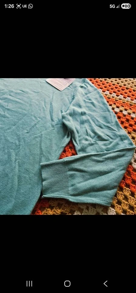 Pit to pit measures about 21", pit to sleeve hem measures about 17", and shoulder to bottom hem measures about 24". Sweater is a size US 12 or EU 44 and is in new condition.