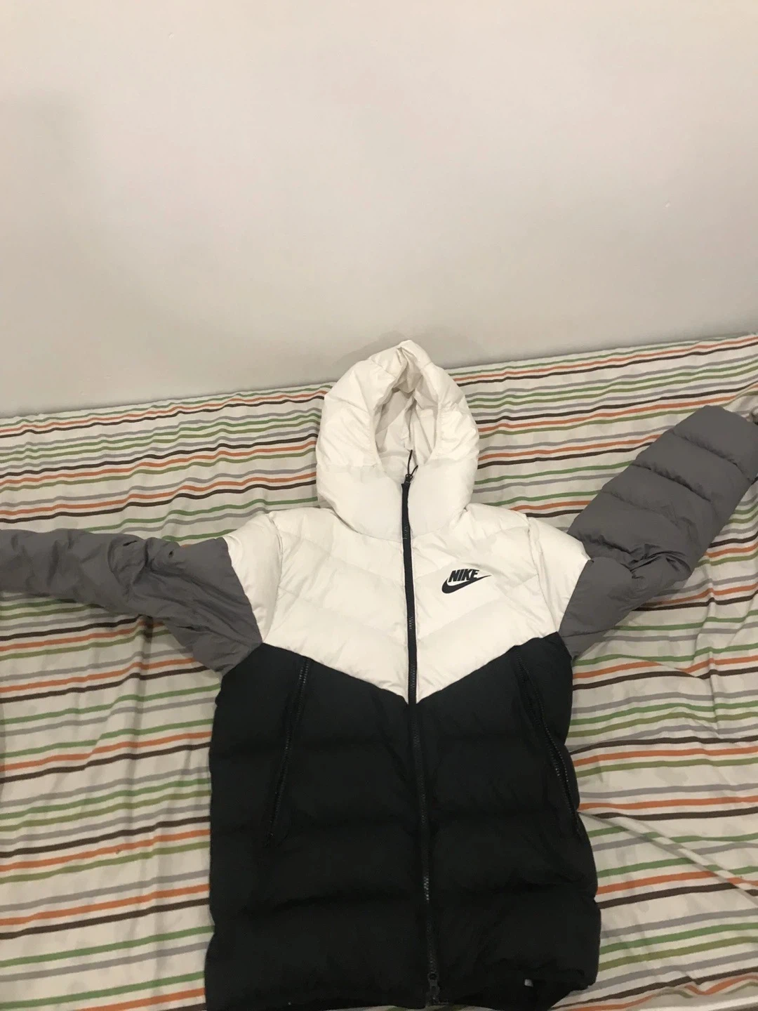 Second, a stylish Nike puffer jacket in a cool colour block design. Perfect for staying warm and looking good!