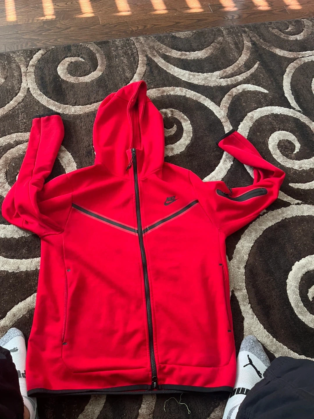 First, a vibrant red Nike Tech Fleece hoodie. It's super comfortable and in great shape.