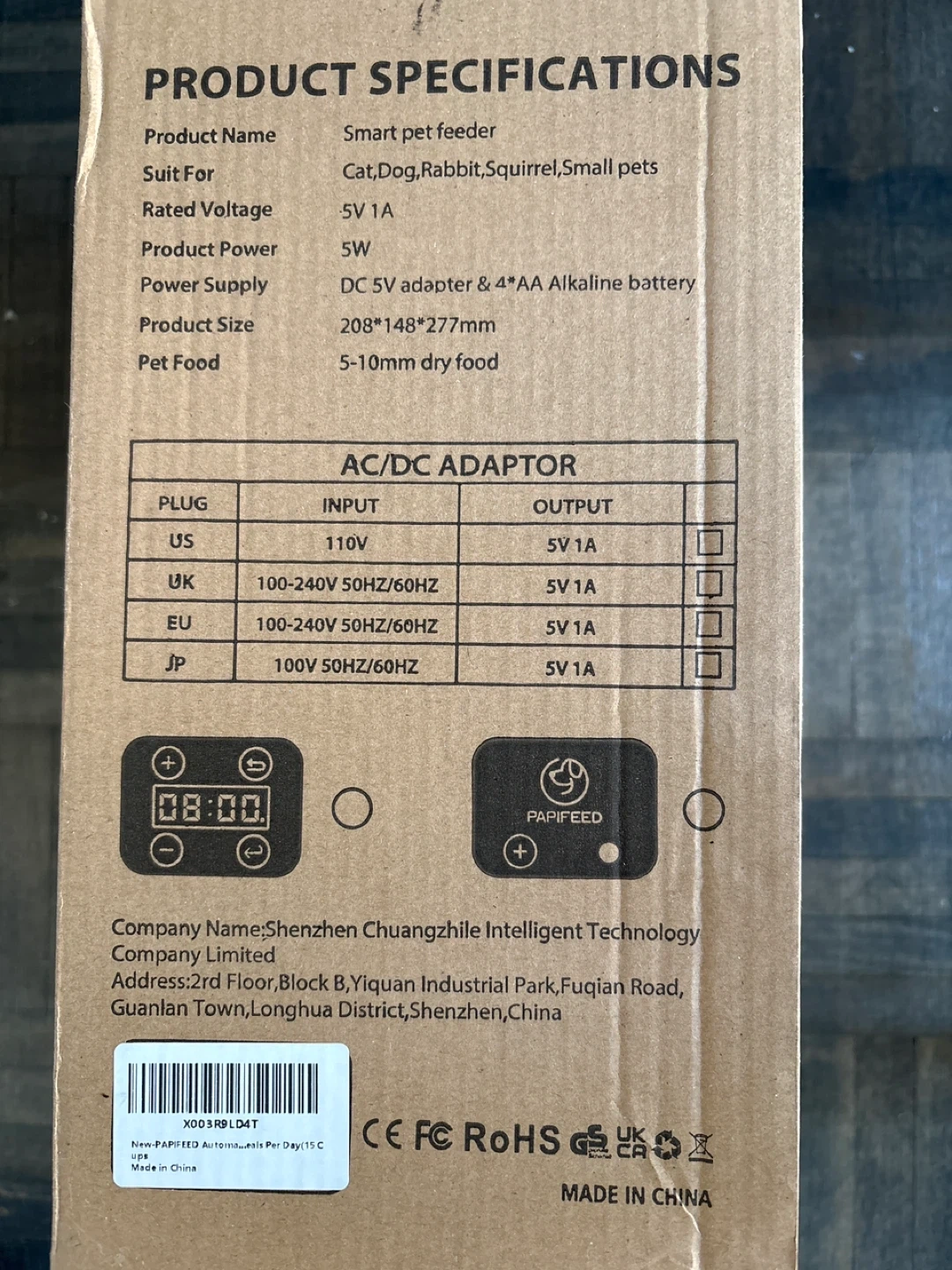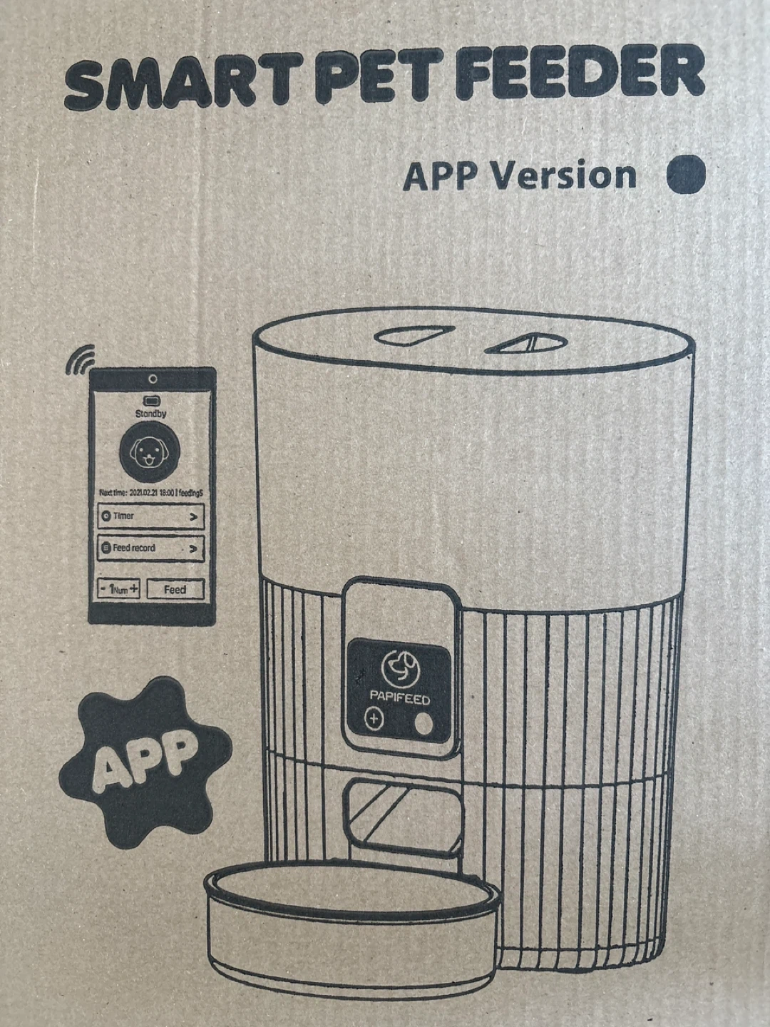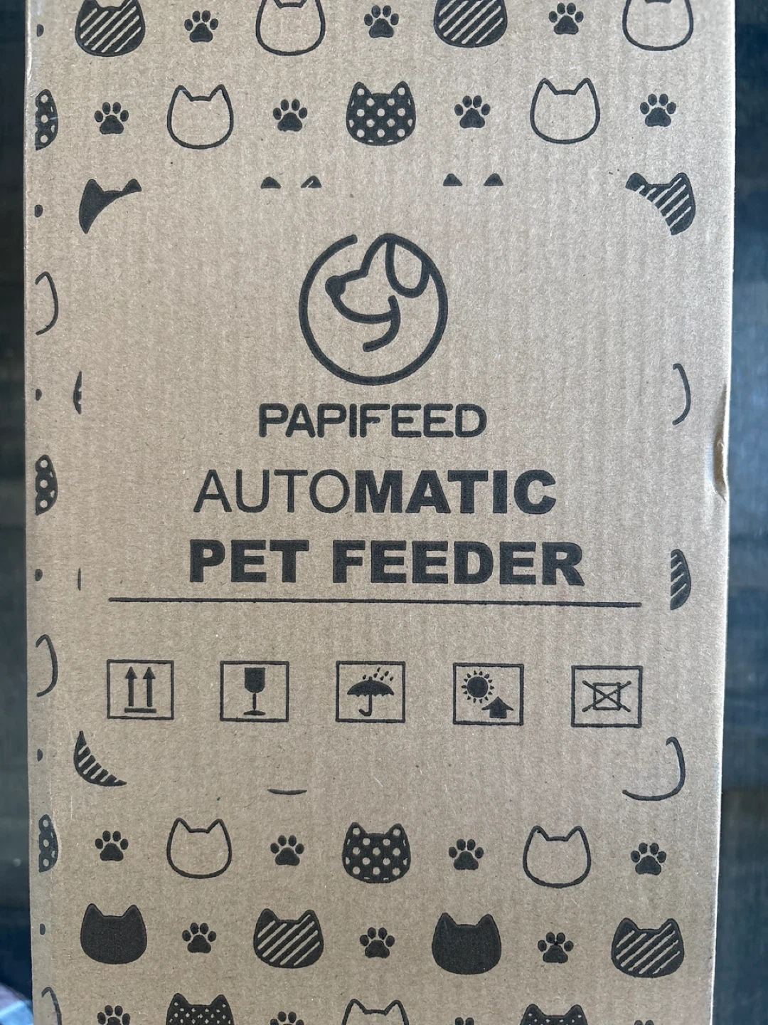 Selling a Papifeed automatic smart pet feeder. It's designed for cats, dogs, rabbits, squirrels, and small pets. The feeder uses a DC 5V adapter and 4*AA alkaline batteries for power. It can dispense pet food that is 5-10mm dry food. The product size is 208*148*277mm. Great for keeping your pet fed on a schedule!