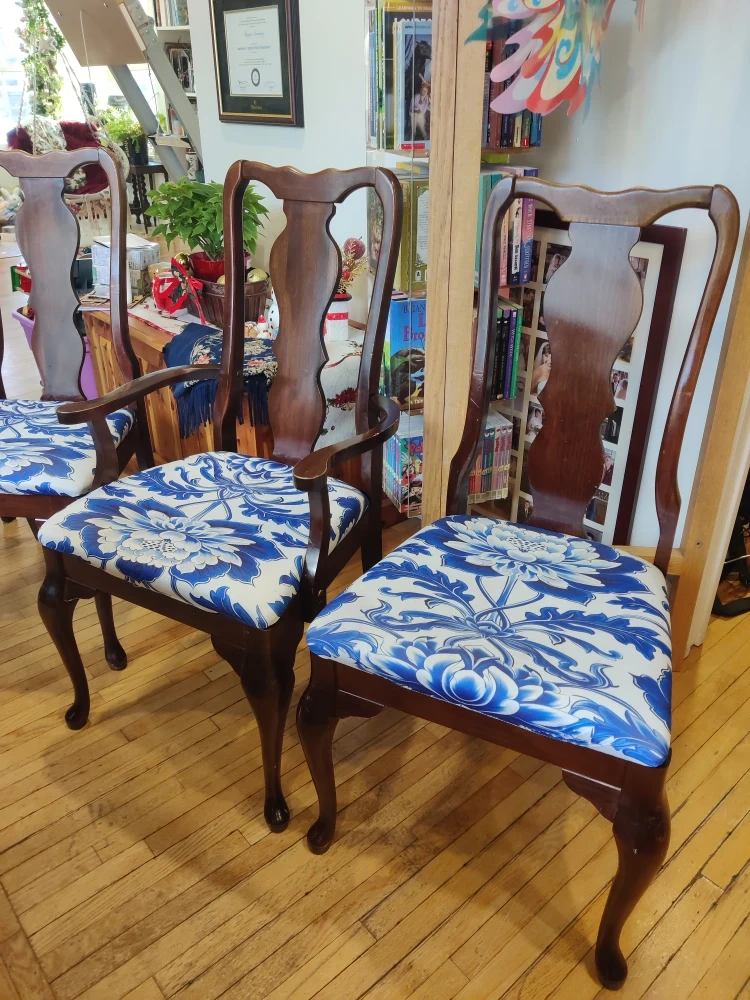 A set of six classic dining room chairs, two with arms. They have some wear, but are sturdy and don't wobble or squeak!