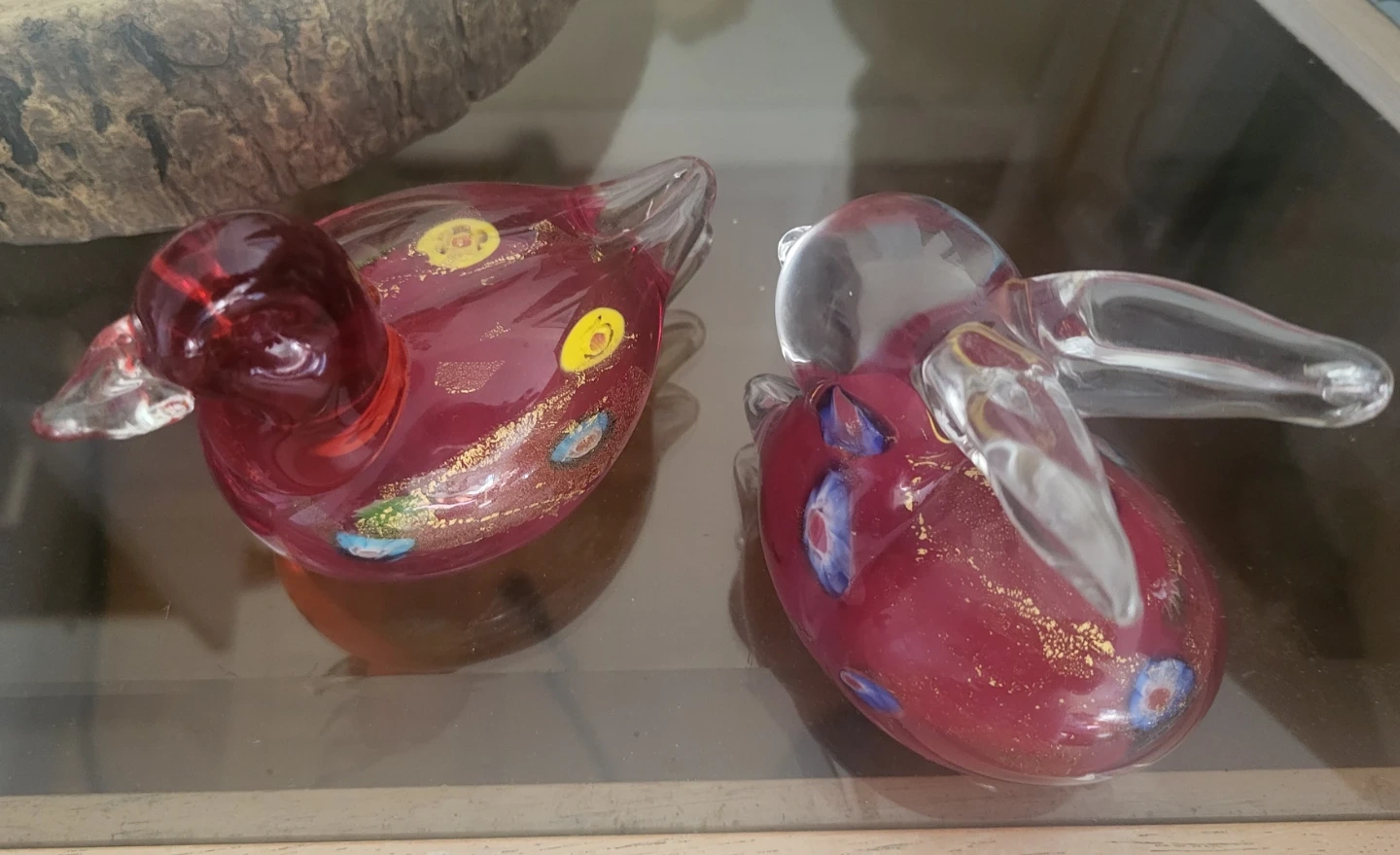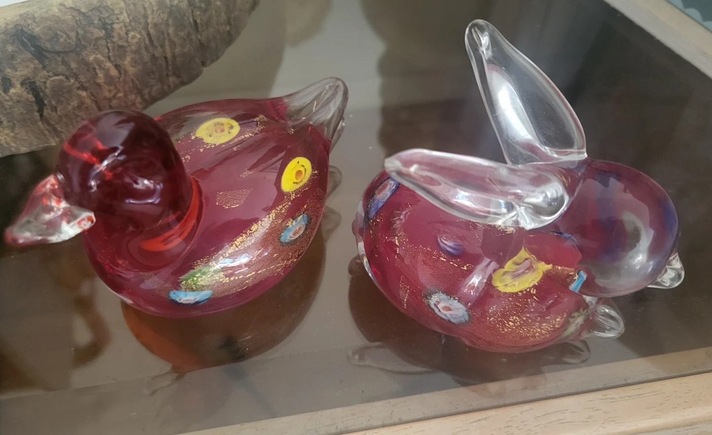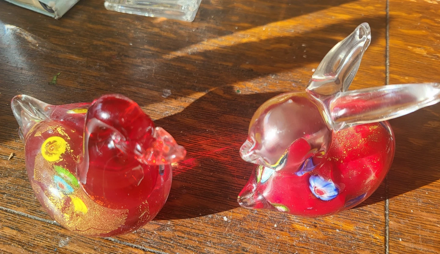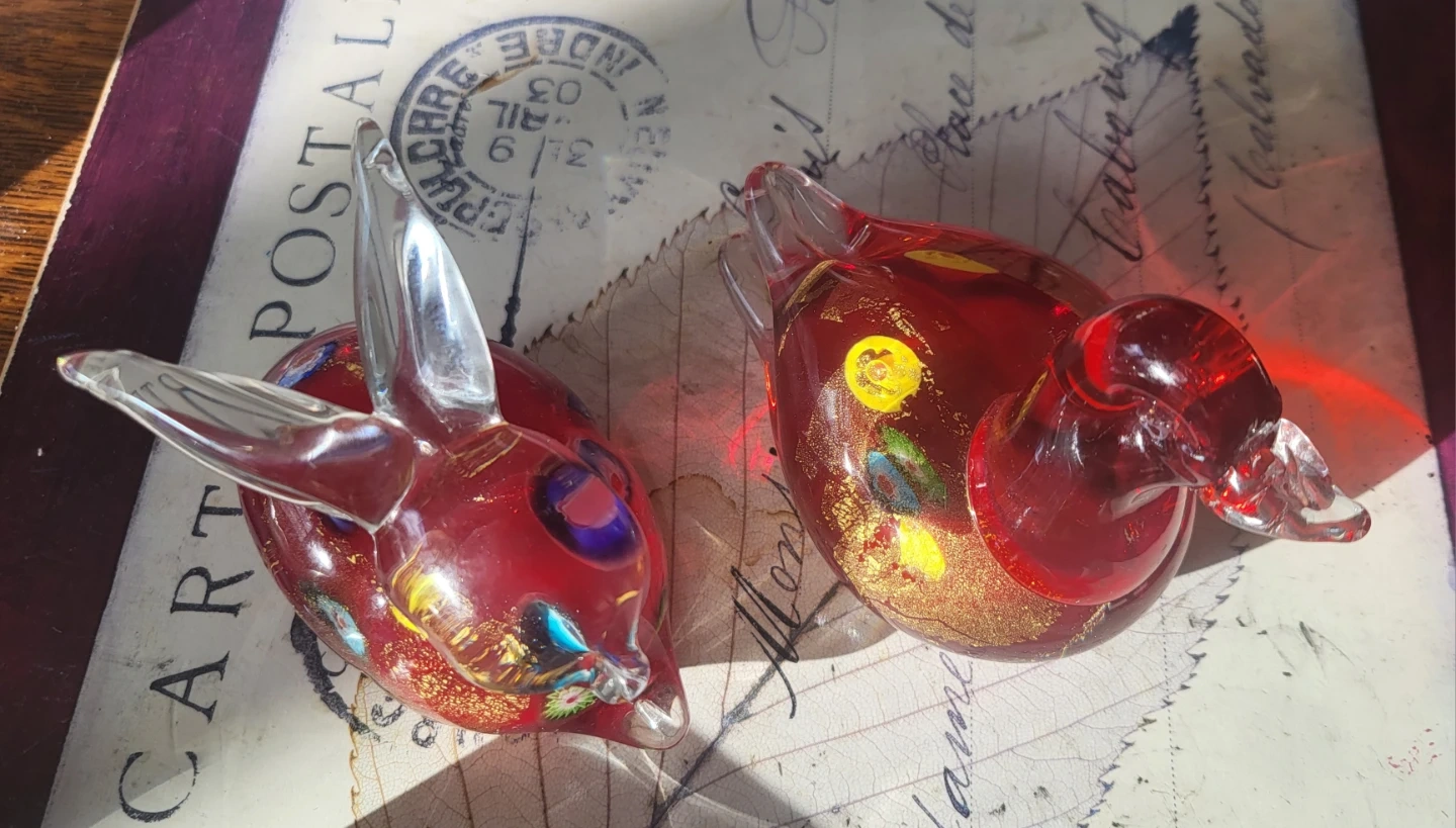 Selling a pair of Murano style glass figurines! One is a duck and the other is a rabbit. They have a lovely red and gold colour with some colourful accents.