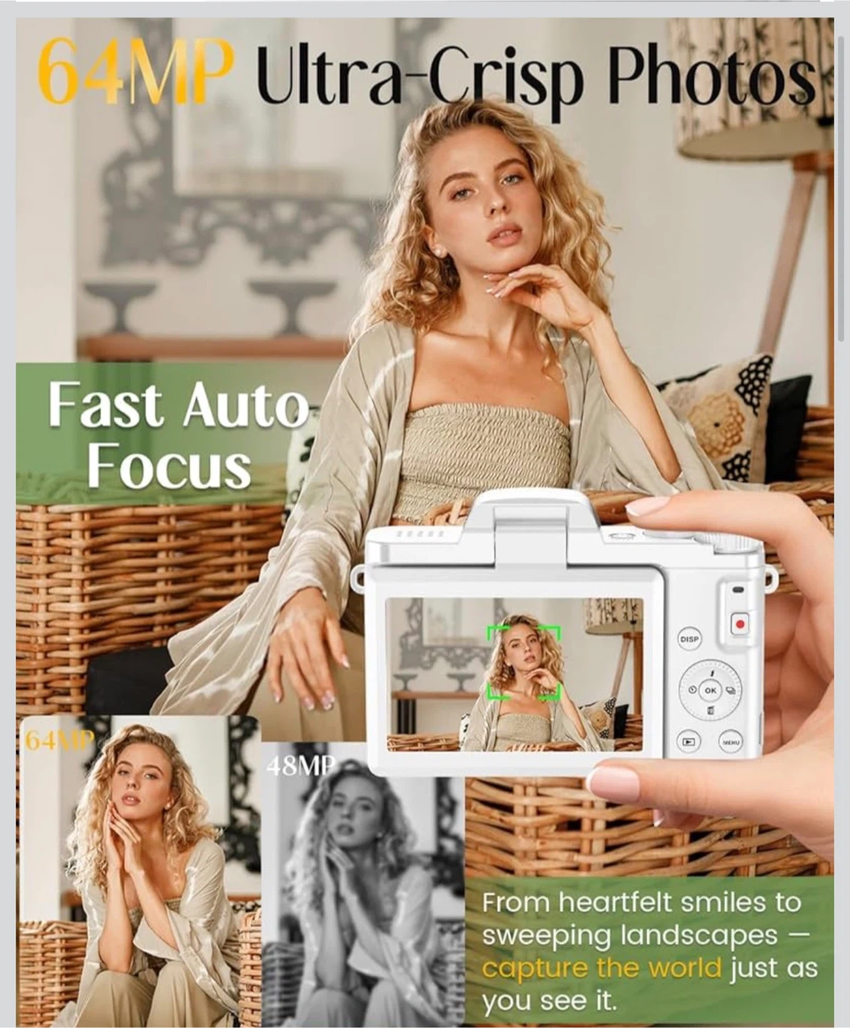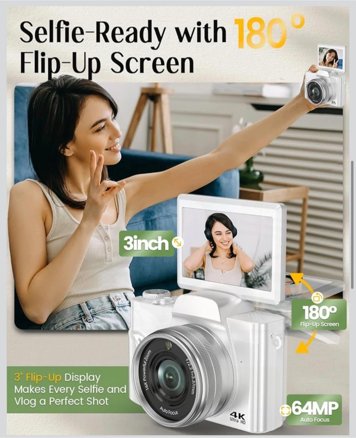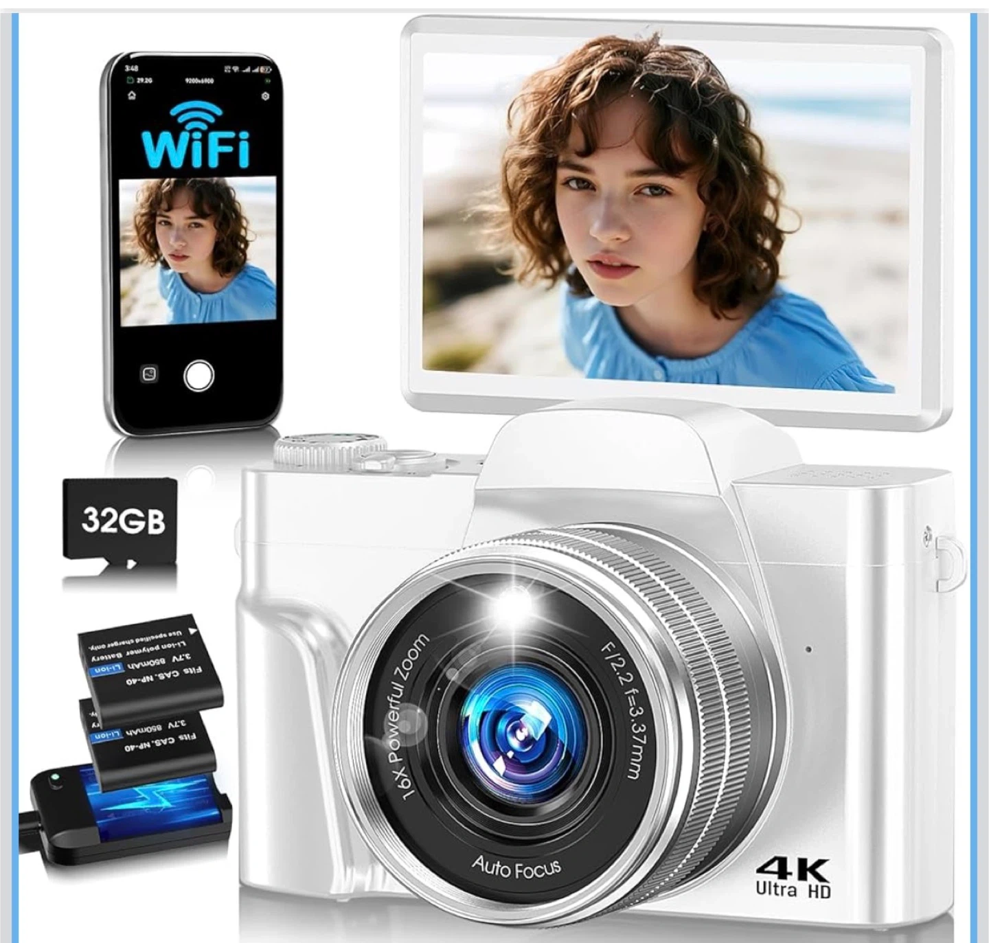 4K Digital Camera for Photography with WiFi,64MP Autofocus Vlogging Camera for YouTube,3'' 180° Flip Screen Compact Travel Camera for Teens with 32GB SD Card,16X Zoom,Anti-Shake,2 Batteries(White)