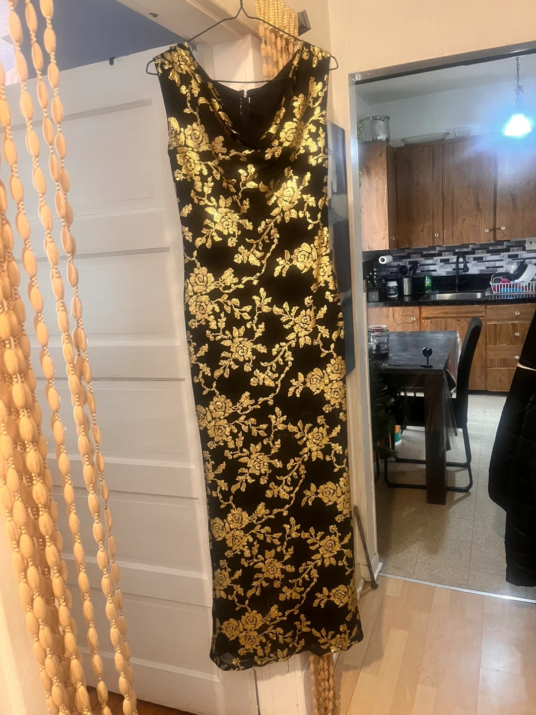 Beautiful black dress with gold floral detailing. It's in great condition and ready for a night out or special occasion! Was only worn once for a black tie event. It hugs your body, and it’s stretchy.