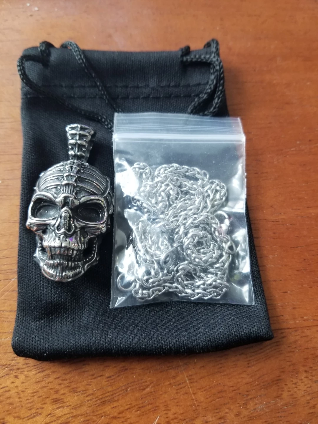 Here's a cool skull pendant necklace! It comes with a chain and a small black pouch. The pendant has a detailed skull design, and the chain is a classic style to match. Brand new