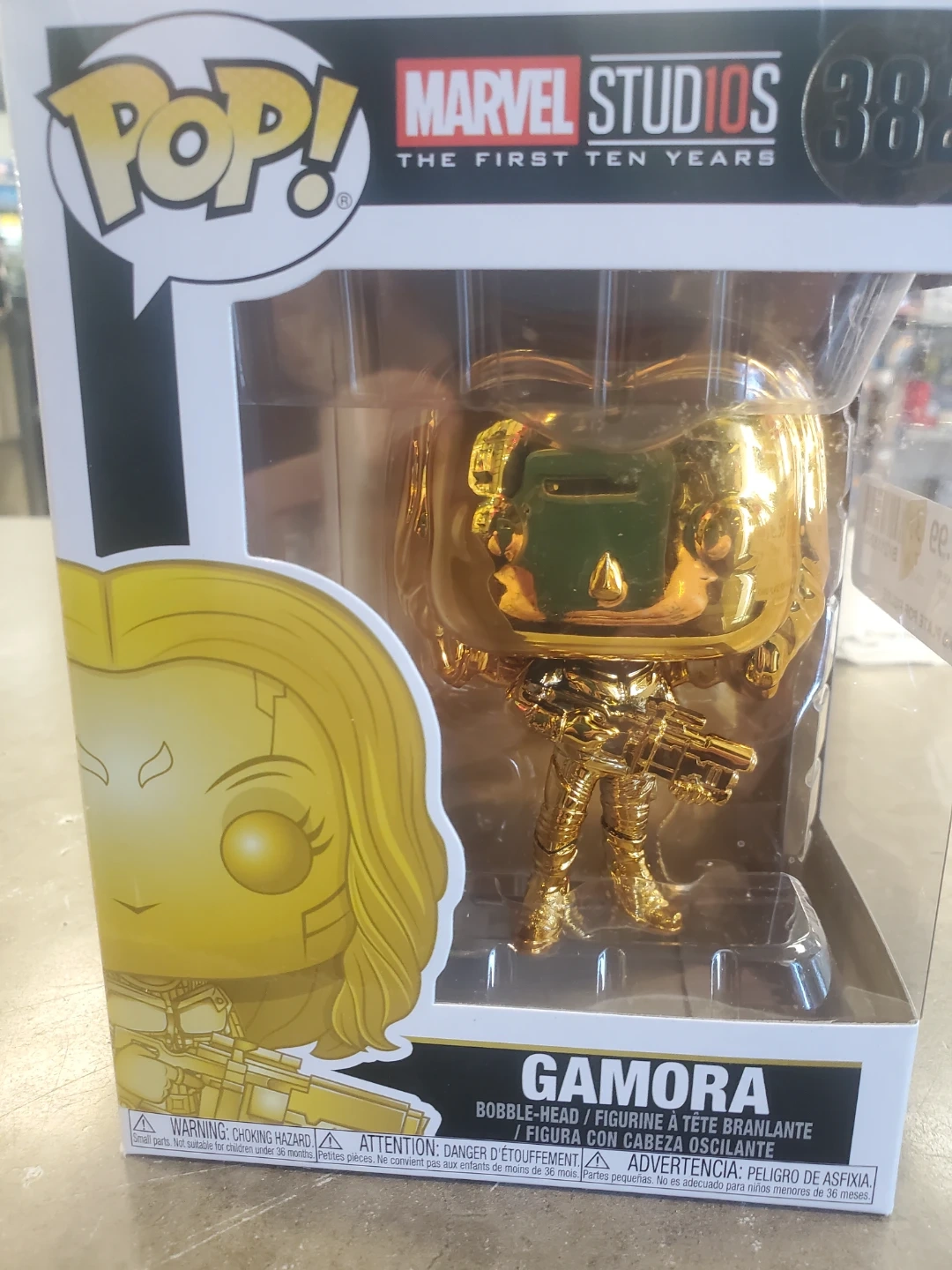 Selling a Funko Pop! figure of Gamora from Marvel Studios' The First Ten Years collection. This is number 385 in the series. It's a bobble-head figure and comes in its original box