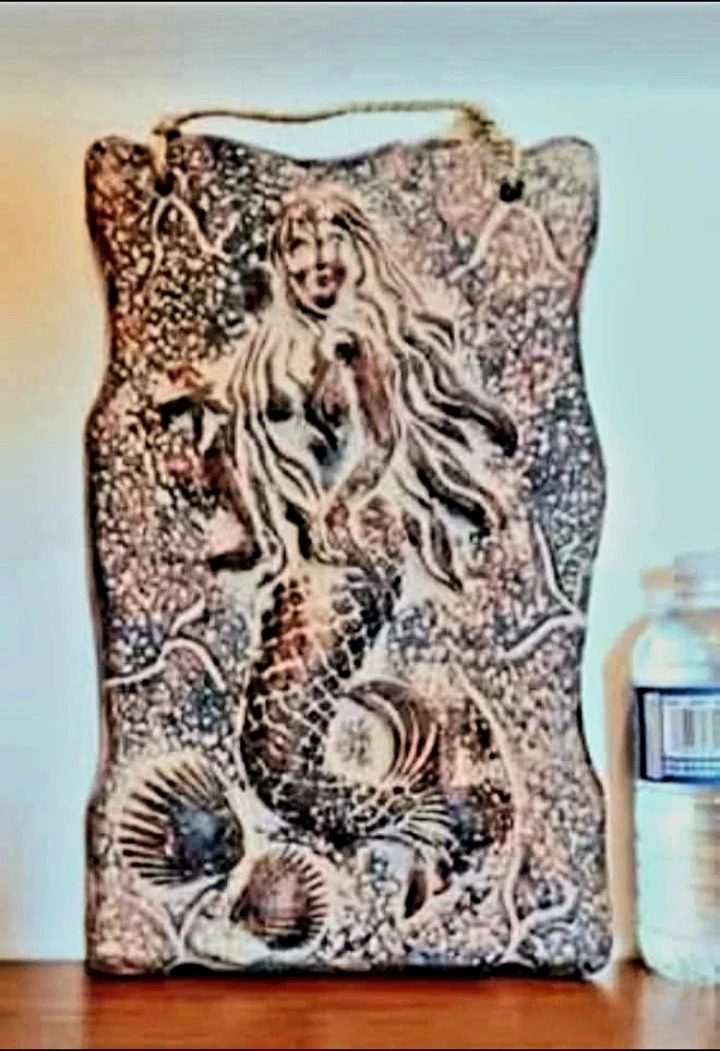 I'm offering a unique antique cast iron plaque featuring a mermaid and sea fossils. This piece has a rustic charm that would complement any collection or serve as a distinctive decorative item.