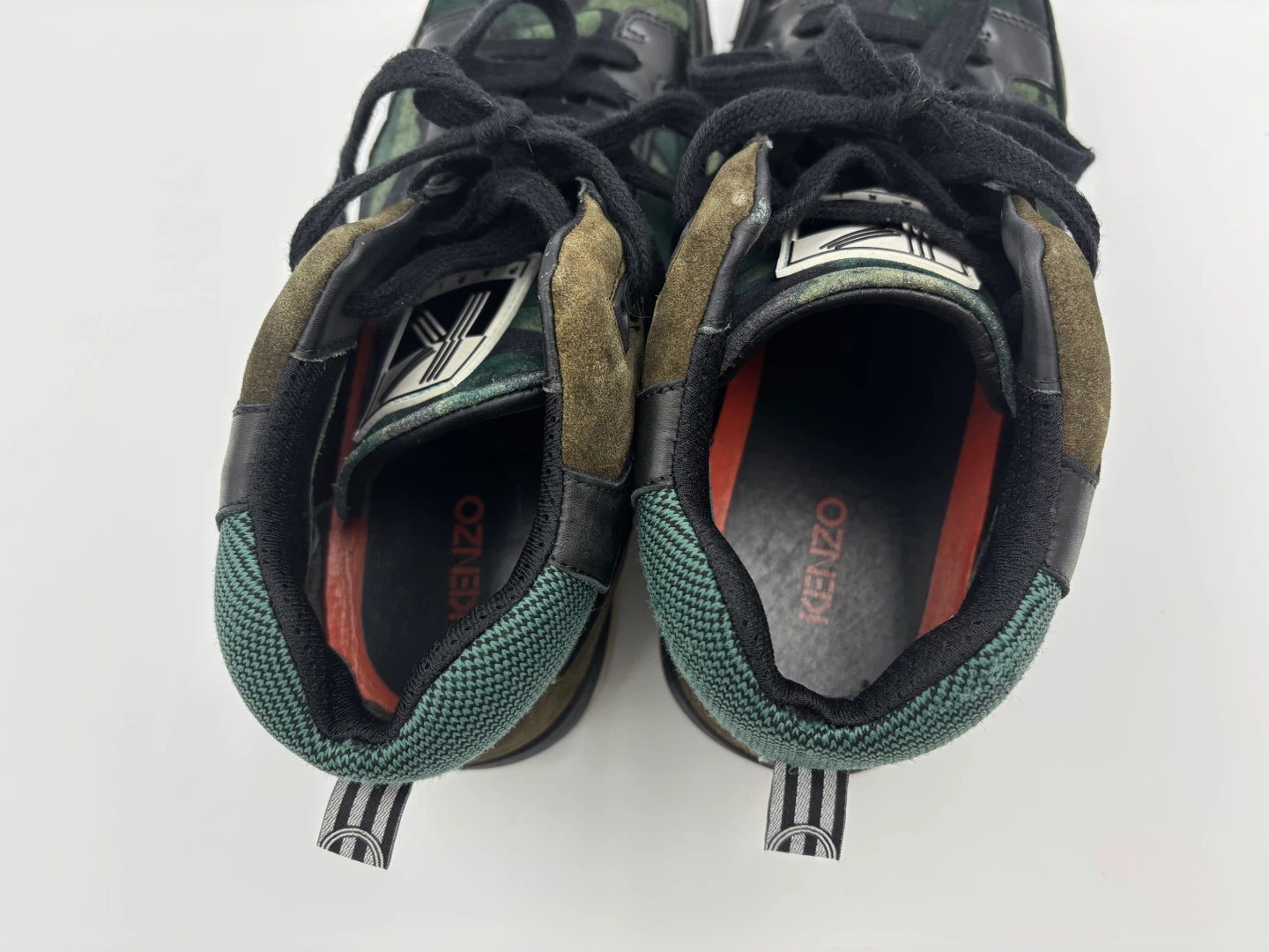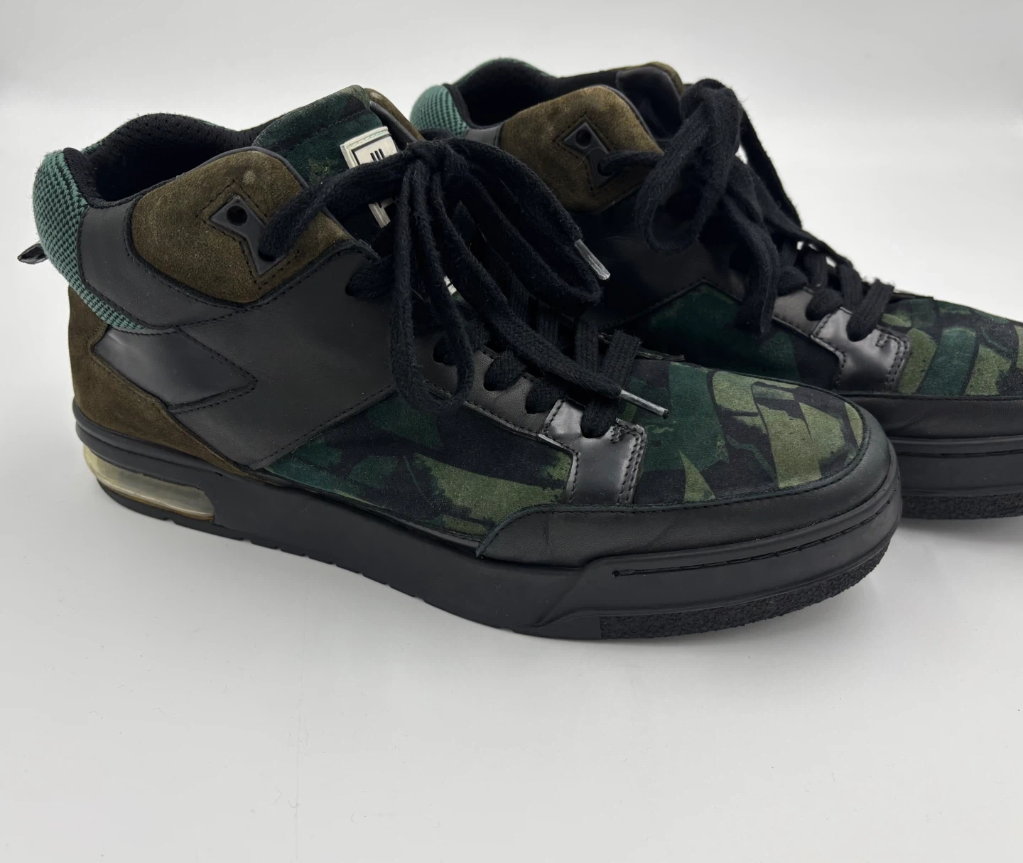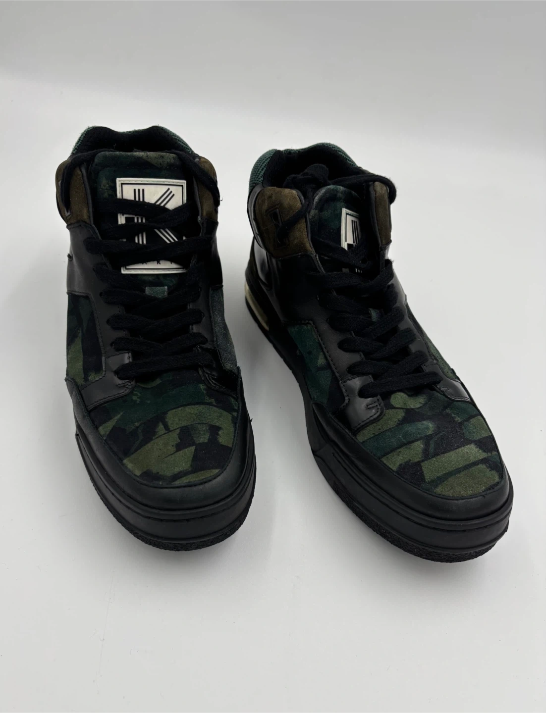 Selling a pair of KENZO men's high-top sneakers in a cool camo pattern! They're a size 9.5-10 and feature a unique design with a mix of black leather and camo fabric. The shoes are in great condition.