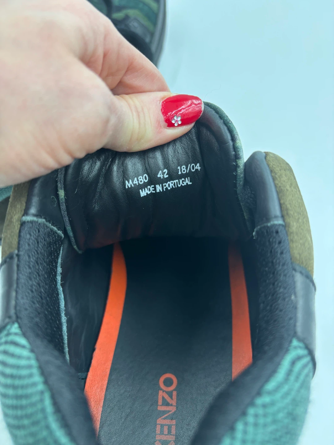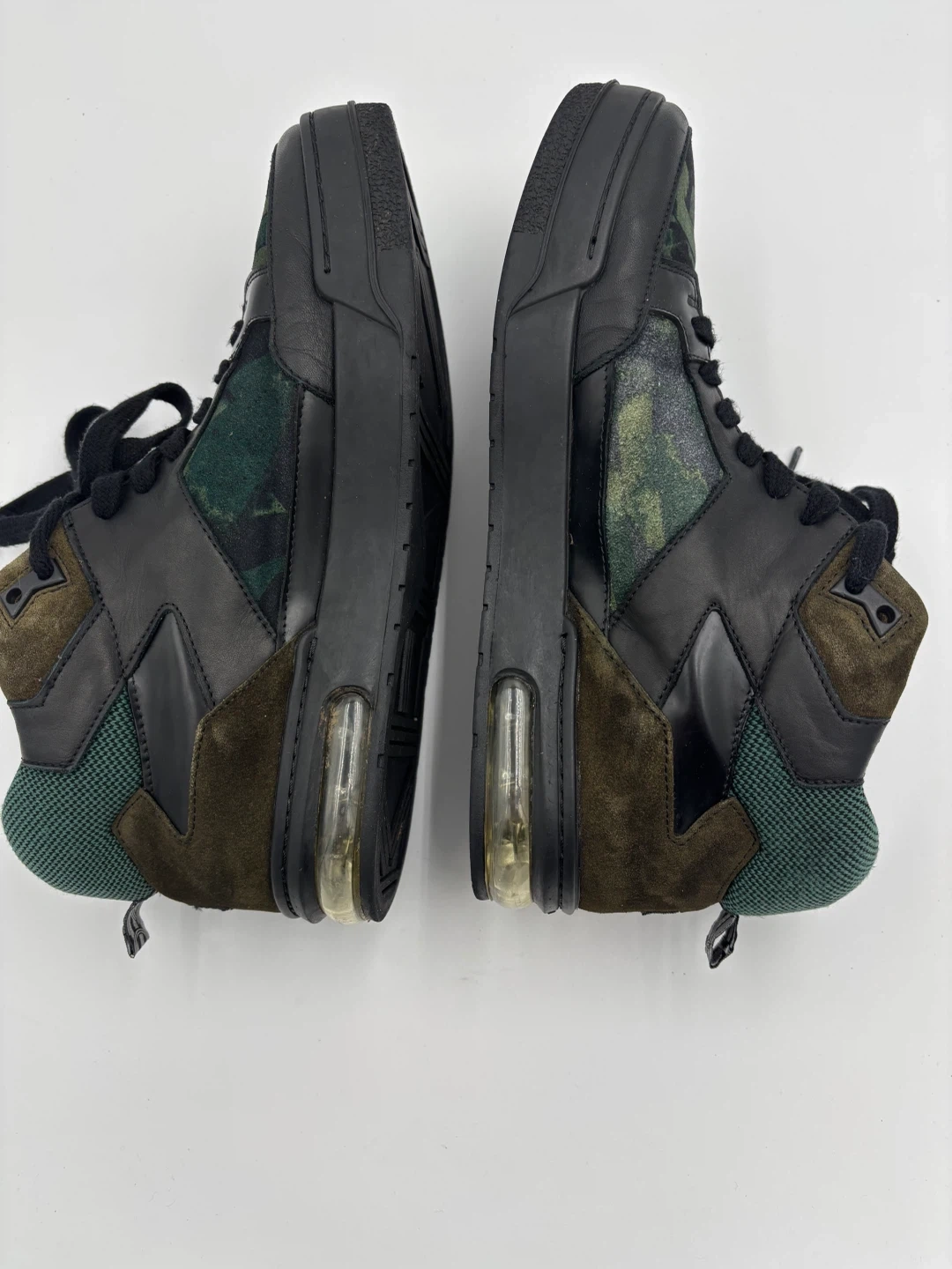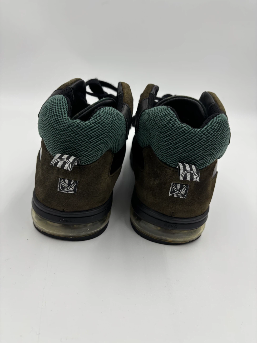 Selling a pair of KENZO men's high-top sneakers in a cool camo pattern! They're a size 9.5-10 and feature a unique design with a mix of black leather and camo fabric. The shoes are in great condition.