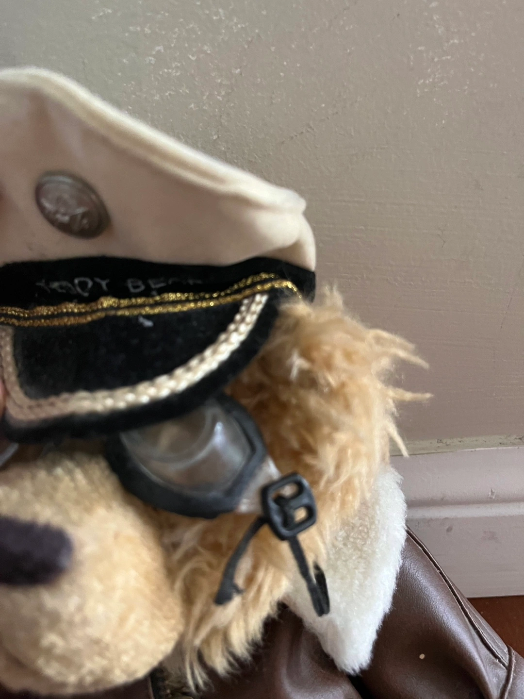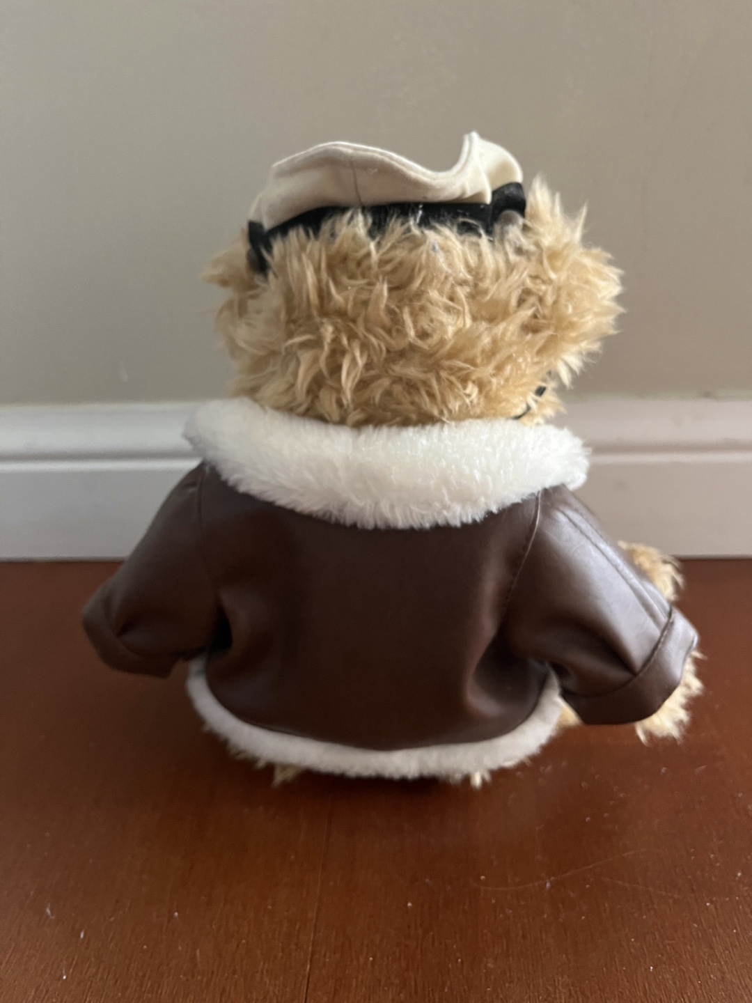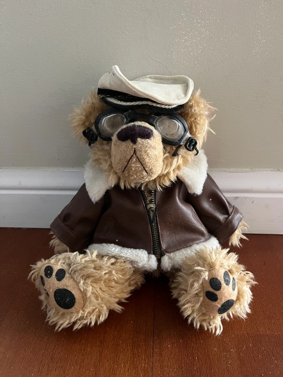 This is a cute teddy bear dressed as an aviator! It's wearing a brown leather jacket with a white fur collar, a cap, and goggles. It would make a great gift for a child or anyone who loves teddy bears.