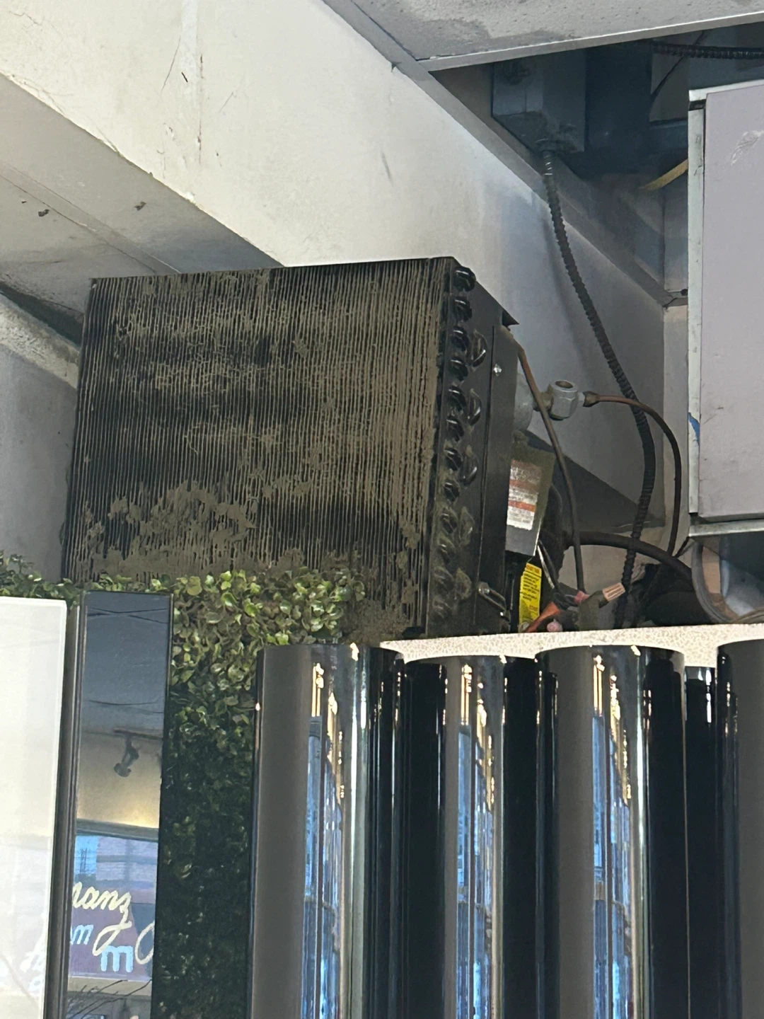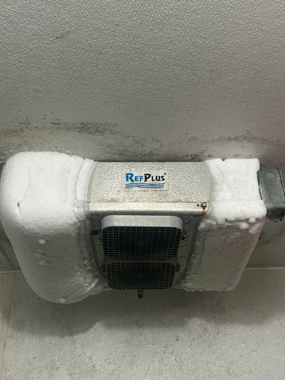 This is a RefPlus commercial reach-in unit cooler or evaporator, heavily frosted, likely from the ECA series.