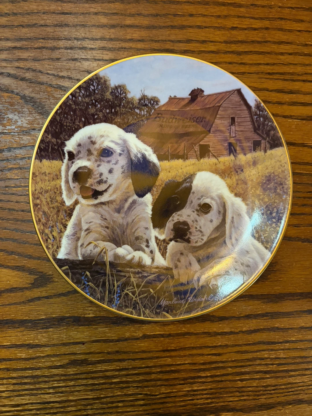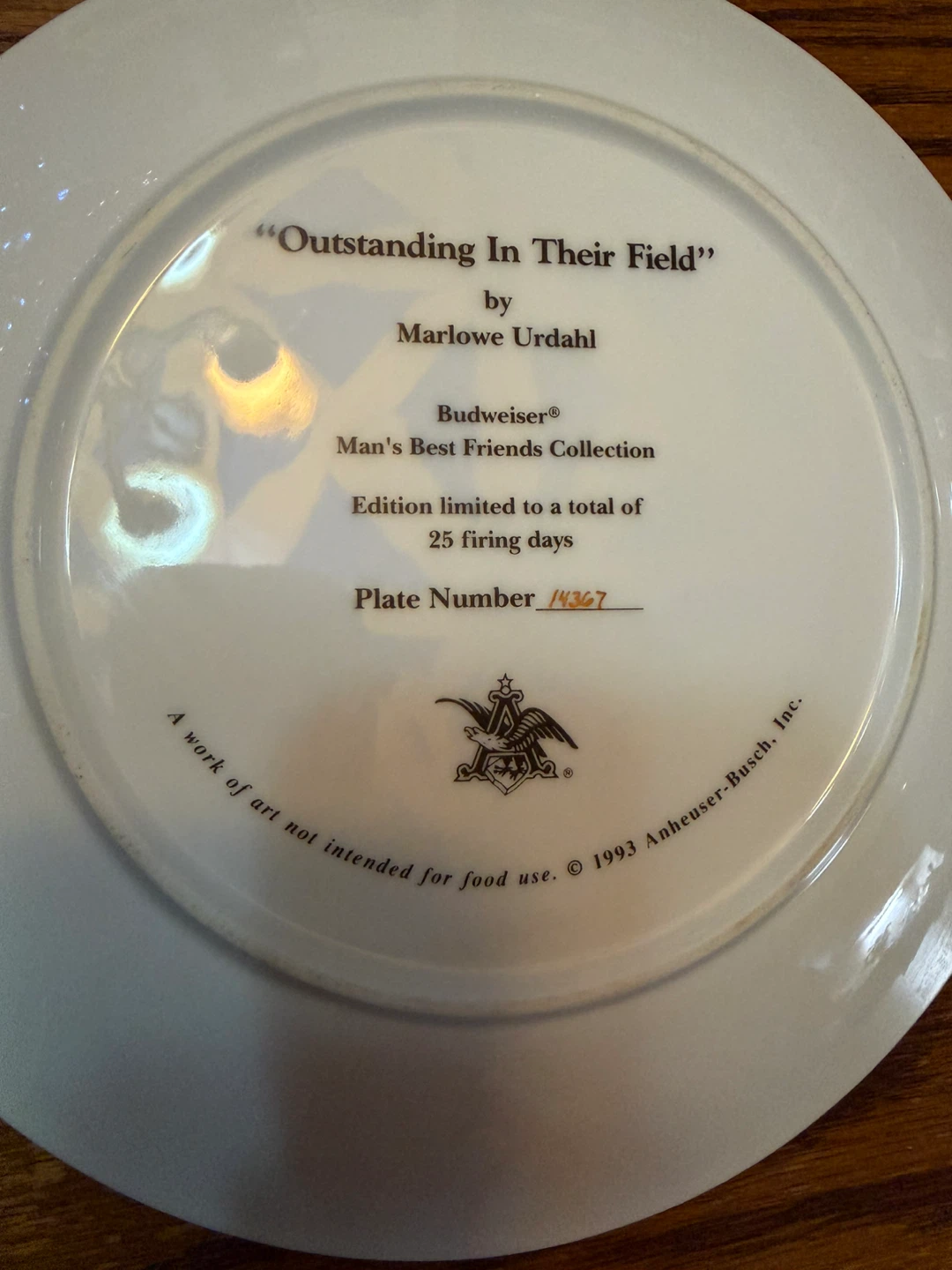 Selling a Budweiser Man's Best Friends Collection plate. It's titled "Outstanding In Their Field" by Marlowe Urdahl. The edition is limited to a total of 25 firing days, and this plate's number is 14367. A work of art not intended for food use