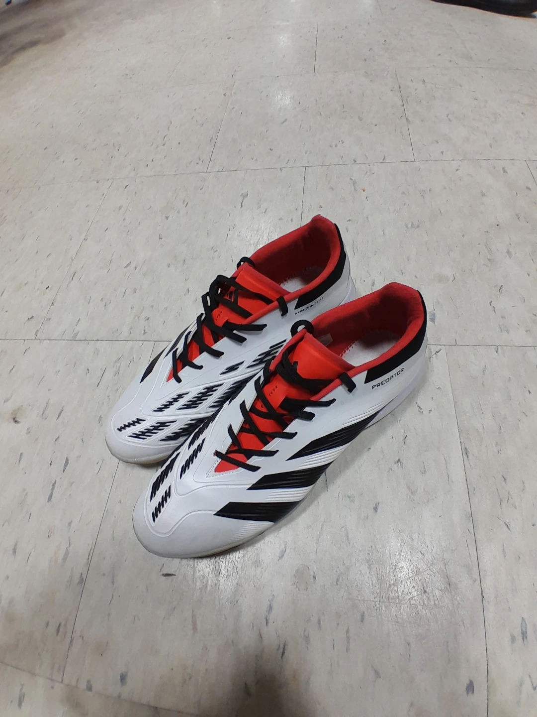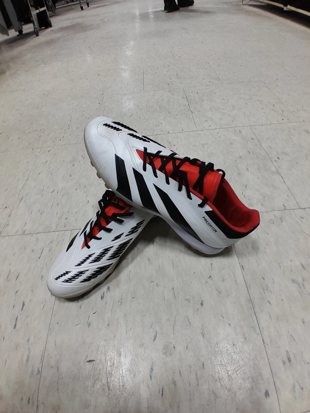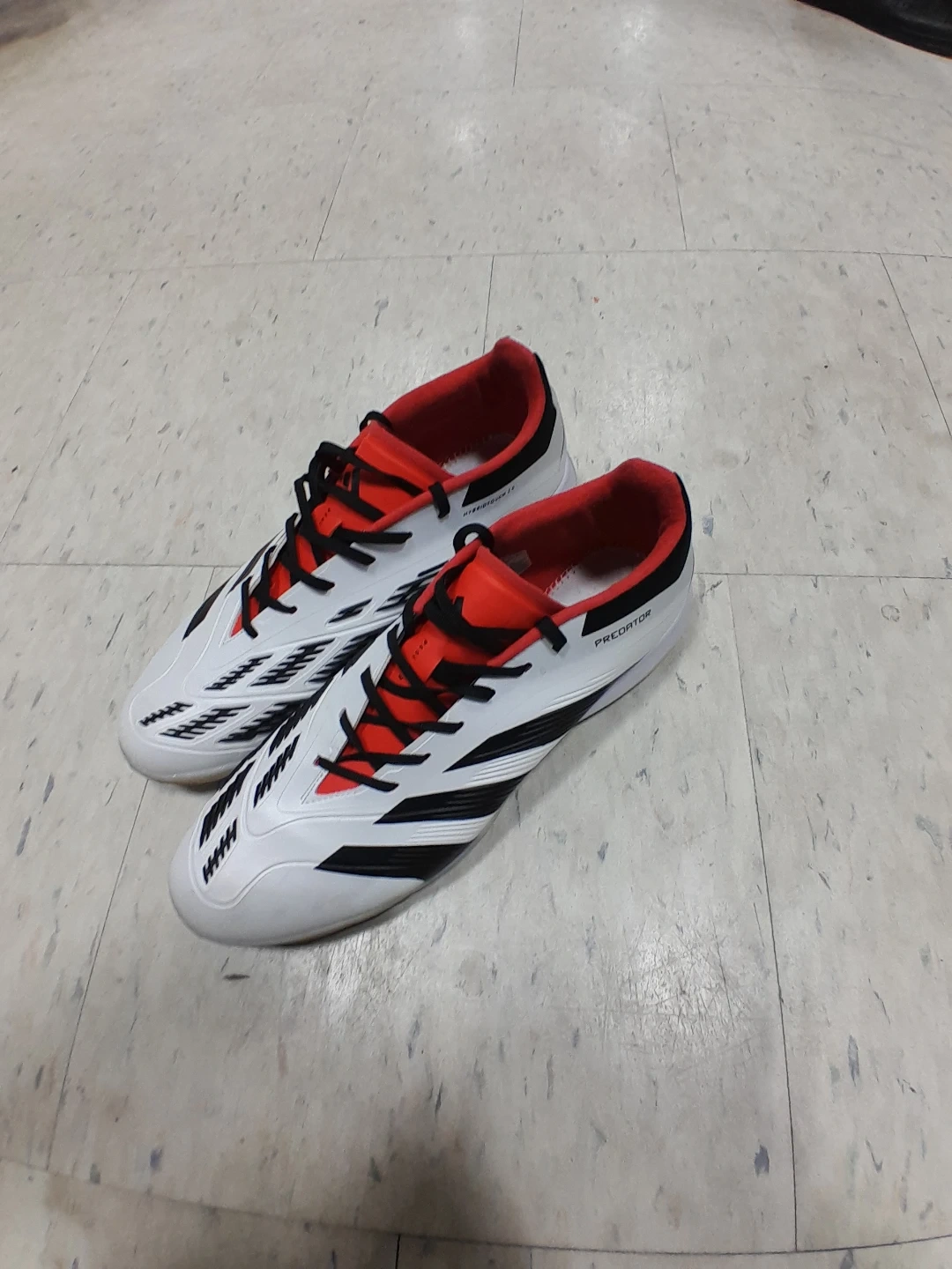 Adidas Predator soccer shoes. They feature a white, black, and red colour scheme. Great for playing on the field! Men's size 9.