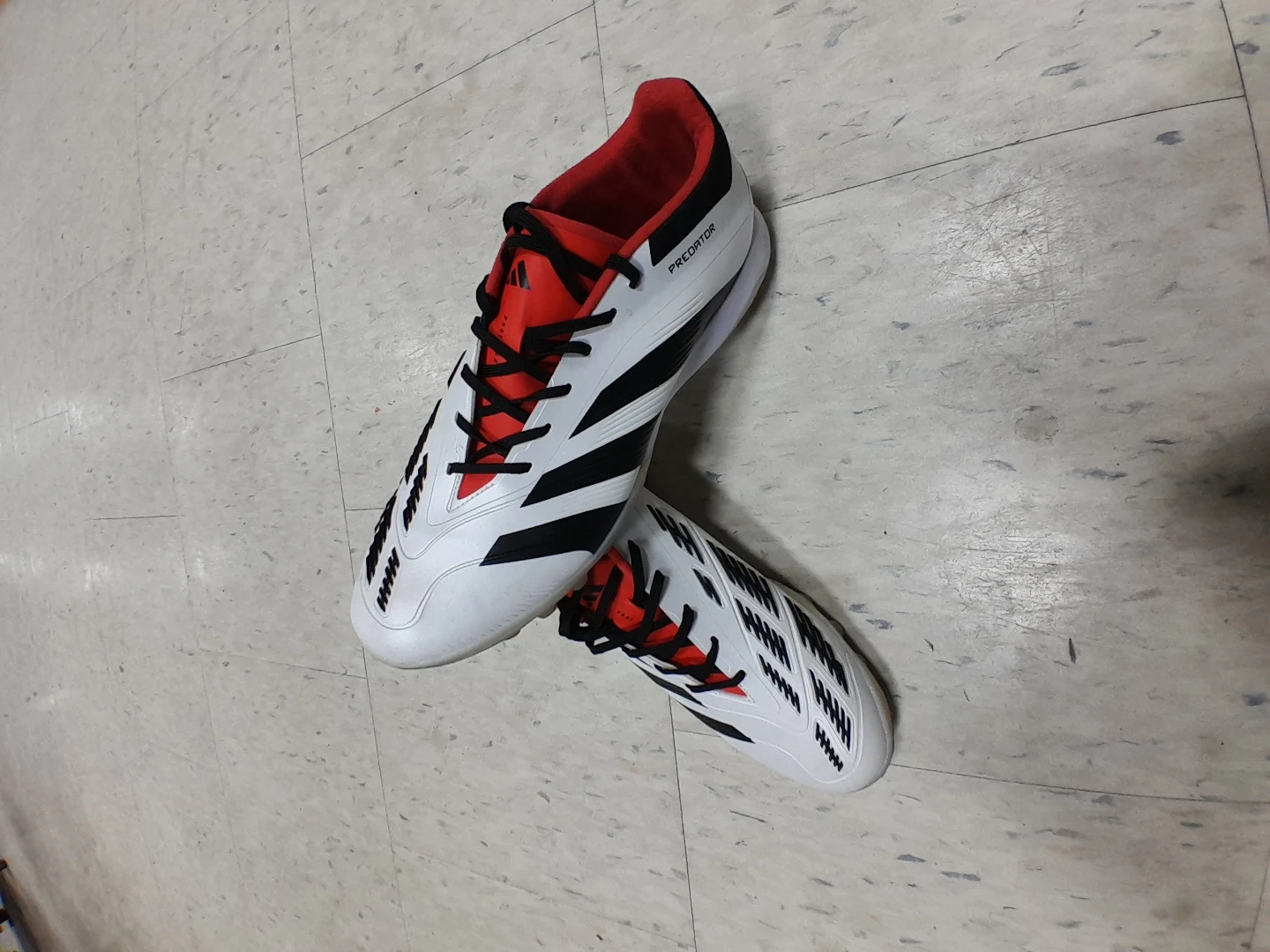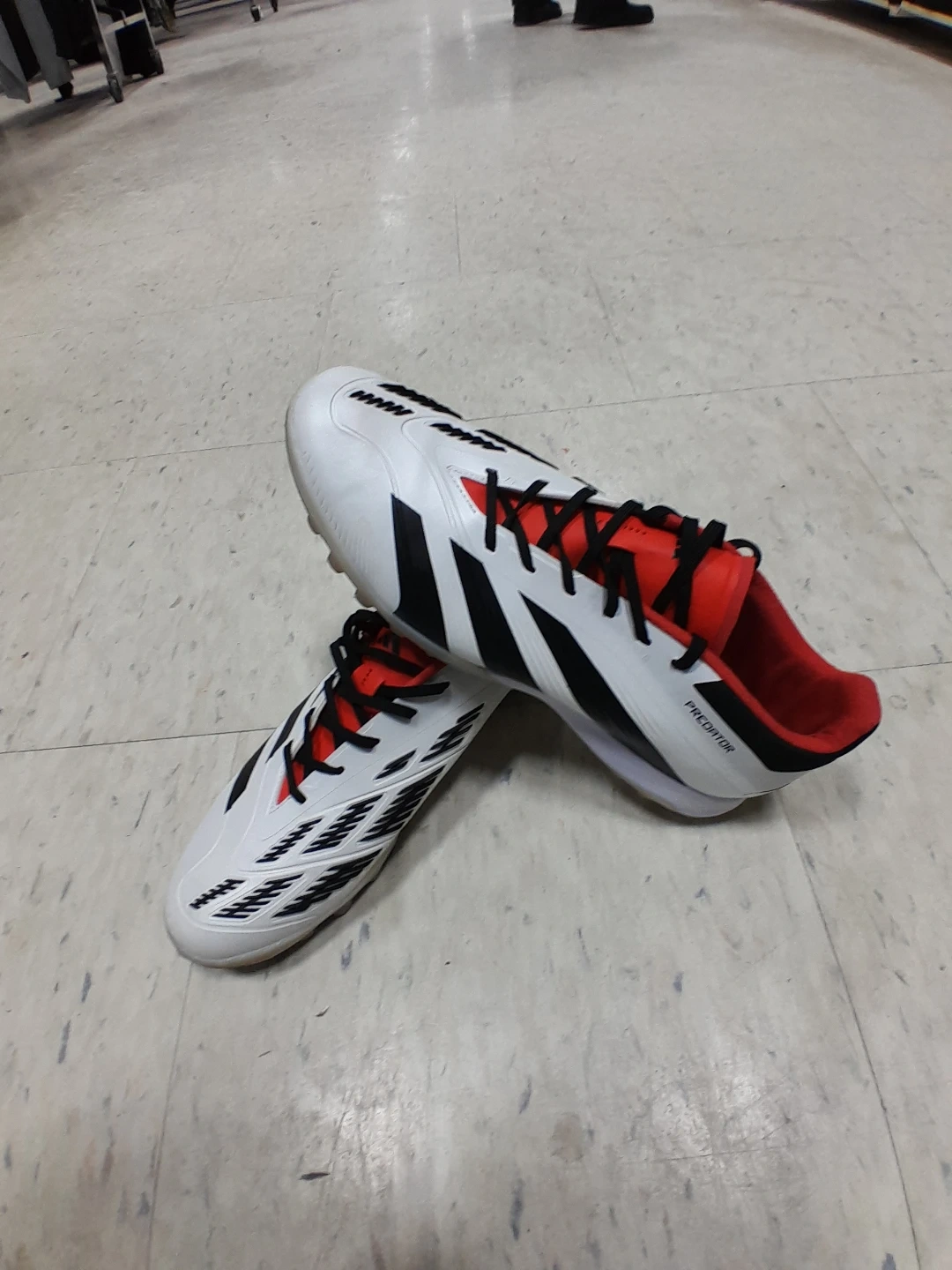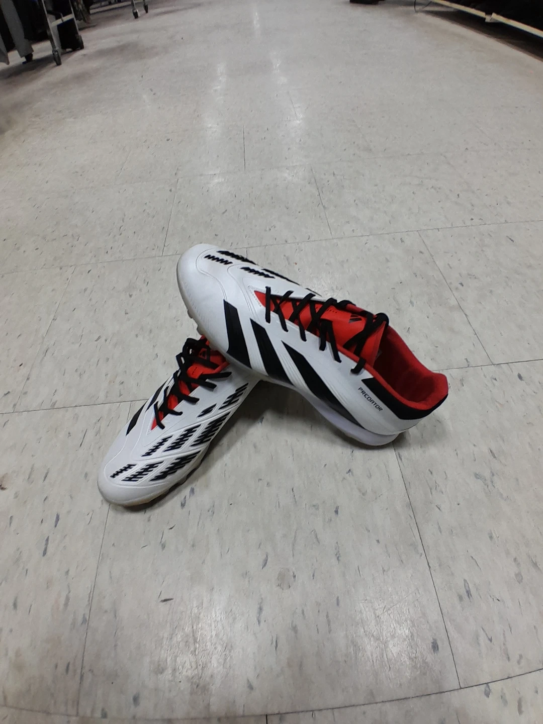 Adidas Predator soccer shoes. They feature a white, black, and red colour scheme. Great for playing on the field! Men's size 9.