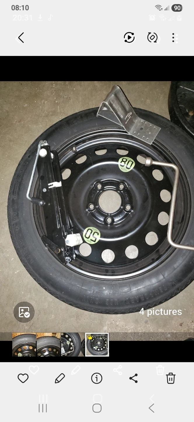 Selling a spare tire wheel with a jack and tools for temporary use. The tire has markings indicating speed limits of 80 km/h and 50 km/h. Great for emergencies!