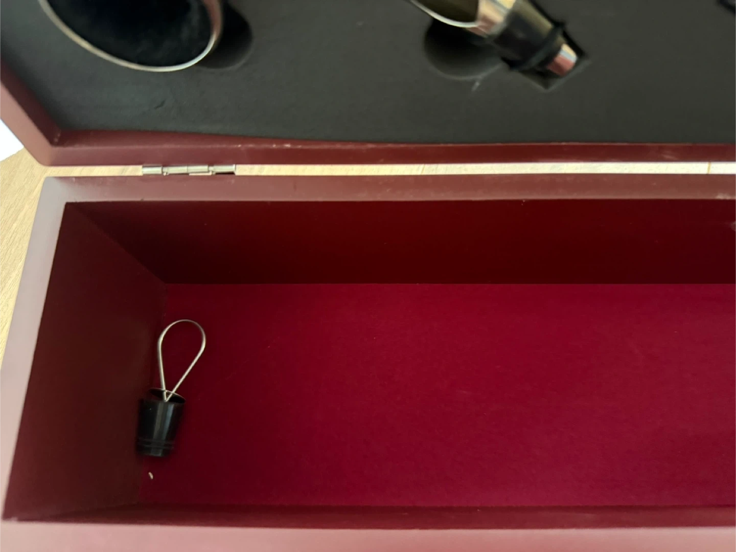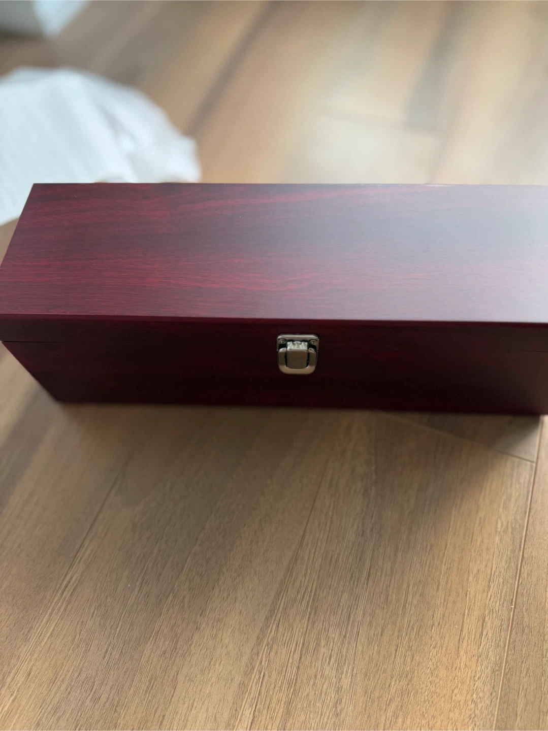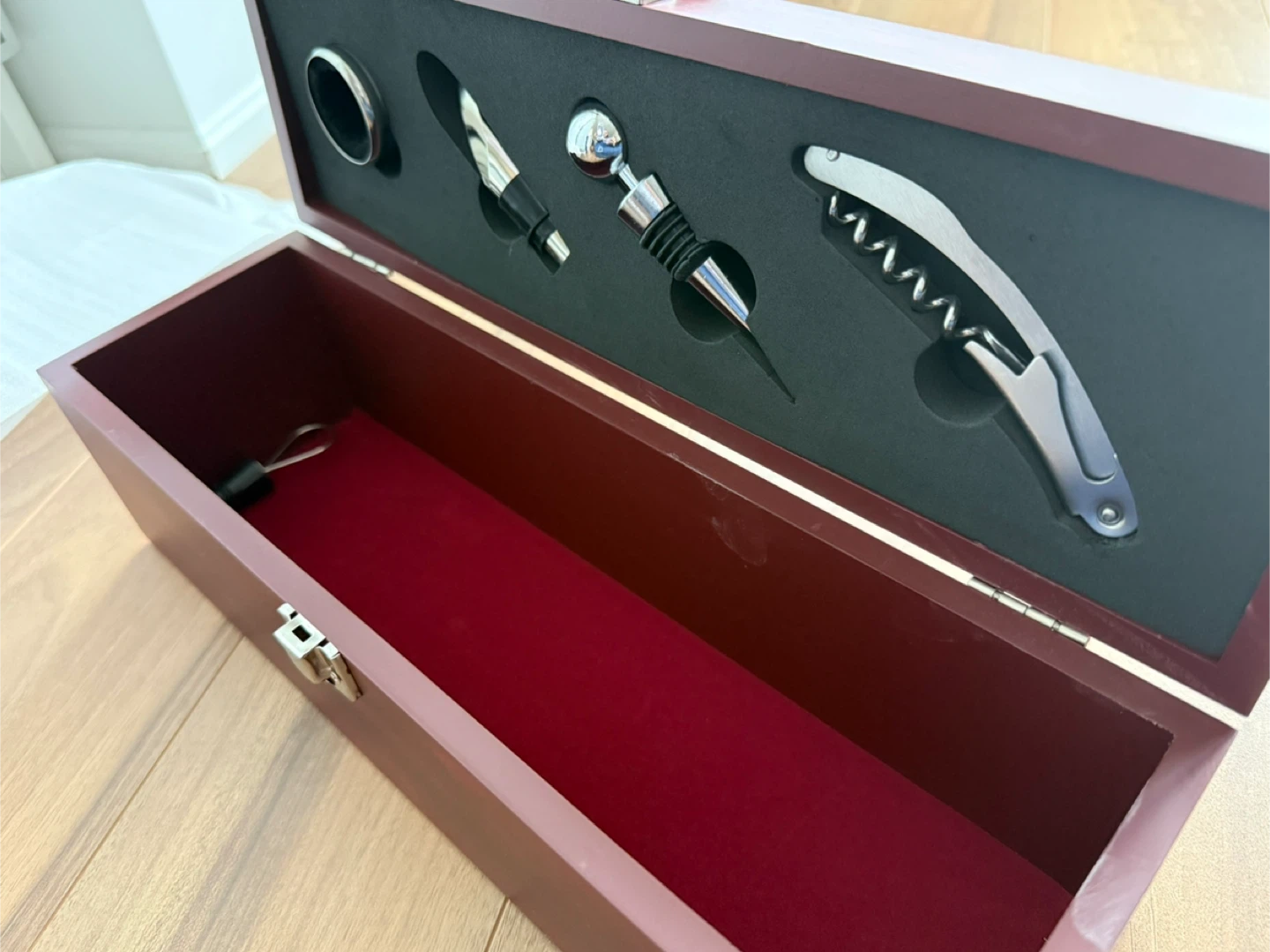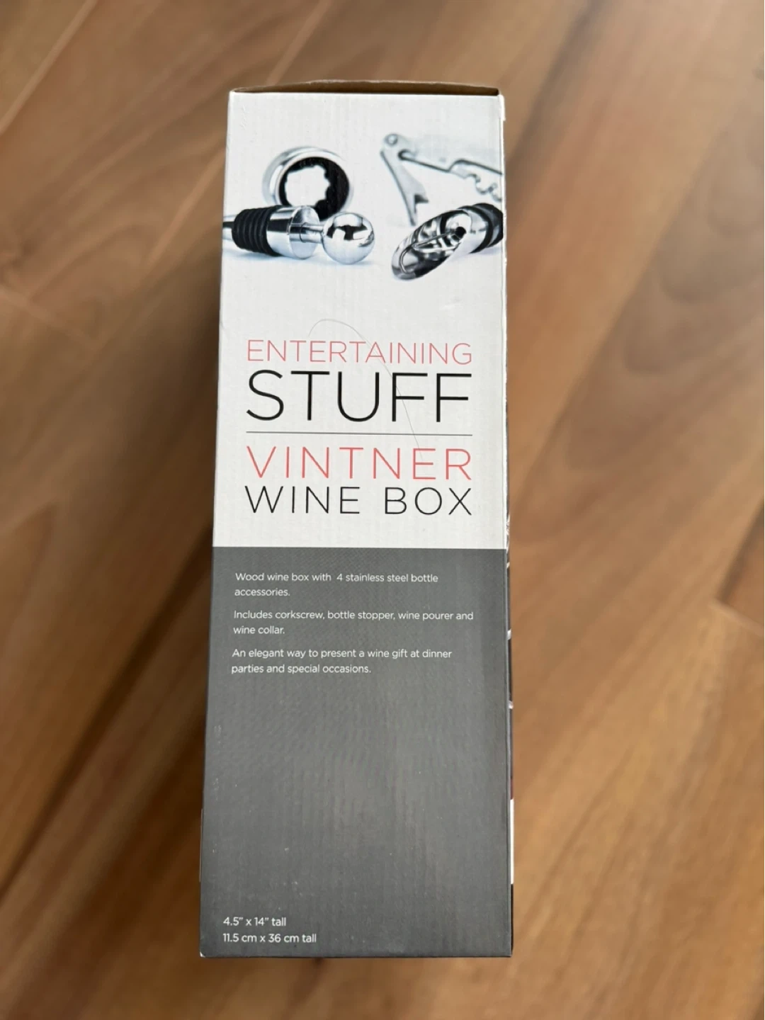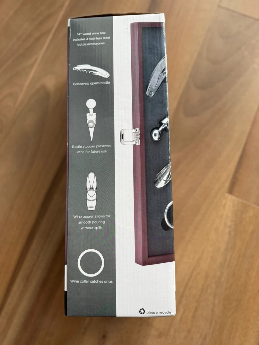 14" wood wine box includes 4 stainless steel bottle accessories: a corkscrew to open bottles, a bottle stopper to preserve wine for future use, a wine pourer to allow for smooth pouring without spills, and a wine collar to catch drips.