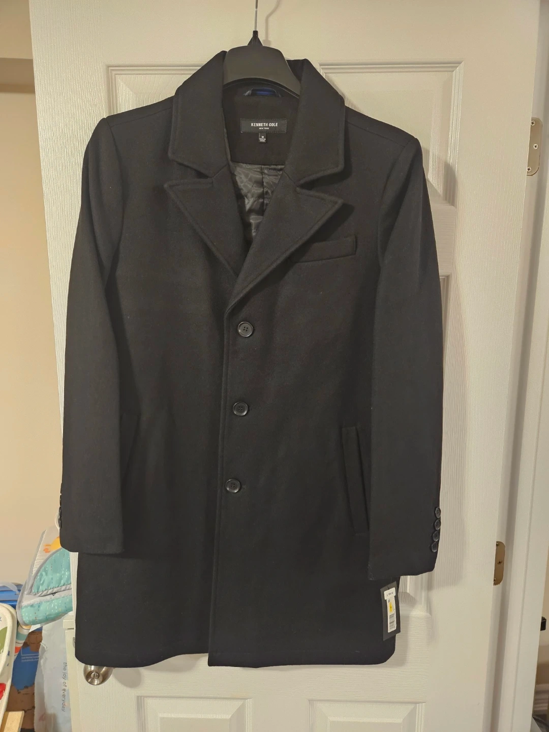 Selling a Kenneth Cole wool blend coat in black. It's a size medium and in great condition. This coat is perfect for staying warm and stylish during the colder months!