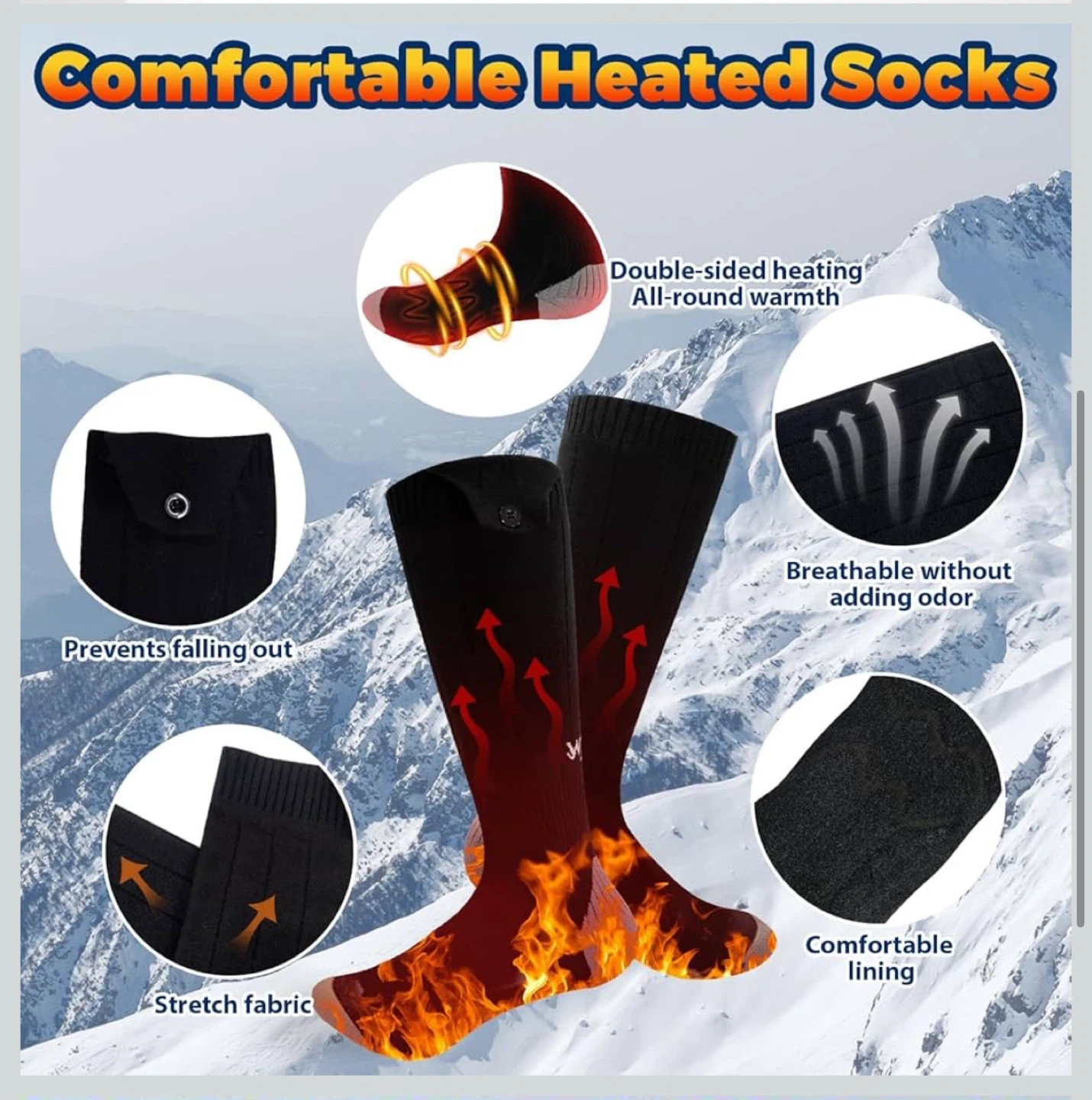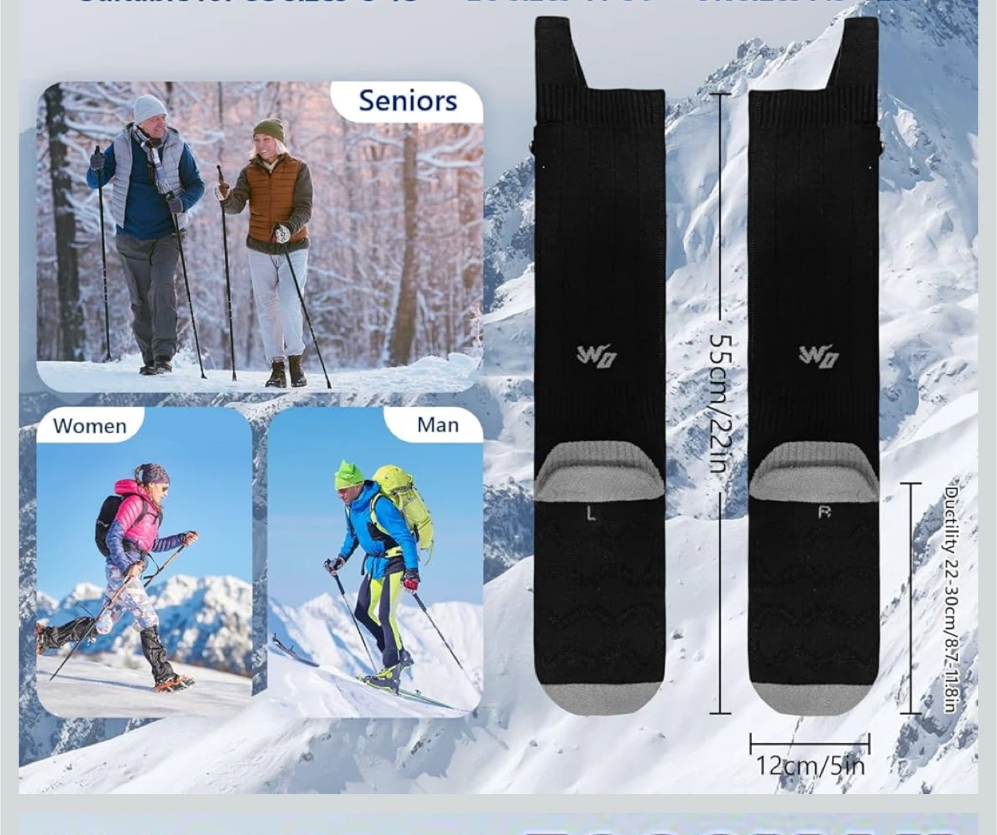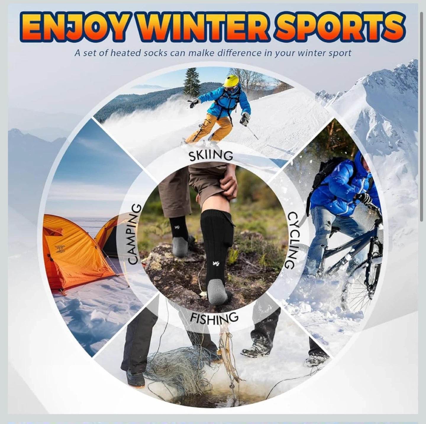 Enjoy winter sports with these comfortable heated socks! They feature 4 levels of temperature settings to keep your feet warm for hours. The large-capacity electric heating ensures up to 8 hours of warmth. They are breathable, prevent falling out, and have a comfortable lining. Perfect for skiing, camping, cycling, and fishing