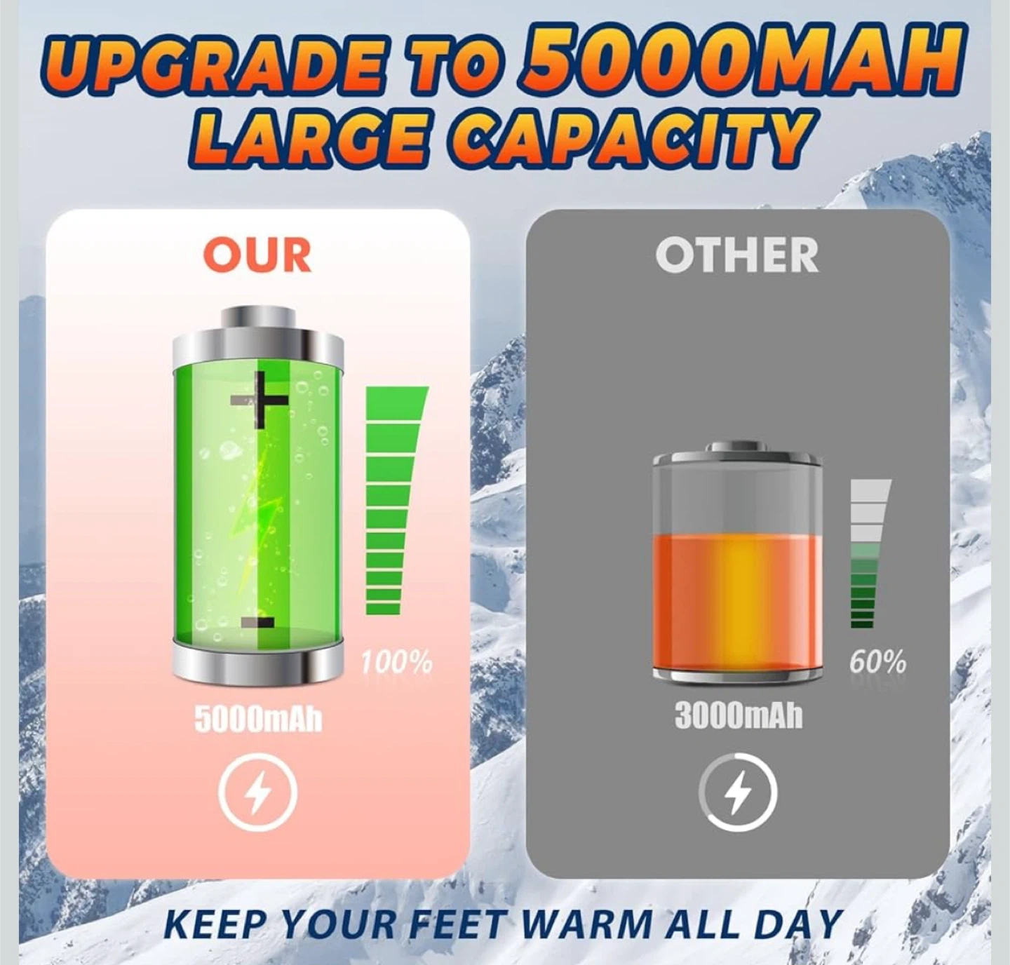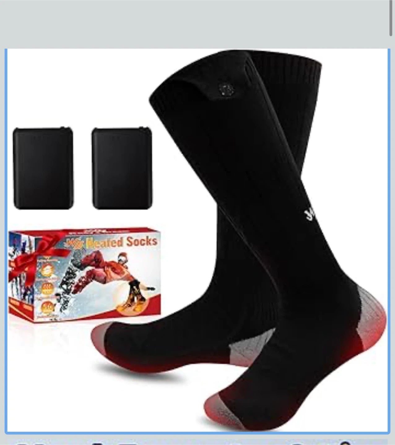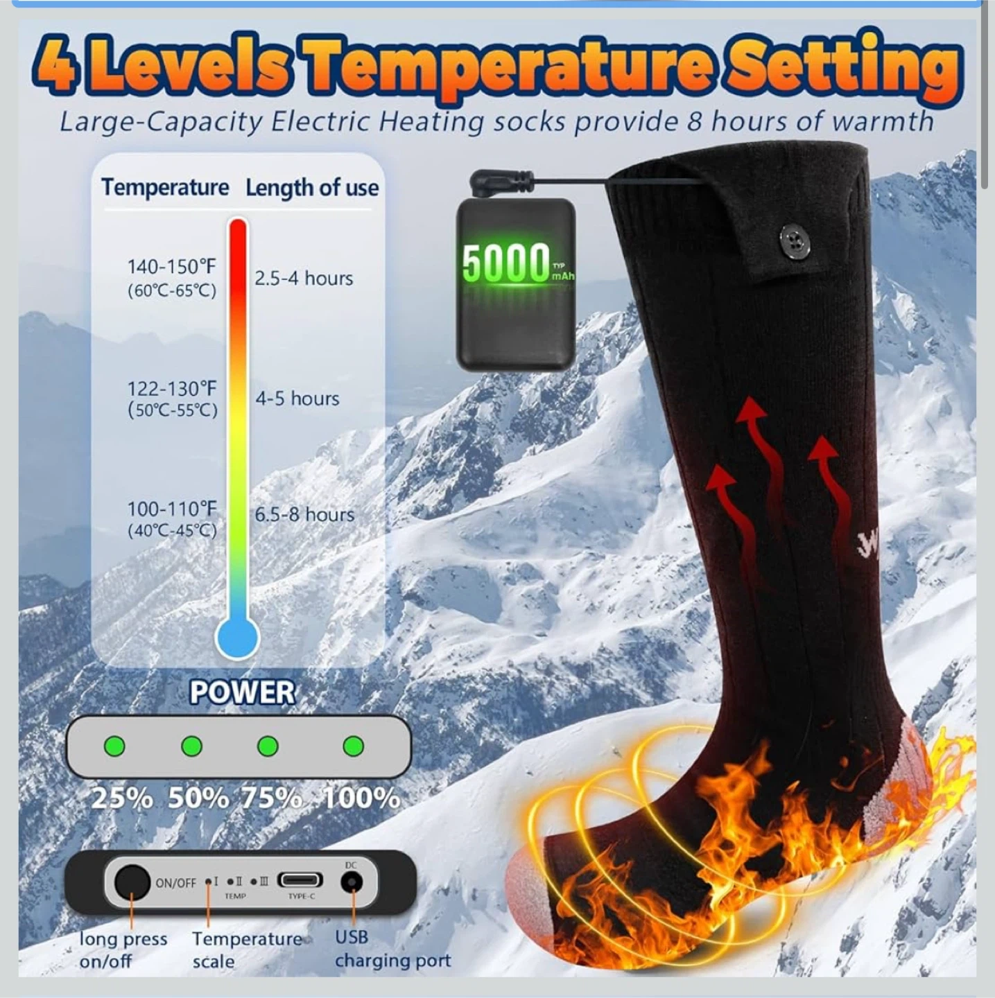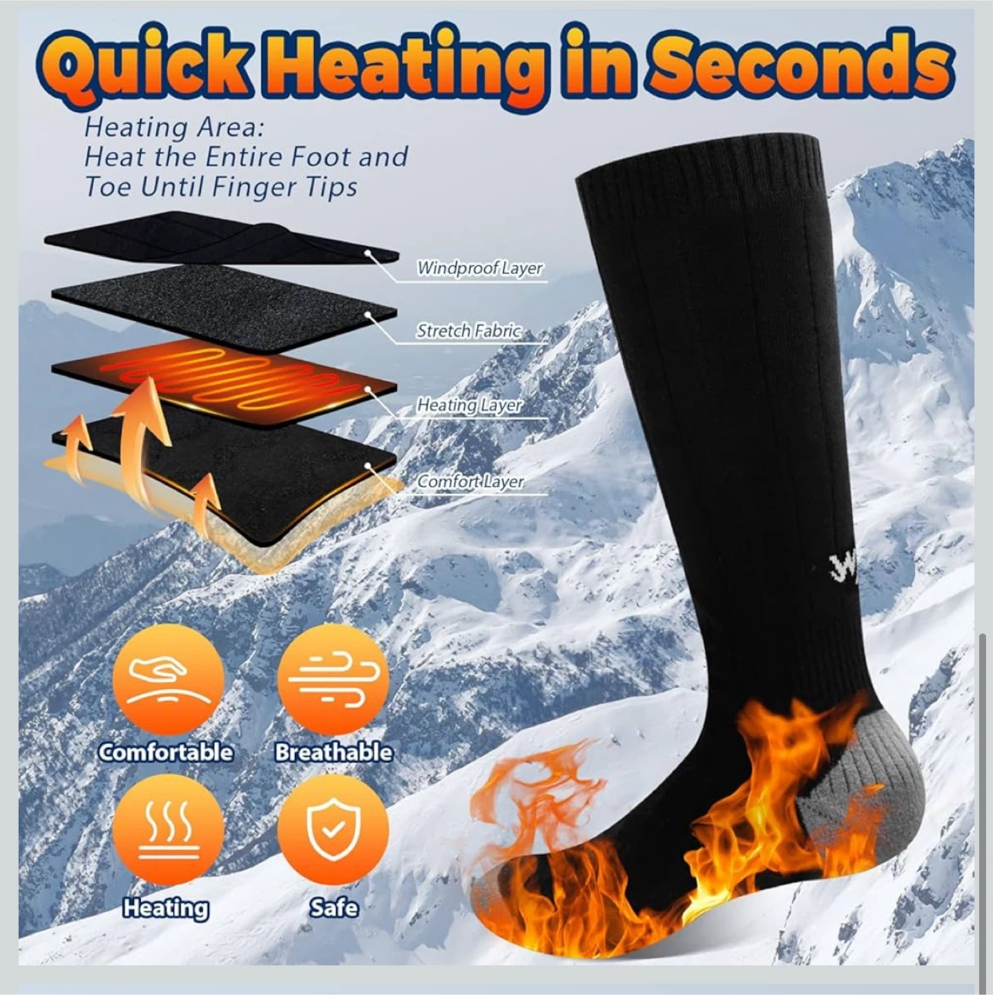 Enjoy winter sports with these comfortable heated socks! They feature 4 levels of temperature settings to keep your feet warm for hours. The large-capacity electric heating ensures up to 8 hours of warmth. They are breathable, prevent falling out, and have a comfortable lining. Perfect for skiing, camping, cycling, and fishing