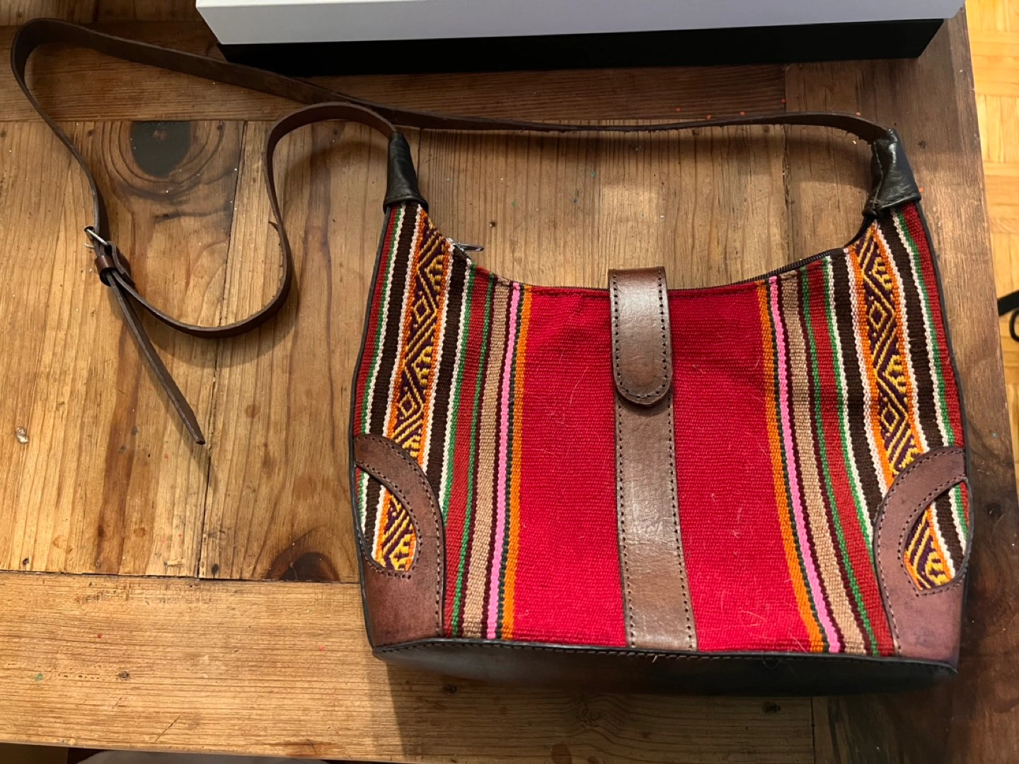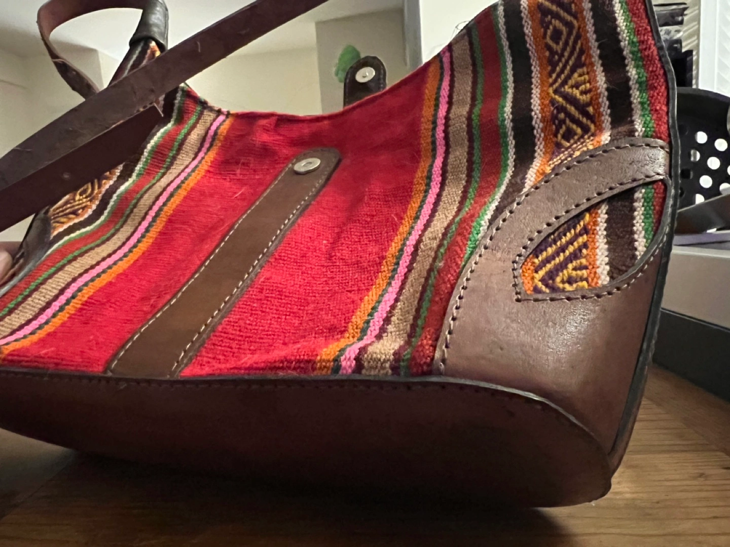 A handmade purse from South America. Never used, great condition. Real leather, beautiful fabric that is handmade.