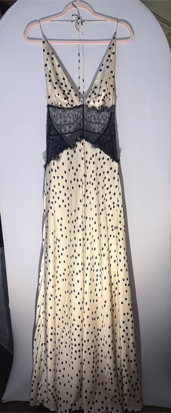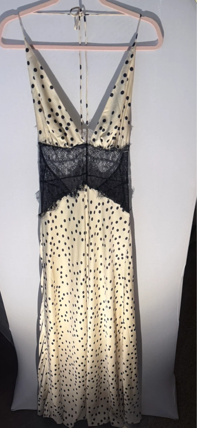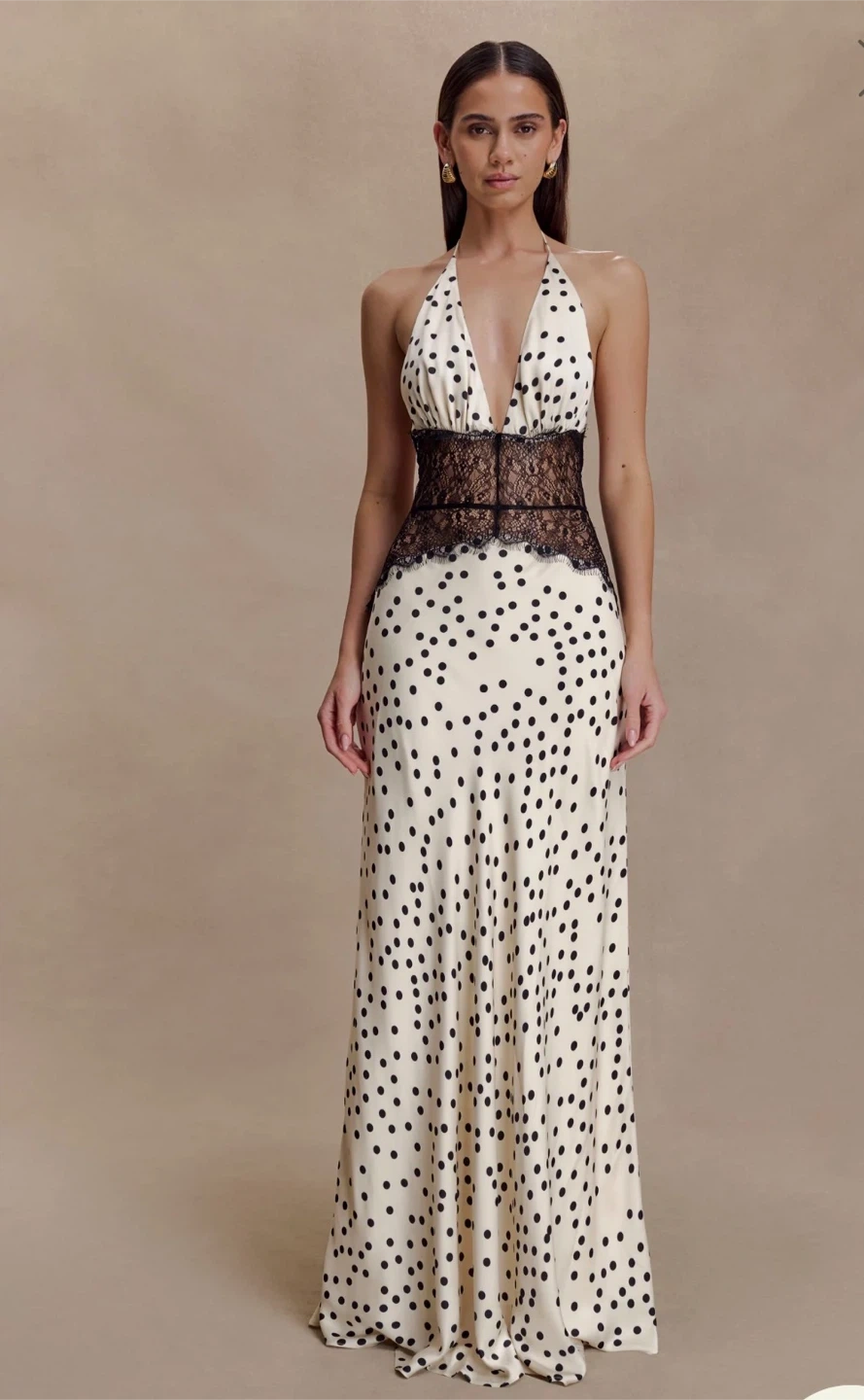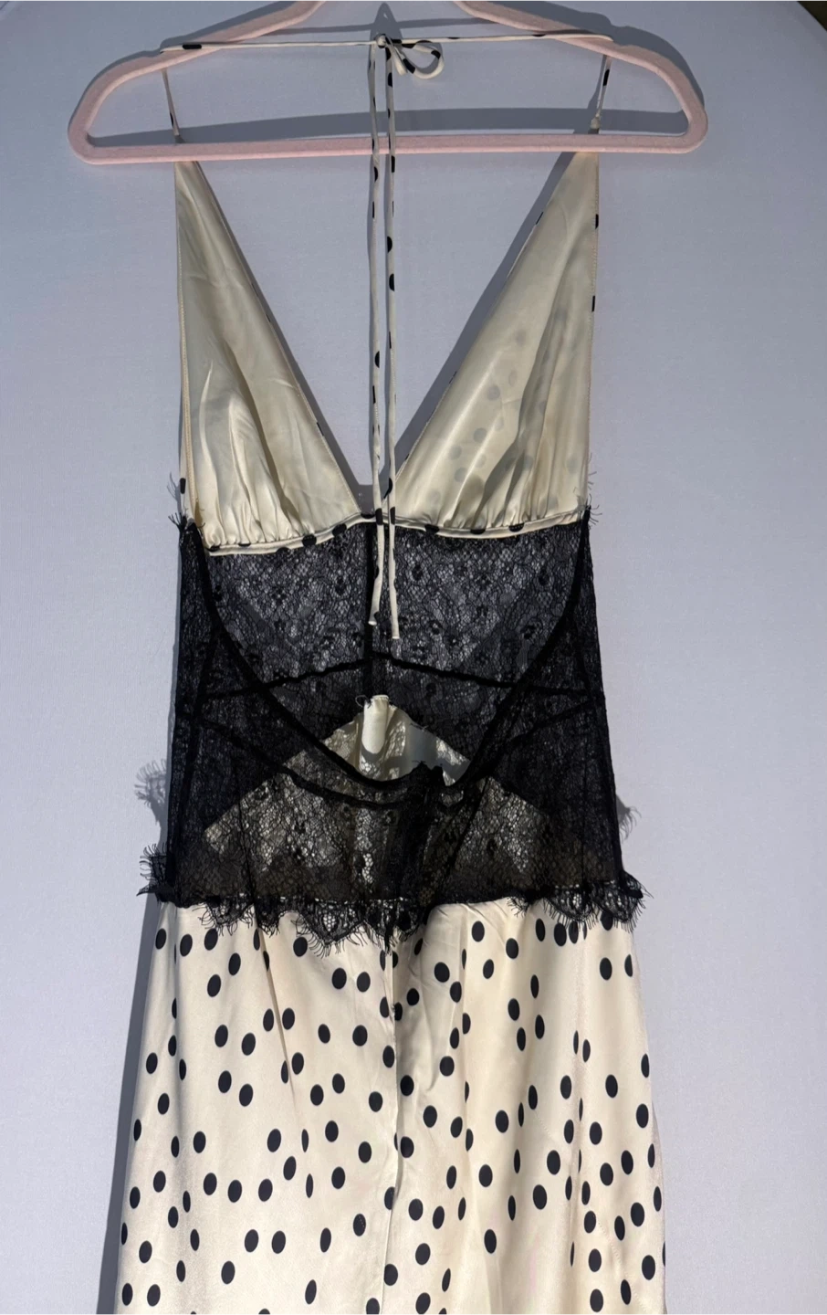 Selling a Meshki polka dot maxi dress! It's a size L and features a halter neck and lace detailing on the bodice. Perfect for a special occasion or a night out