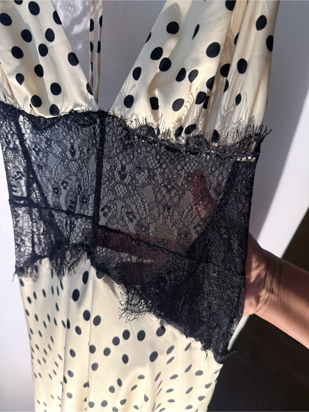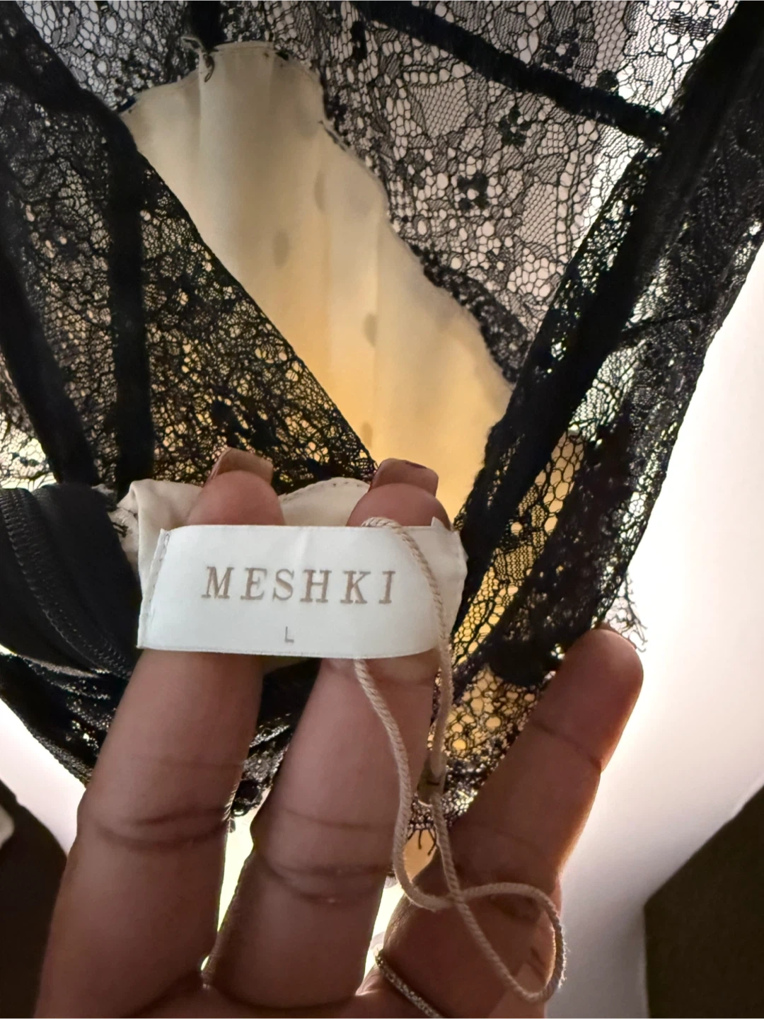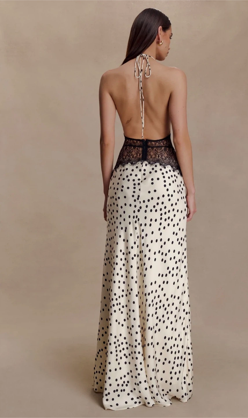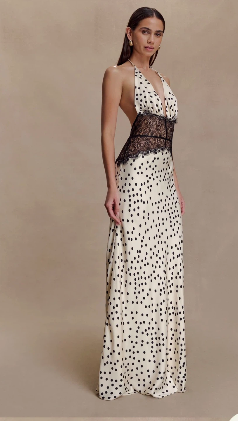 Selling a Meshki polka dot maxi dress! It's a size L and features a halter neck and lace detailing on the bodice. Perfect for a special occasion or a night out