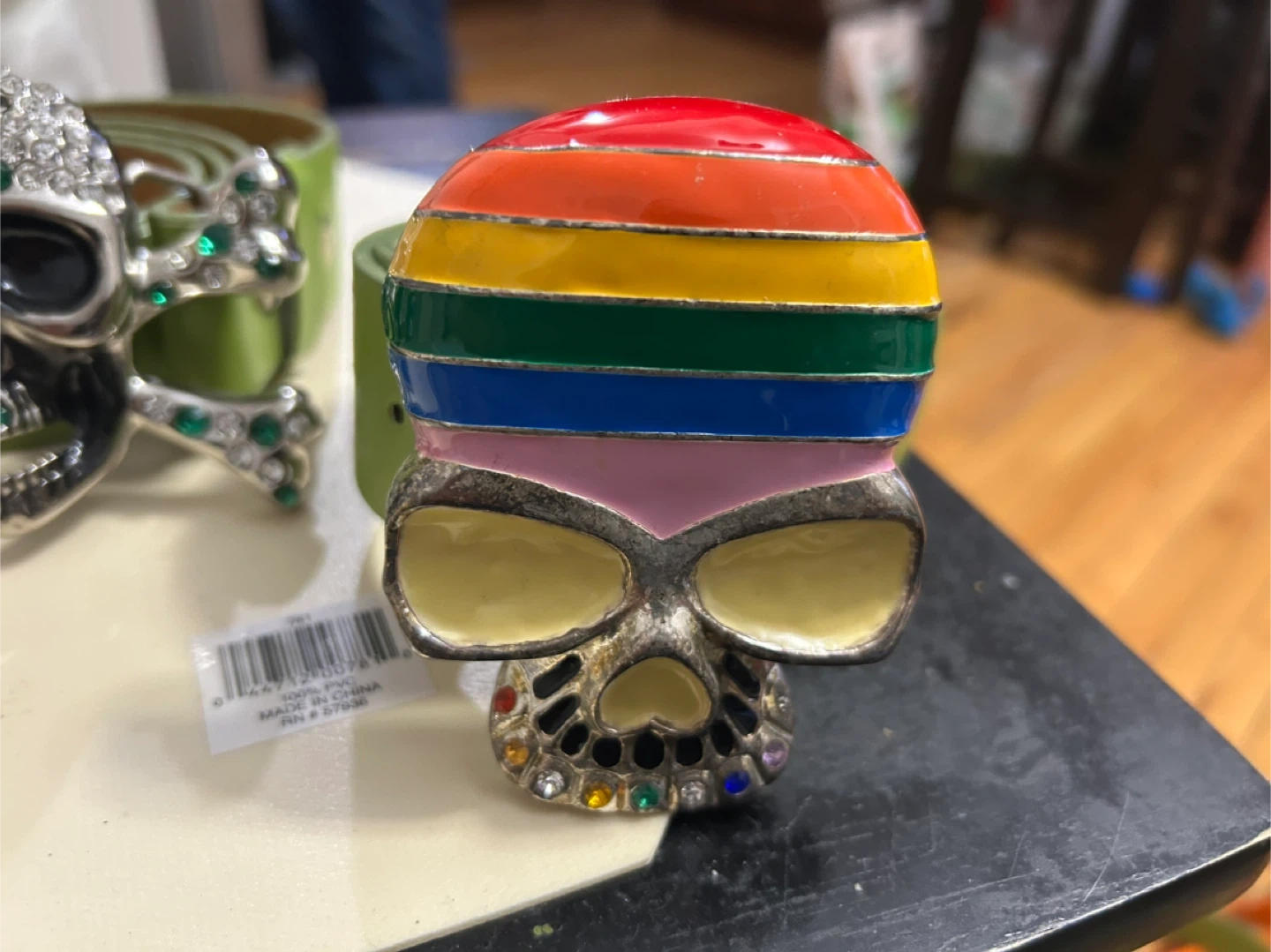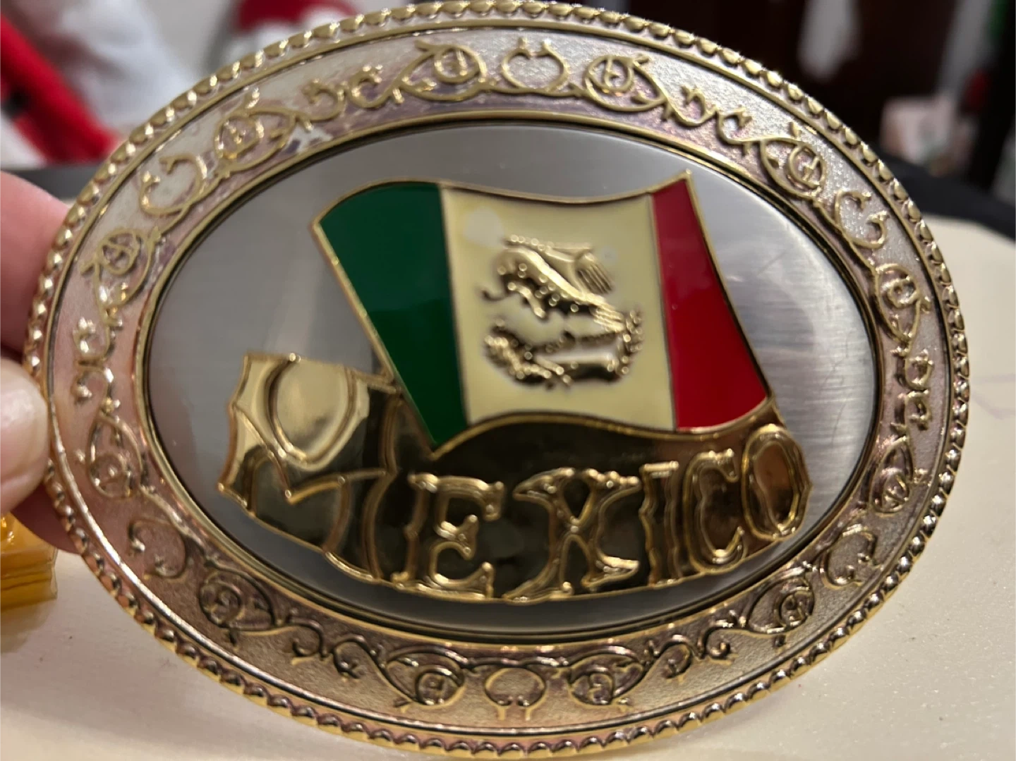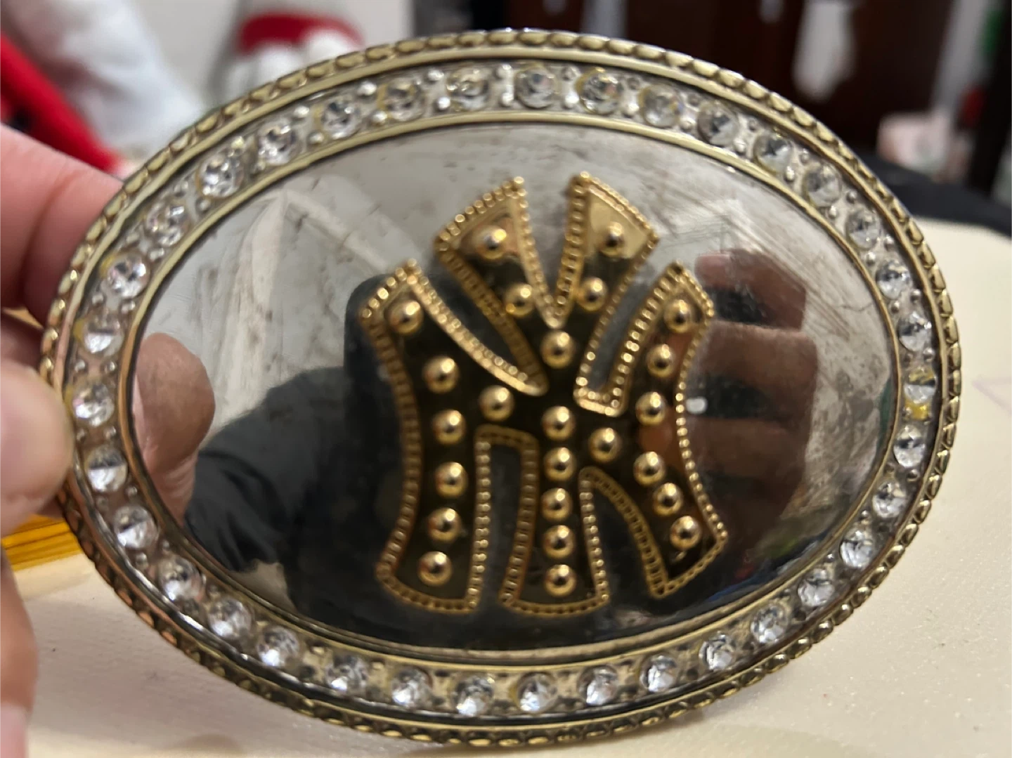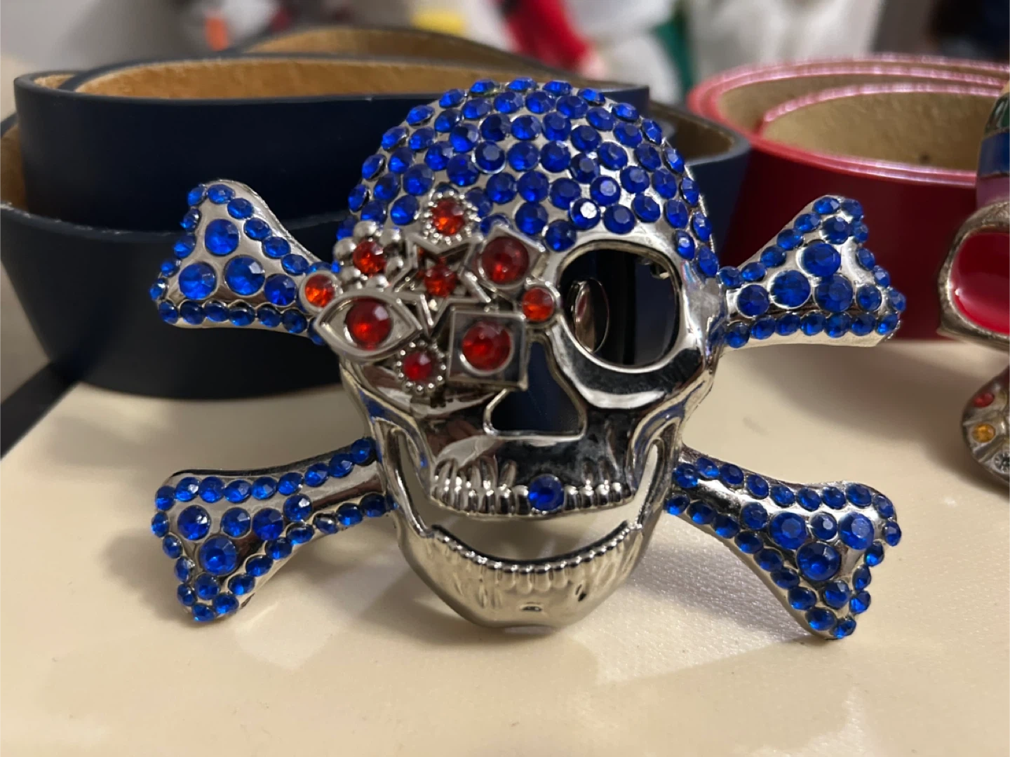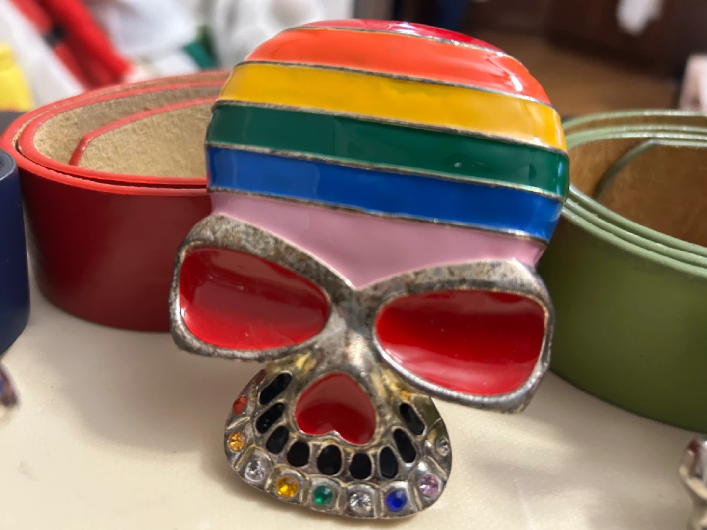 Selling a collection of vintage belt buckles. These unique pieces feature various designs including the New York Yankees logo, the flag of Guyana, the flag of Mexico, and a dinosaur design. Perfect for collectors or anyone looking to add a touch of vintage flair to their wardrobe!