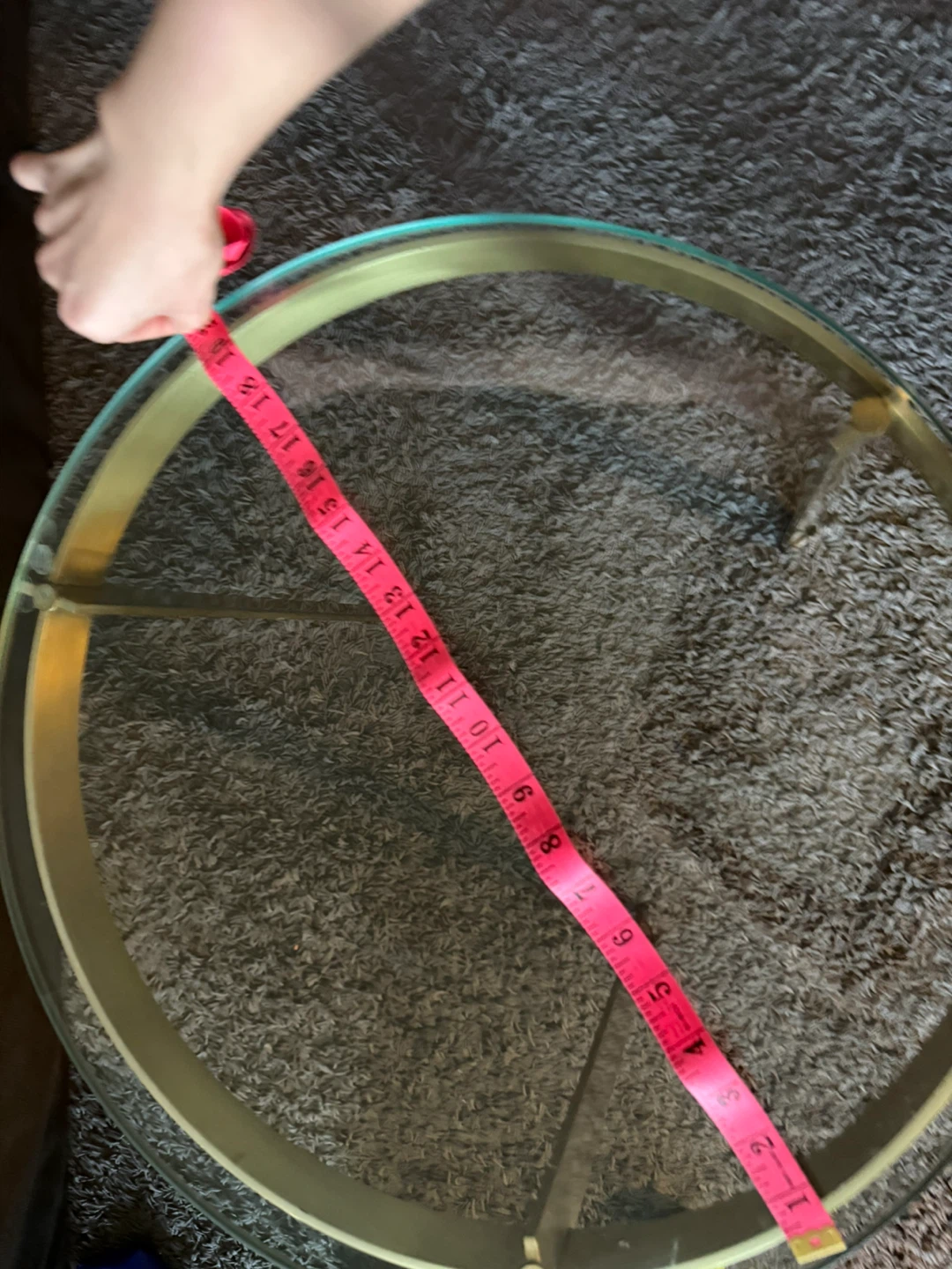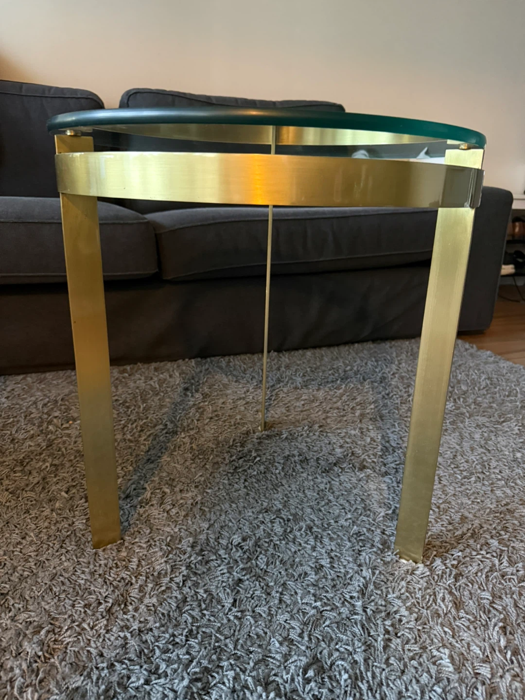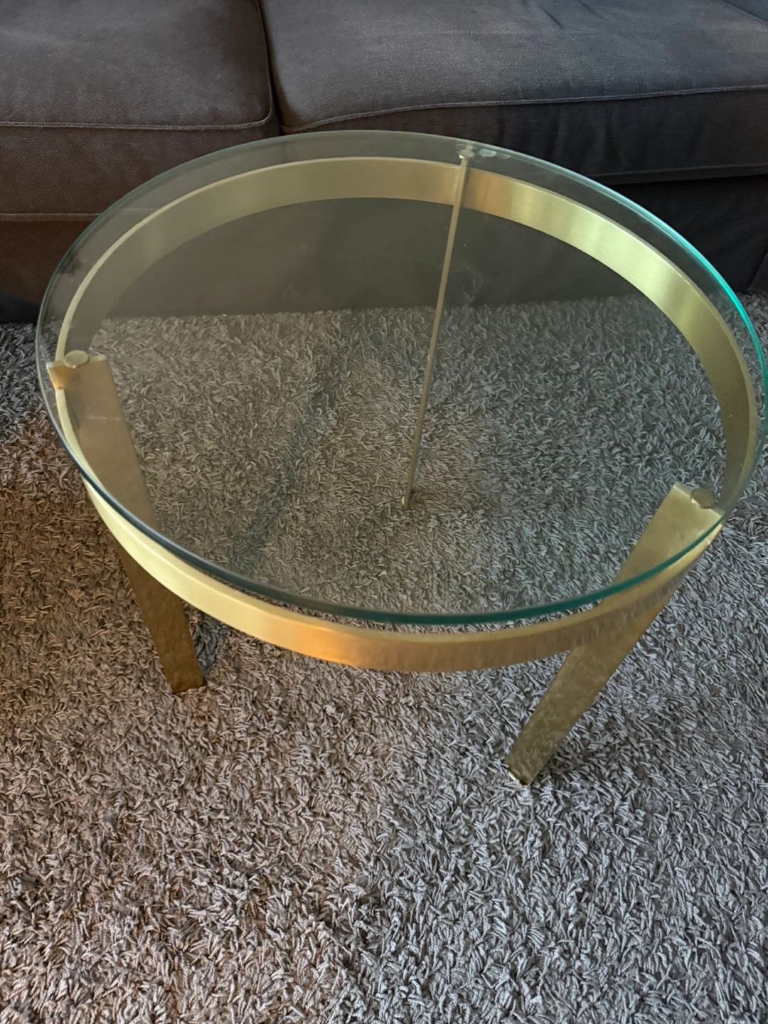 Selling a stylish round coffee table with a glass top and gold-tone metal frame. It's approximately 21 inches in diameter and would make a great addition to any living room!