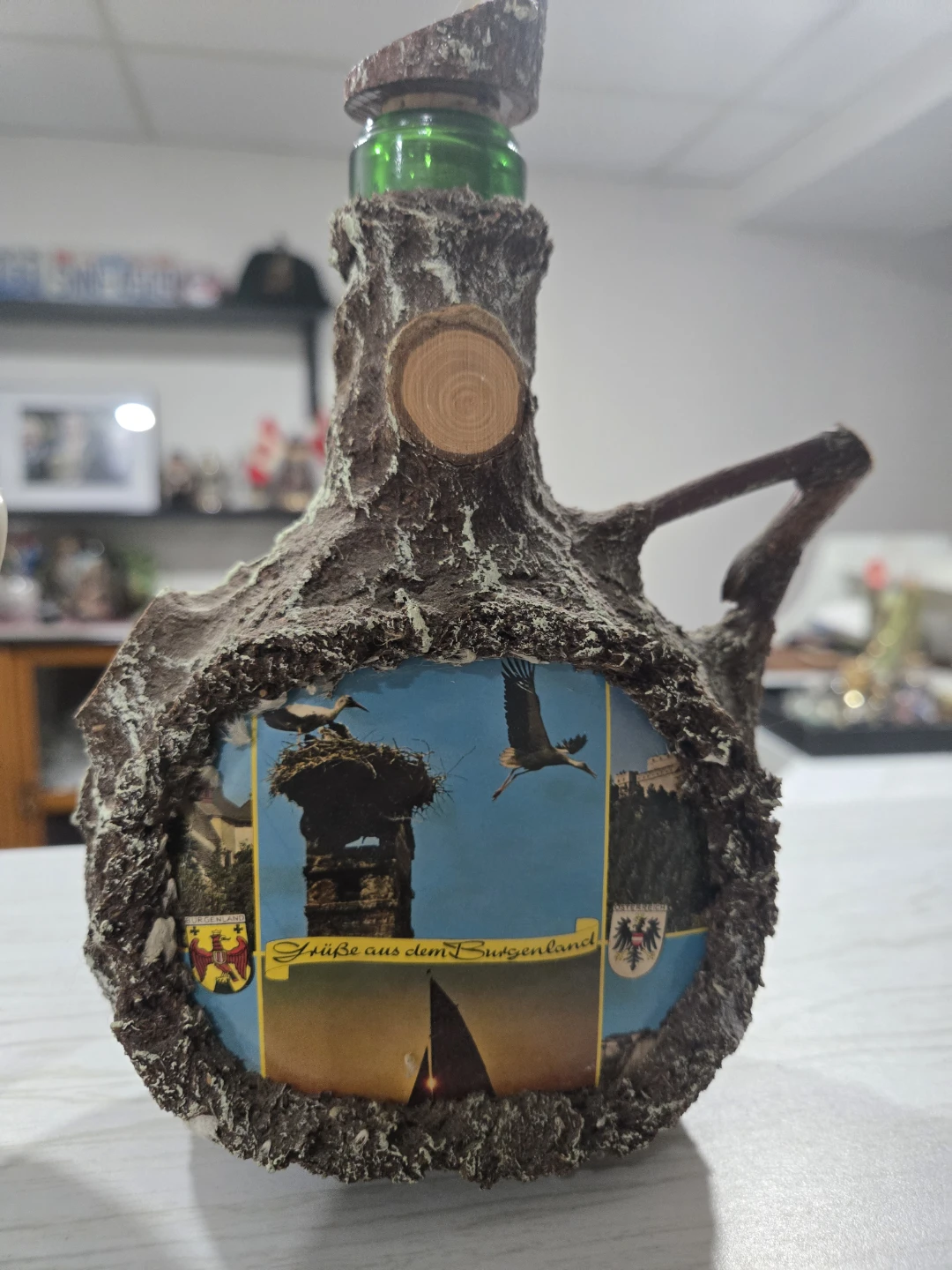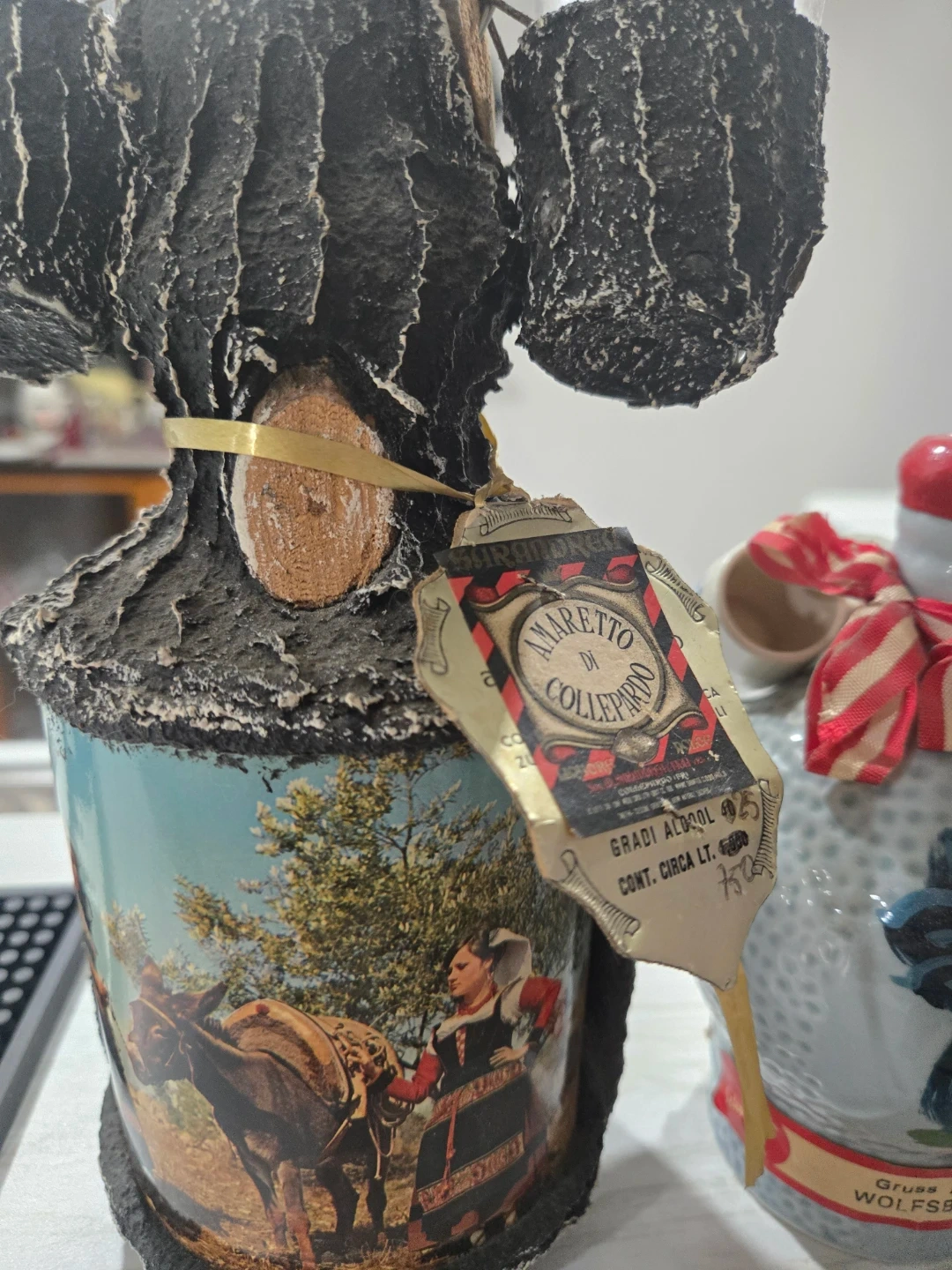 Unique Amaretto di Colleparo liquor bottle with a decorative design. The bottle has a distinctive bark-like texture and a label with the brand name. It's a great piece for collectors or as a decorative item for your home bar