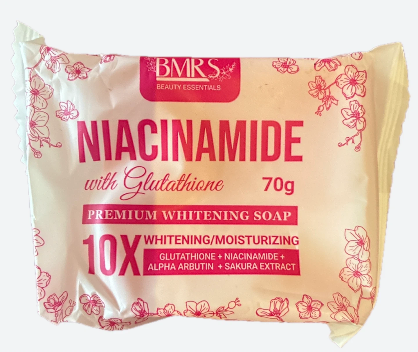 BMRS Beauty Essentials Niacinamide soap with Glutathione. This premium whitening soap is 70g and contains Glutathione, Niacinamide, Alpha Arbutin, and Sakura Extract. It's designed to be 10x whitening and moisturizing!