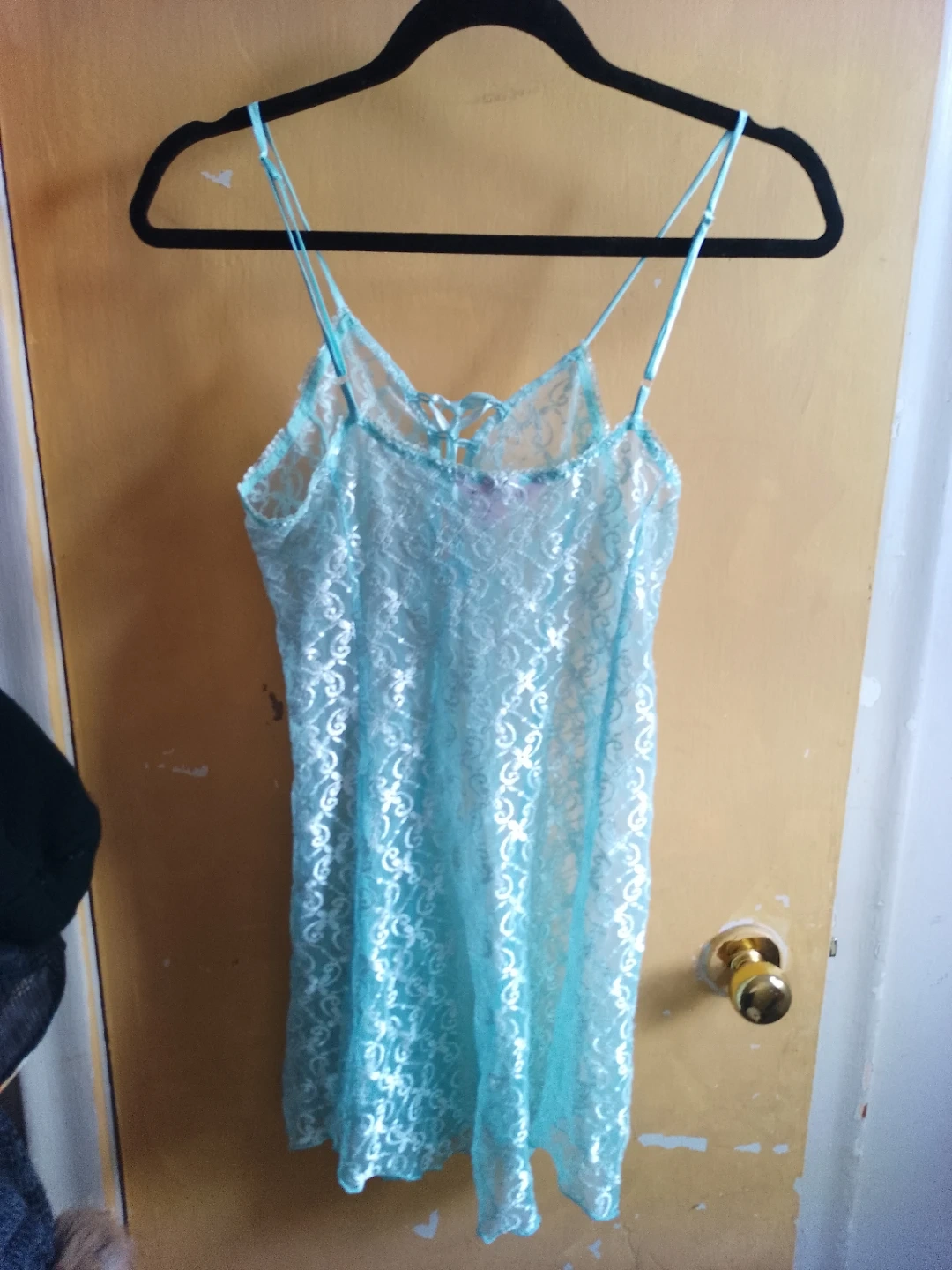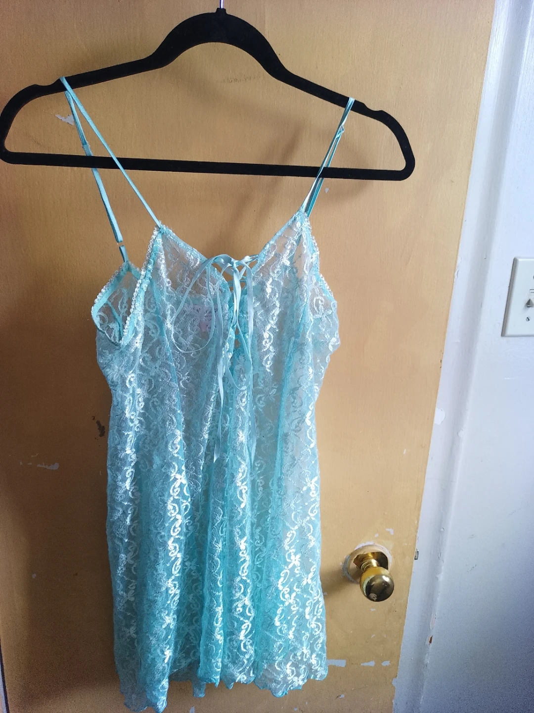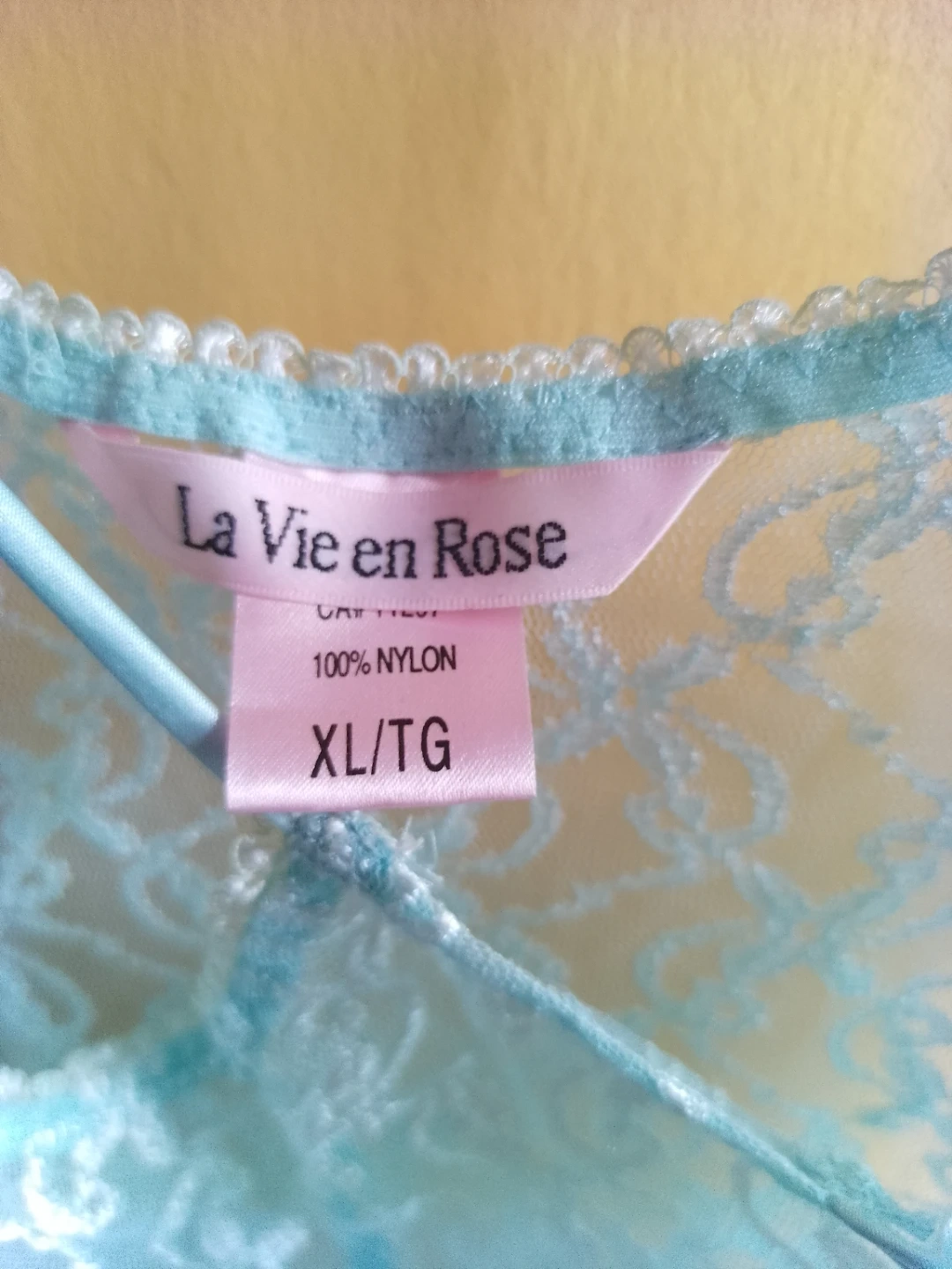 Here's a pretty La Vie en Rose slip dress! It's a lovely light blue colour with a delicate lace pattern. The size is XL, and it's made of 100% nylon. Perfect for lounging or as a nightgown!