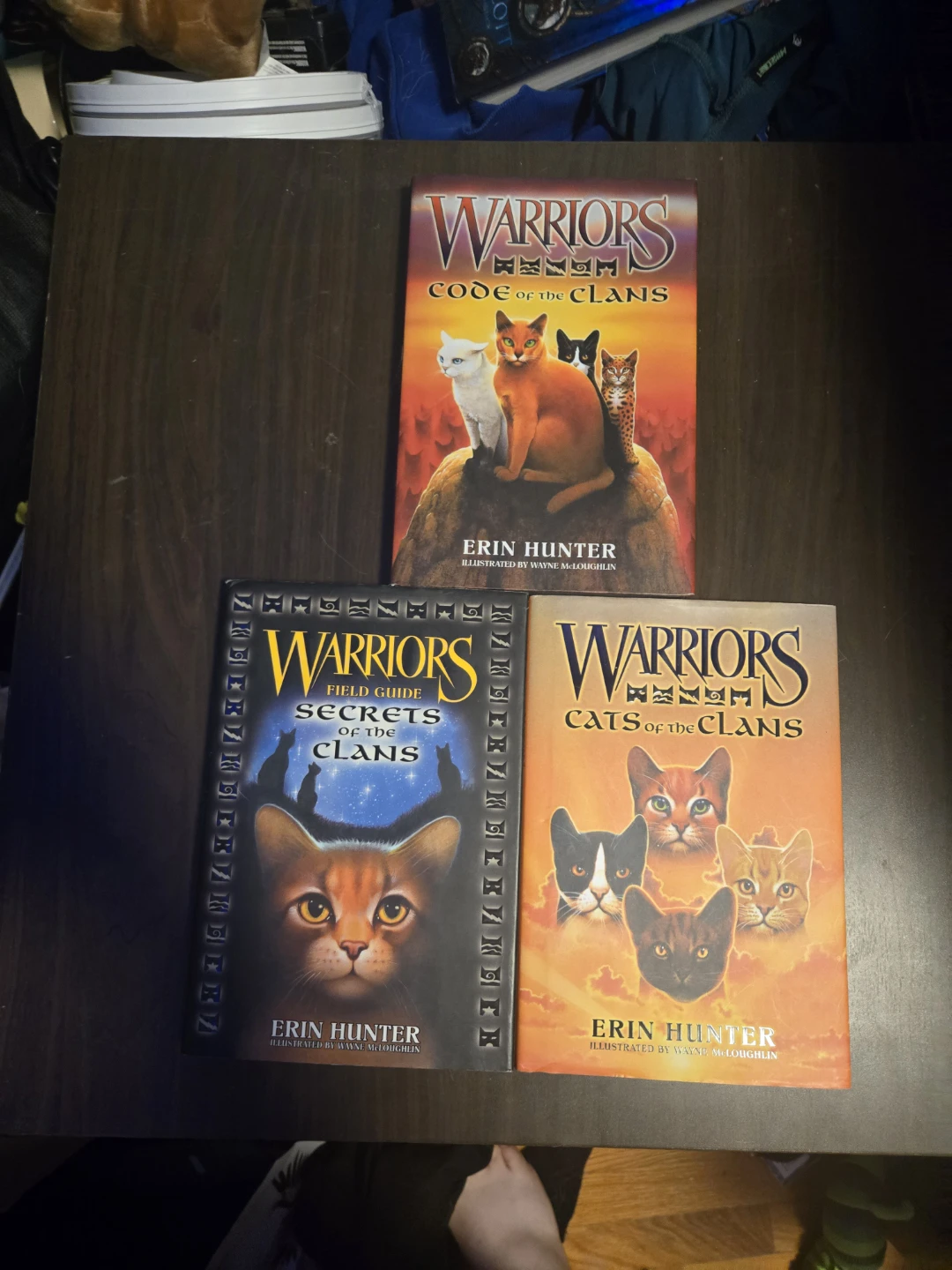Selling three Warriors field guide books by Erin Hunter: Cats of the Clans, Code of the Clans, and Secrets of the Clans. All hardcover in basically new condition