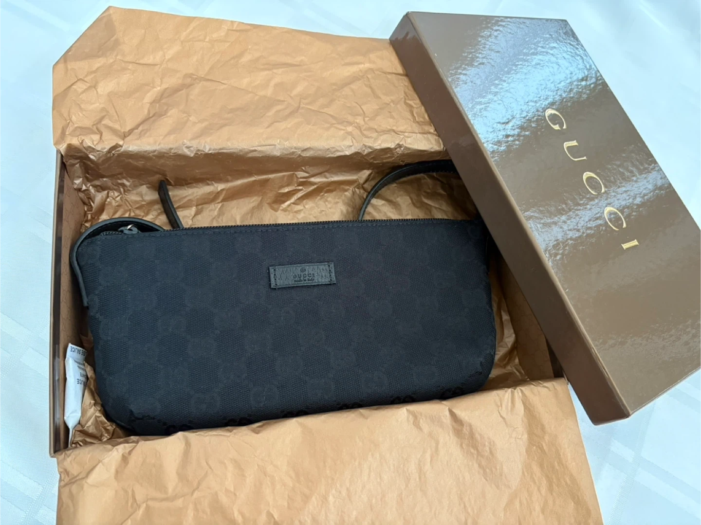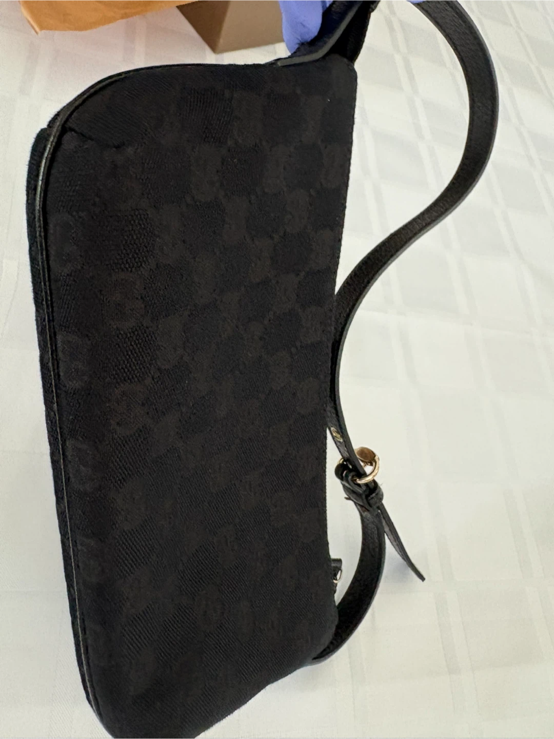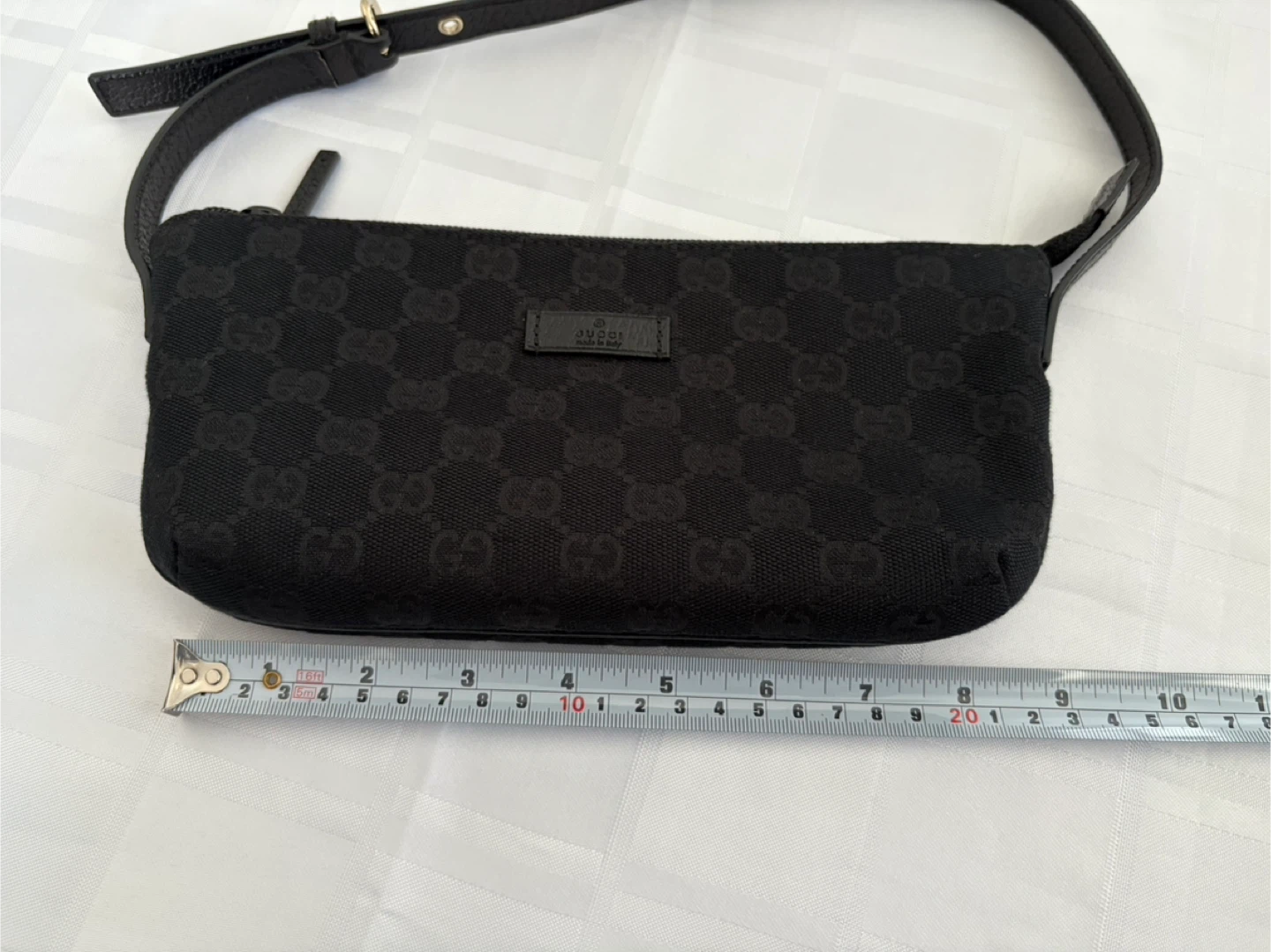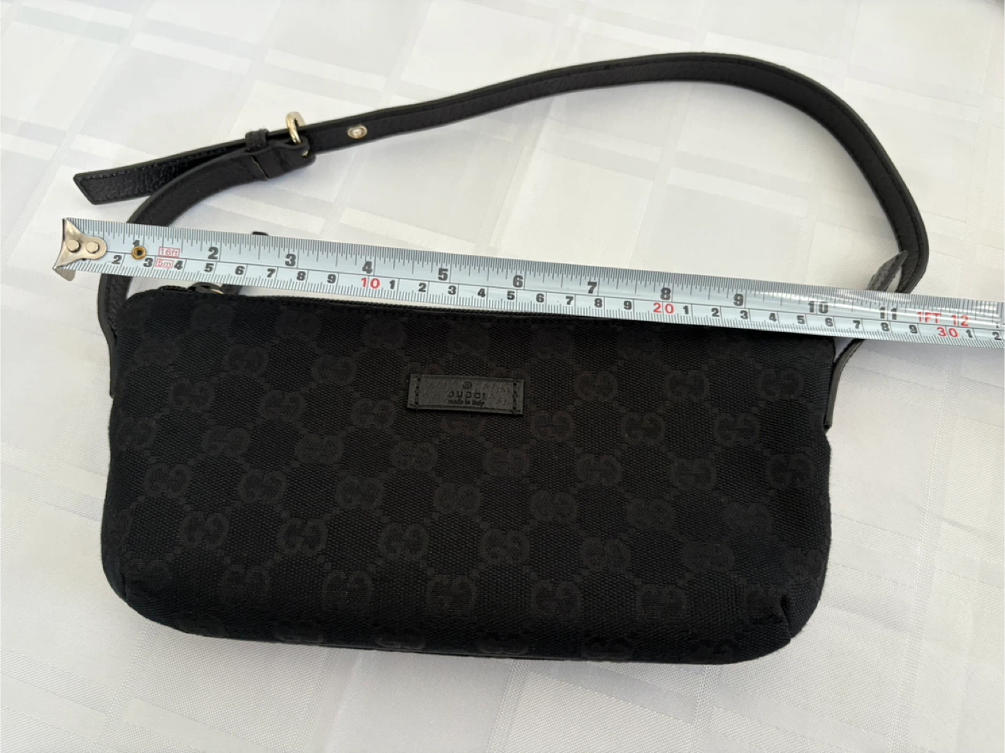 Selling a cute Gucci shoulder bag with the classic GG monogram. It's black canvas with a leather strap and comes with the original box! The bag measures approximately 10 inches in length.